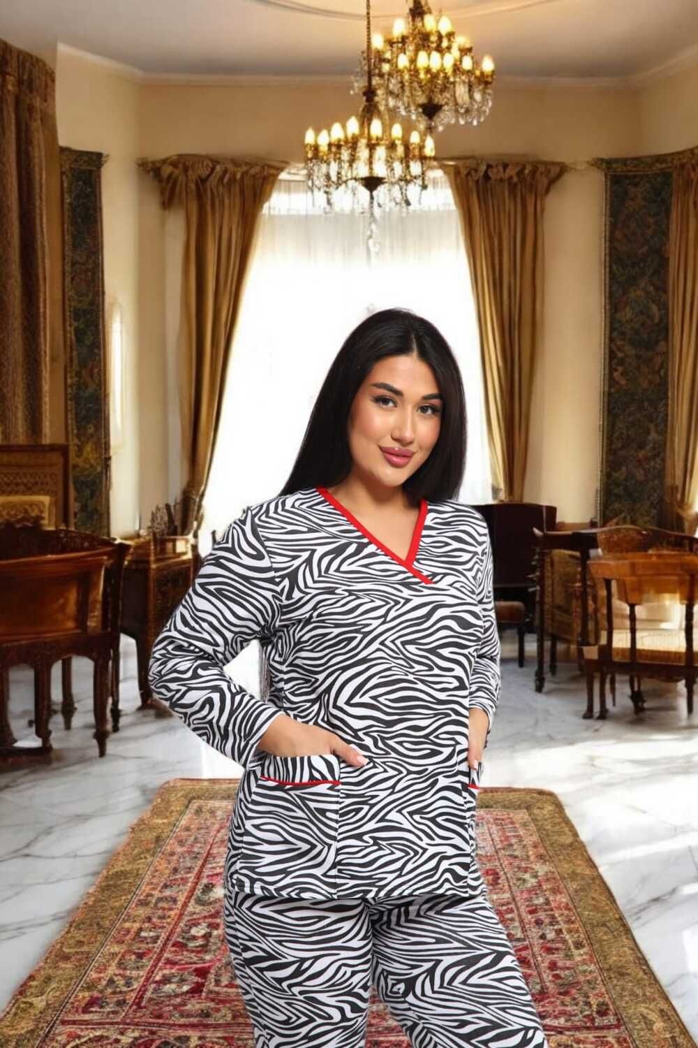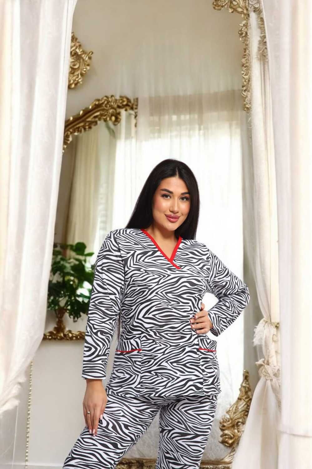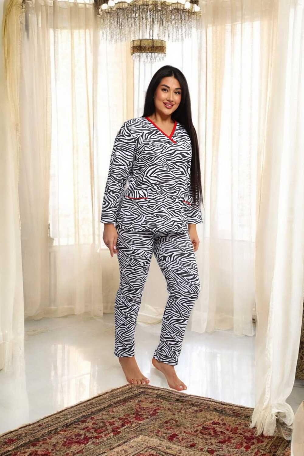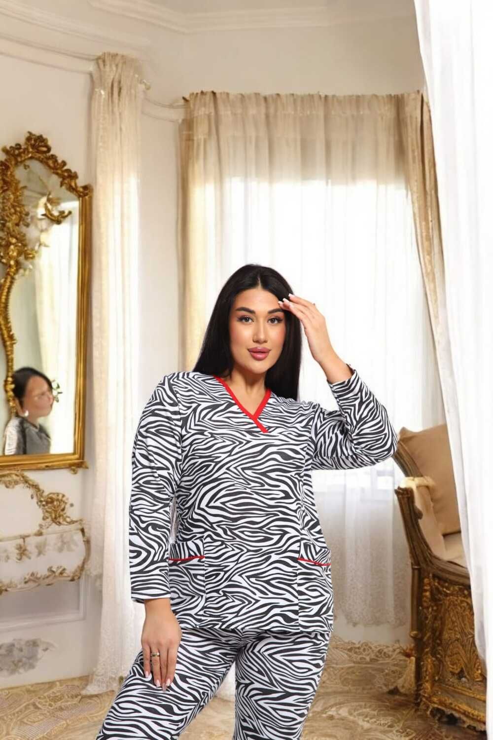Стильный комплект с принтом «зебра» сочетает в себе комфорт и модный дизайн. Черно-белый узор придает образу динамичность, а контрастная красная окантовка V-образного выреза добавляет изюминку. Верх оснащен функциональными карманами, а удобный крой брюк обеспечивает комфорт в течение всего дня.