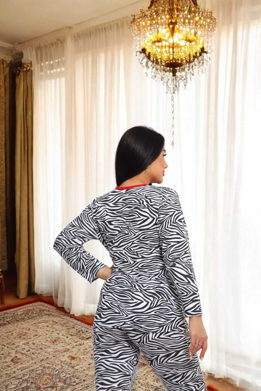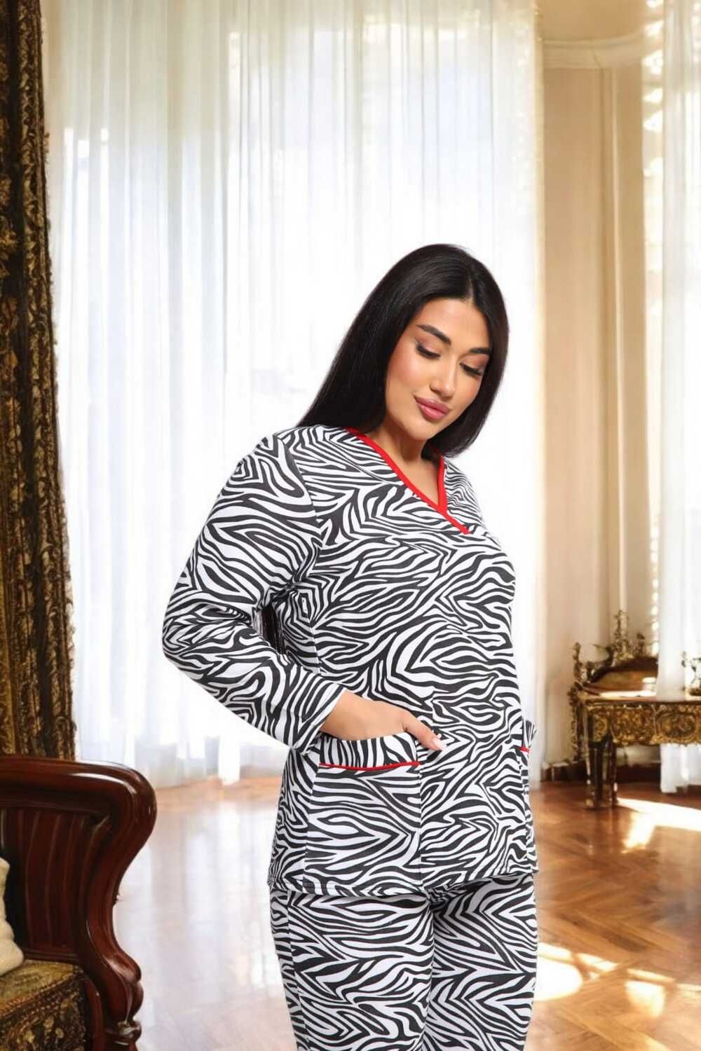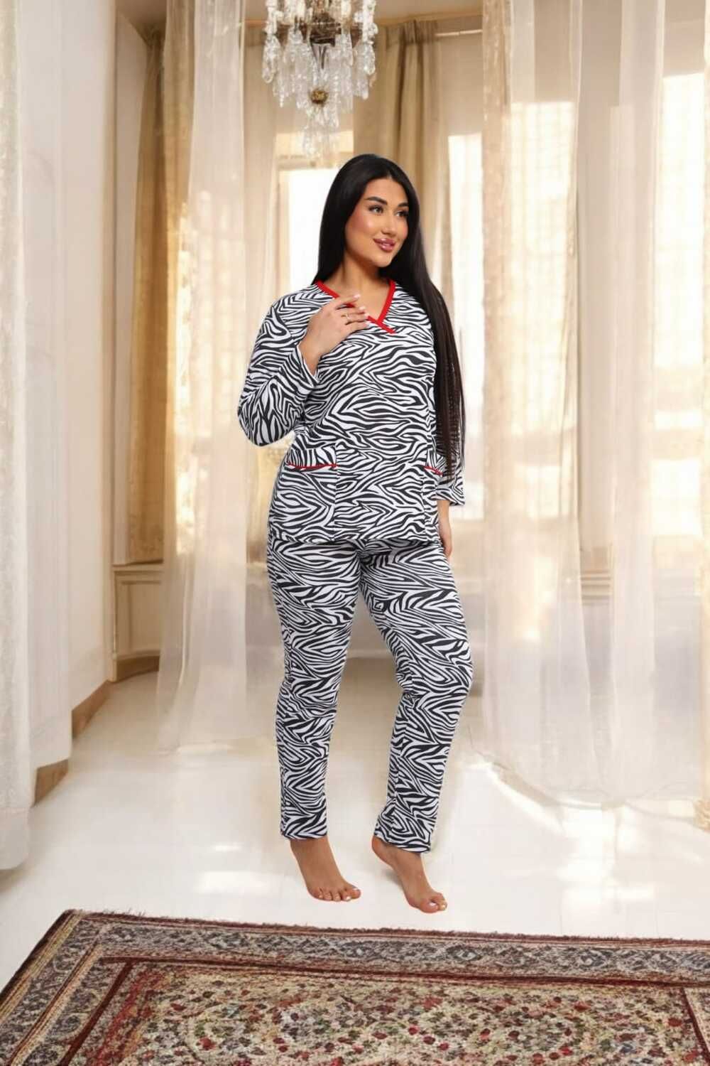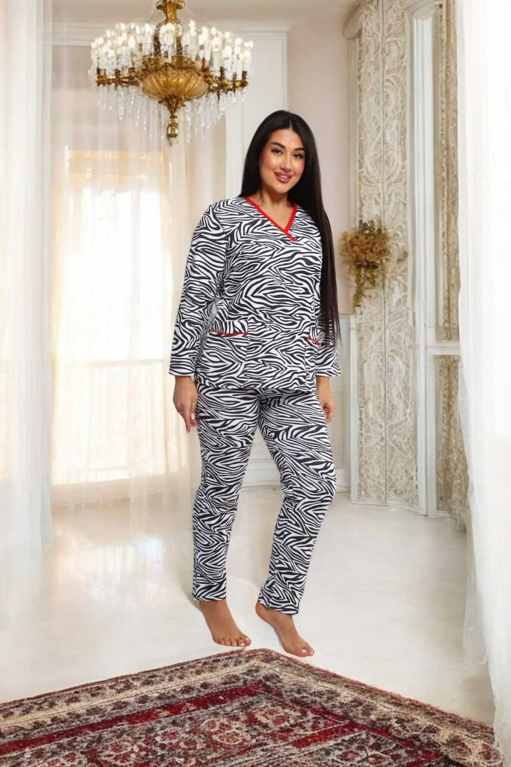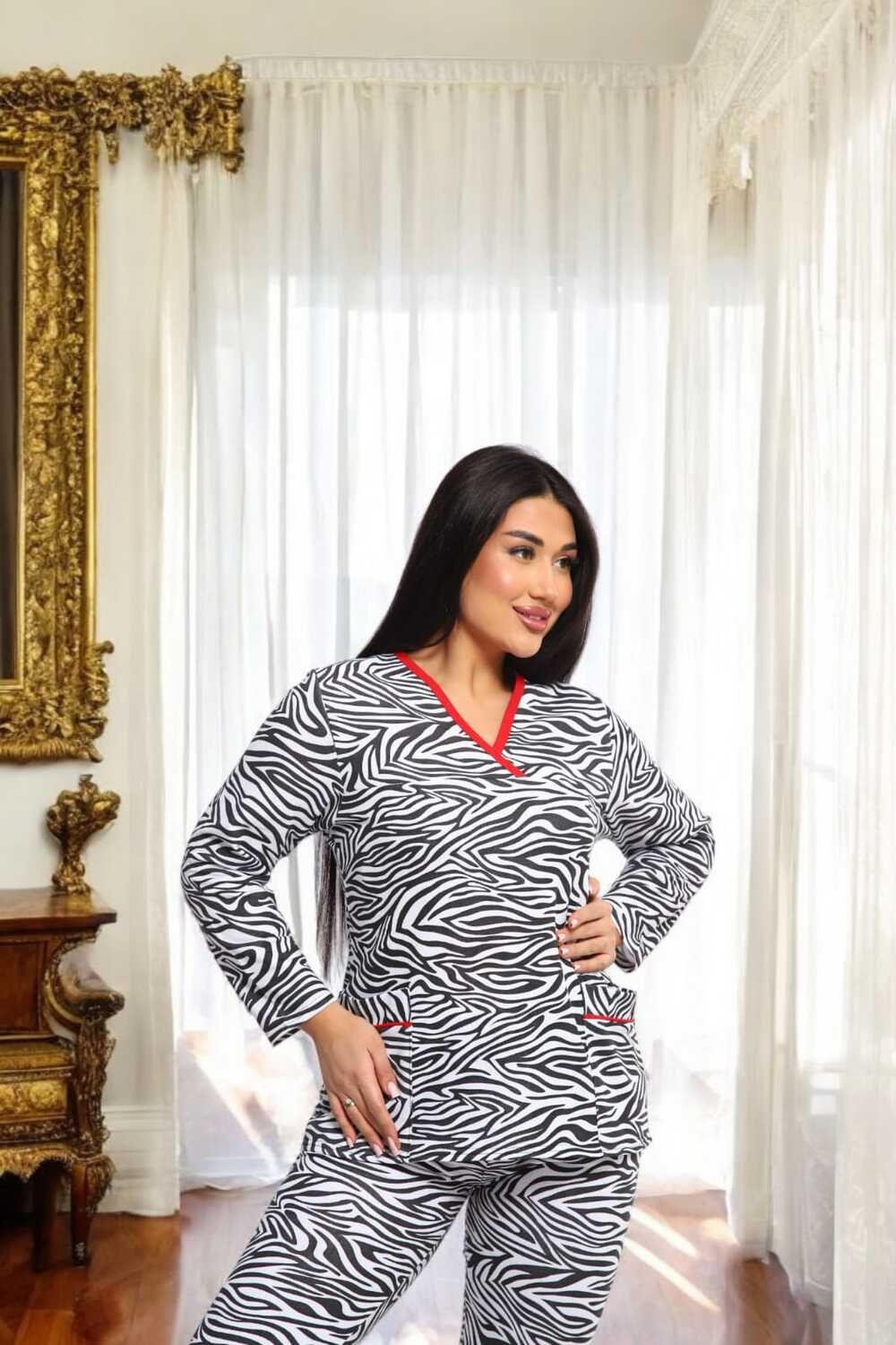 Стильный комплект с принтом «зебра» сочетает в себе комфорт и модный дизайн. Черно-белый узор придает образу динамичность, а контрастная красная окантовка V-образного выреза добавляет изюминку. Верх оснащен функциональными карманами, а удобный крой брюк обеспечивает комфорт в течение всего дня.