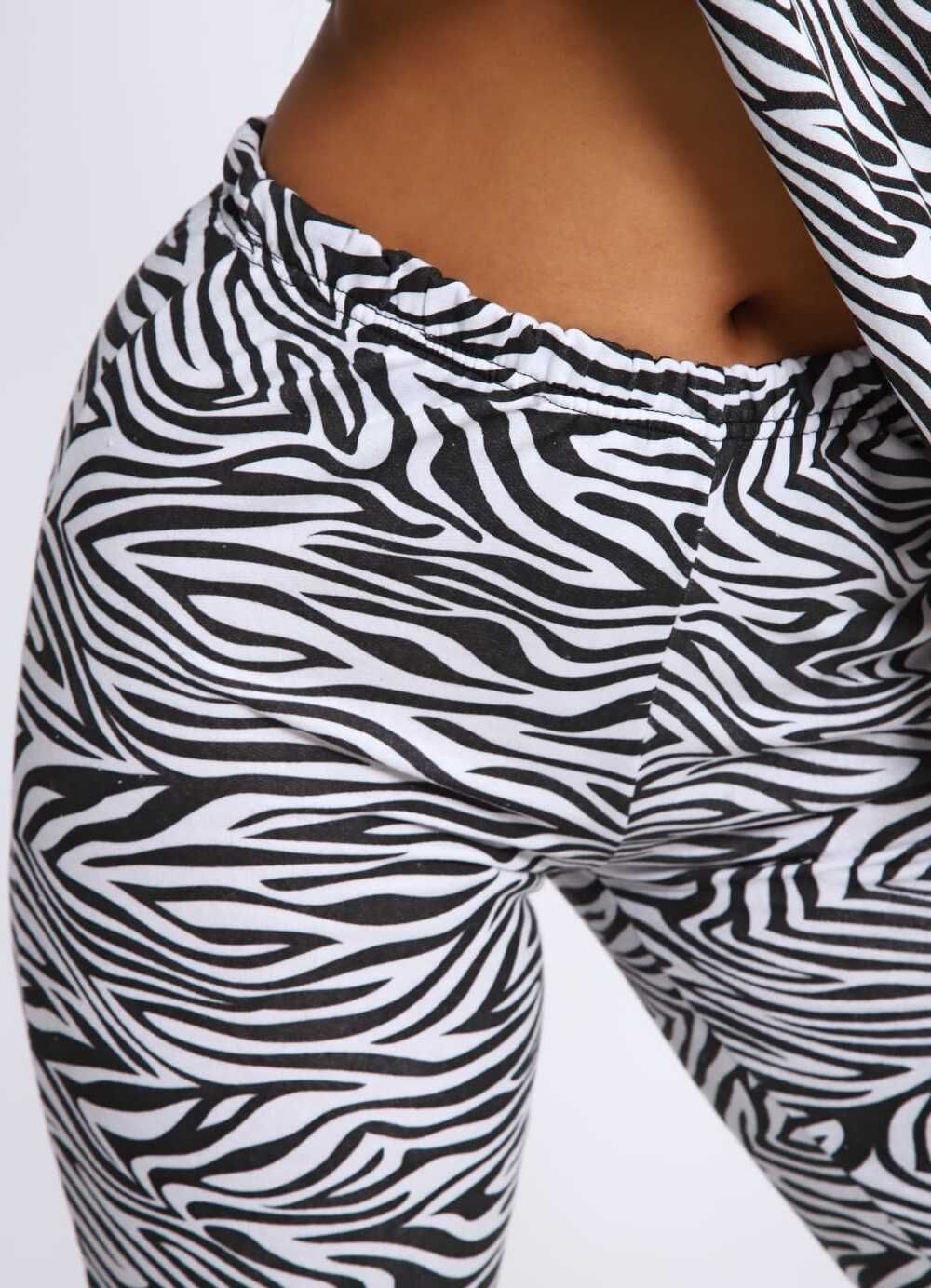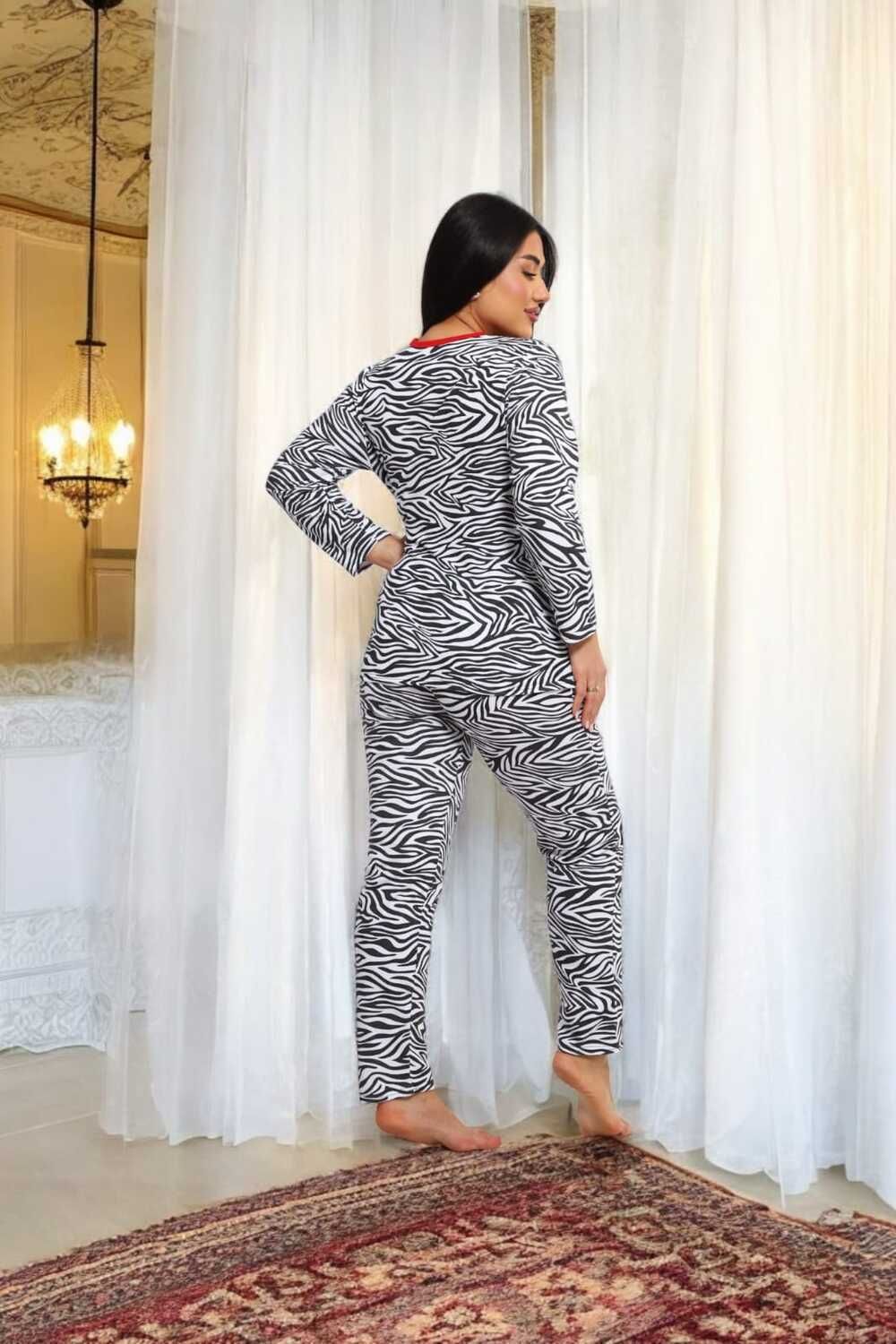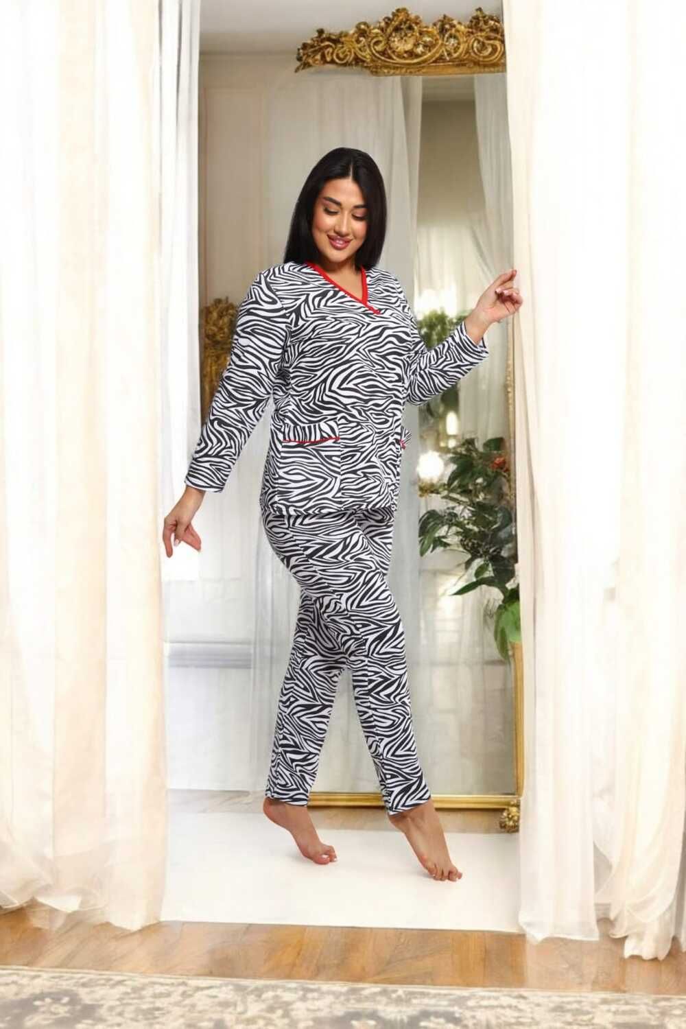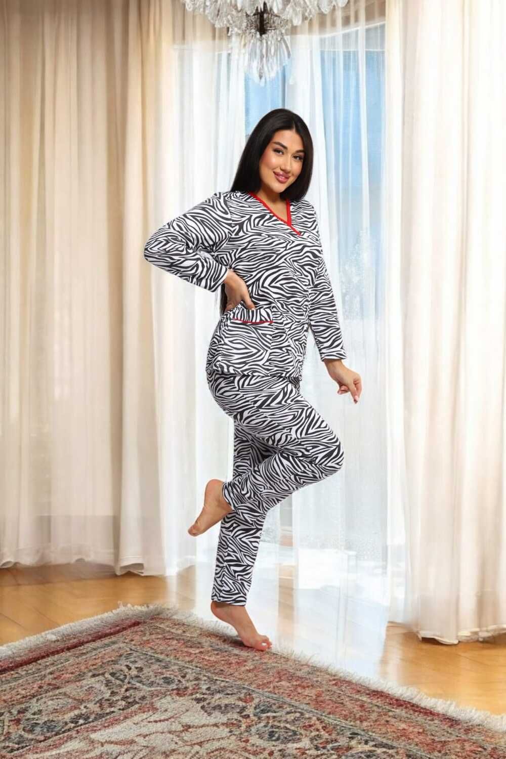 Стильный комплект с принтом «зебра» сочетает в себе комфорт и модный дизайн. Черно-белый узор придает образу динамичность, а контрастная красная окантовка V-образного выреза добавляет изюминку. Верх оснащен функциональными карманами, а удобный крой брюк обеспечивает комфорт в течение всего дня.
