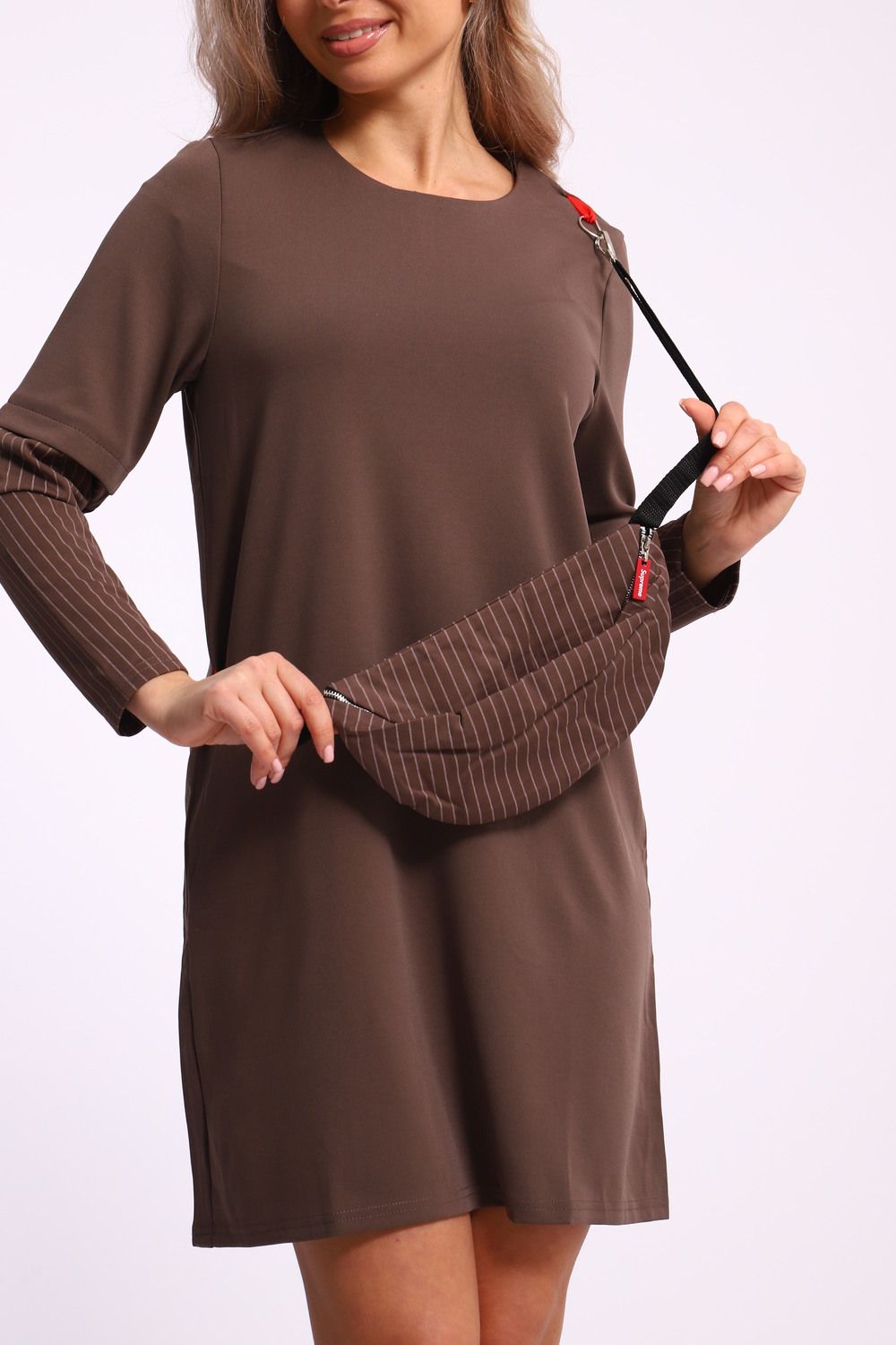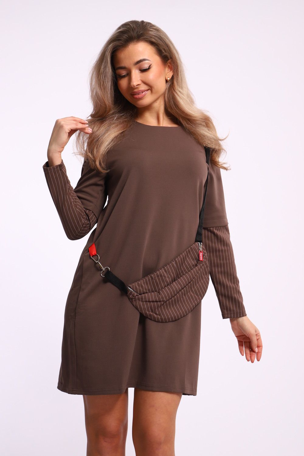 Это платье является воплощением современного стиля и комфорта. Свободный крой и спущенные рукава подходят для создания как повседневного, так и вечернего образа. Сочетание полосок и модного аксессуара в виде сумочки делает ваш наряд уникальным и привлекающим внимание.