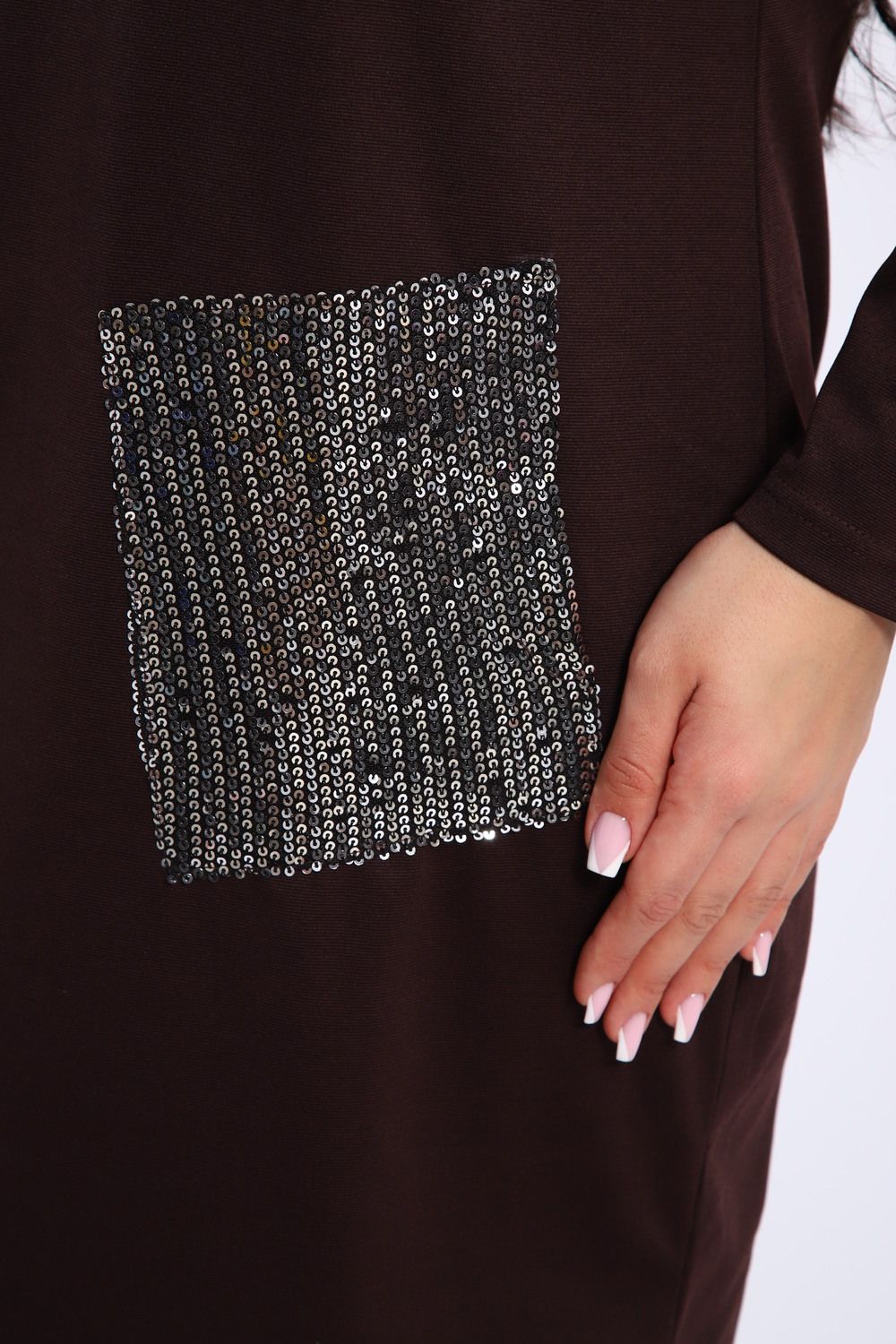 Декорированный карман: На полочке платья располагается эффектный карман, украшенный пайетками, добавляющий образу немного шика и блеска. Эта деталь не только функциональна, но и акцентирует внимание на оригинальном дизайне платья.