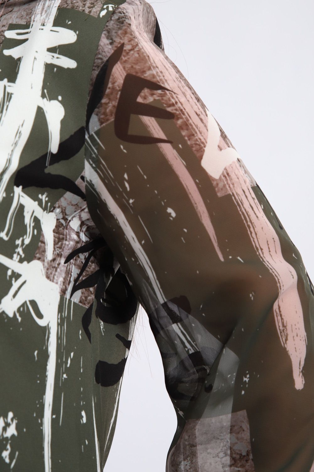 Рукава полной длины заканчиваются узкими манжетами с рукавом, добавляя образу изысканности и женственности. Эта деталь акцентирует внимание на запястьях, делая их более утонченными.