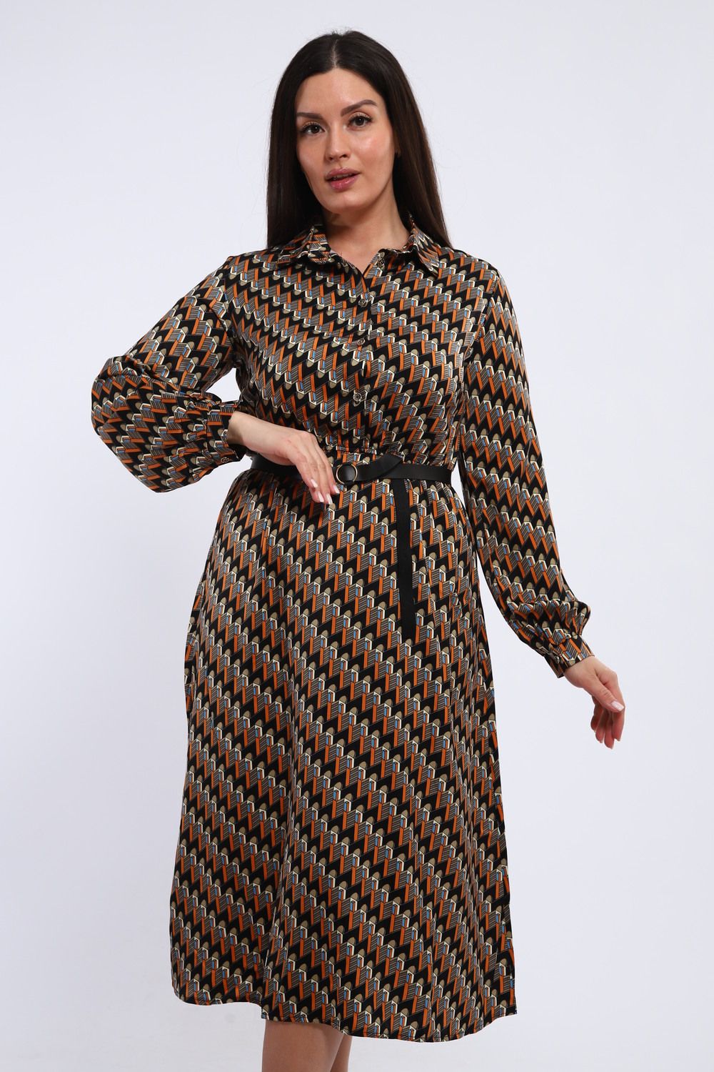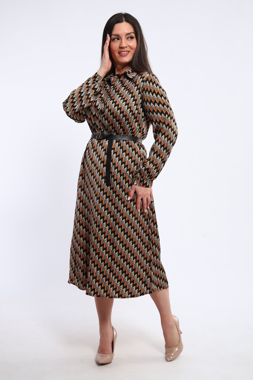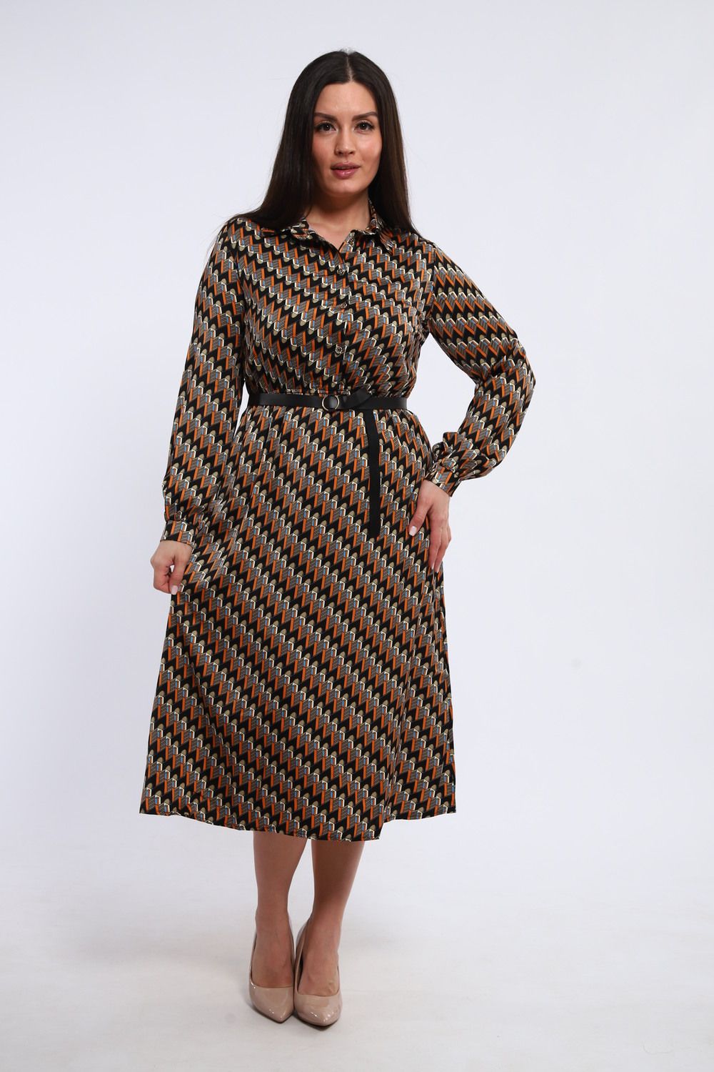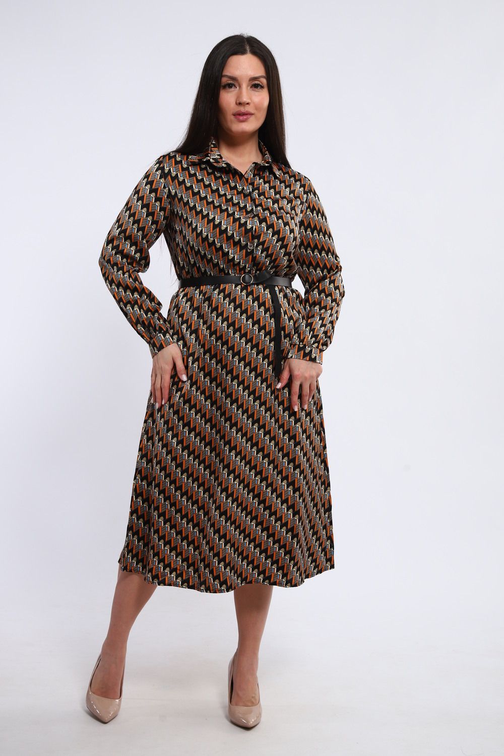 Изящное женское платье, отрезное по талии, сочетает в себе классический силуэт и современные детали. Рубашечный воротник придает образу строгость и элегантность, а длинные рукава, завершающиеся манжетами, подчеркивают изящность запястий. Платье идеально садится по фигуре, акцентируя внимание на талии и создавая женственный силуэт.