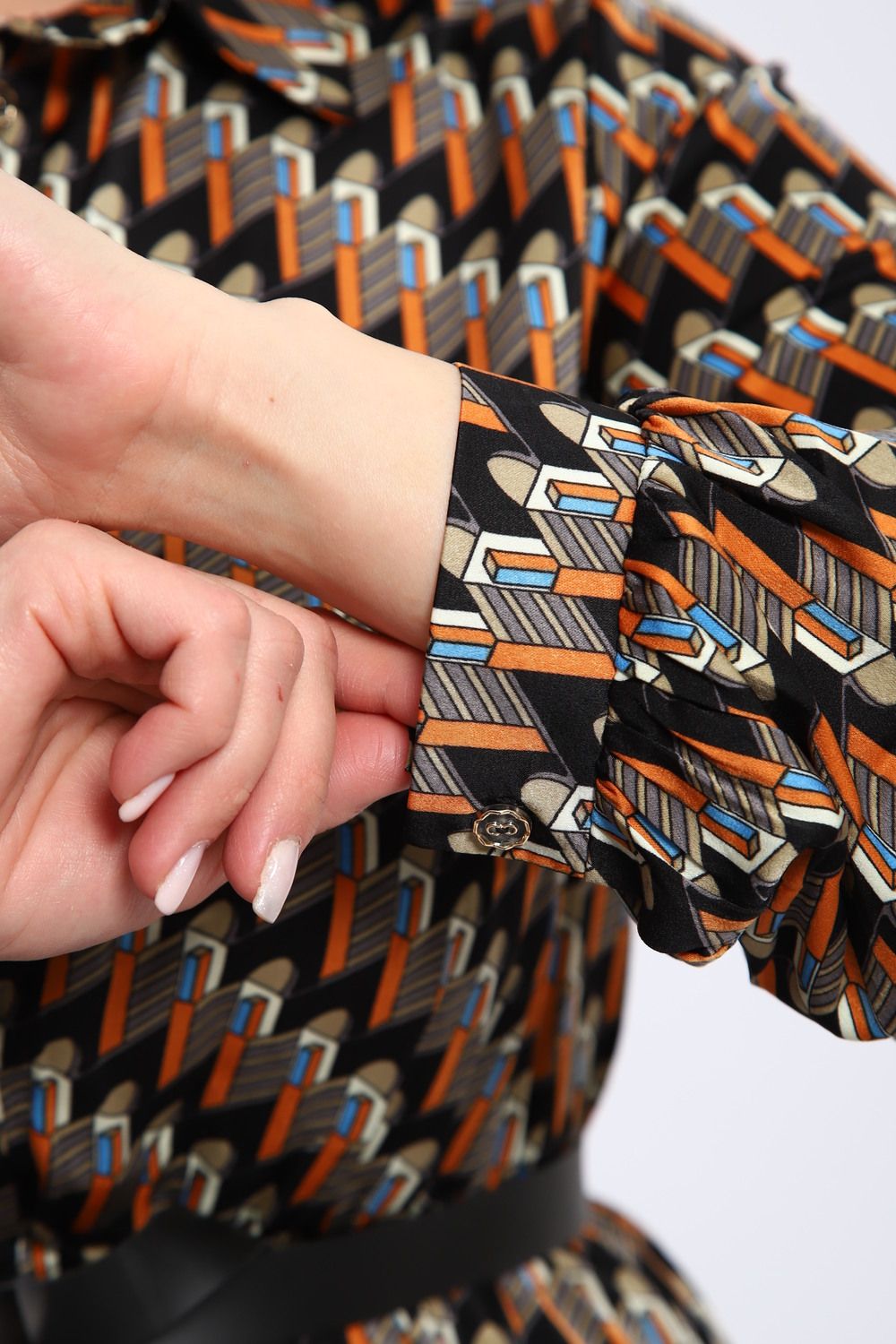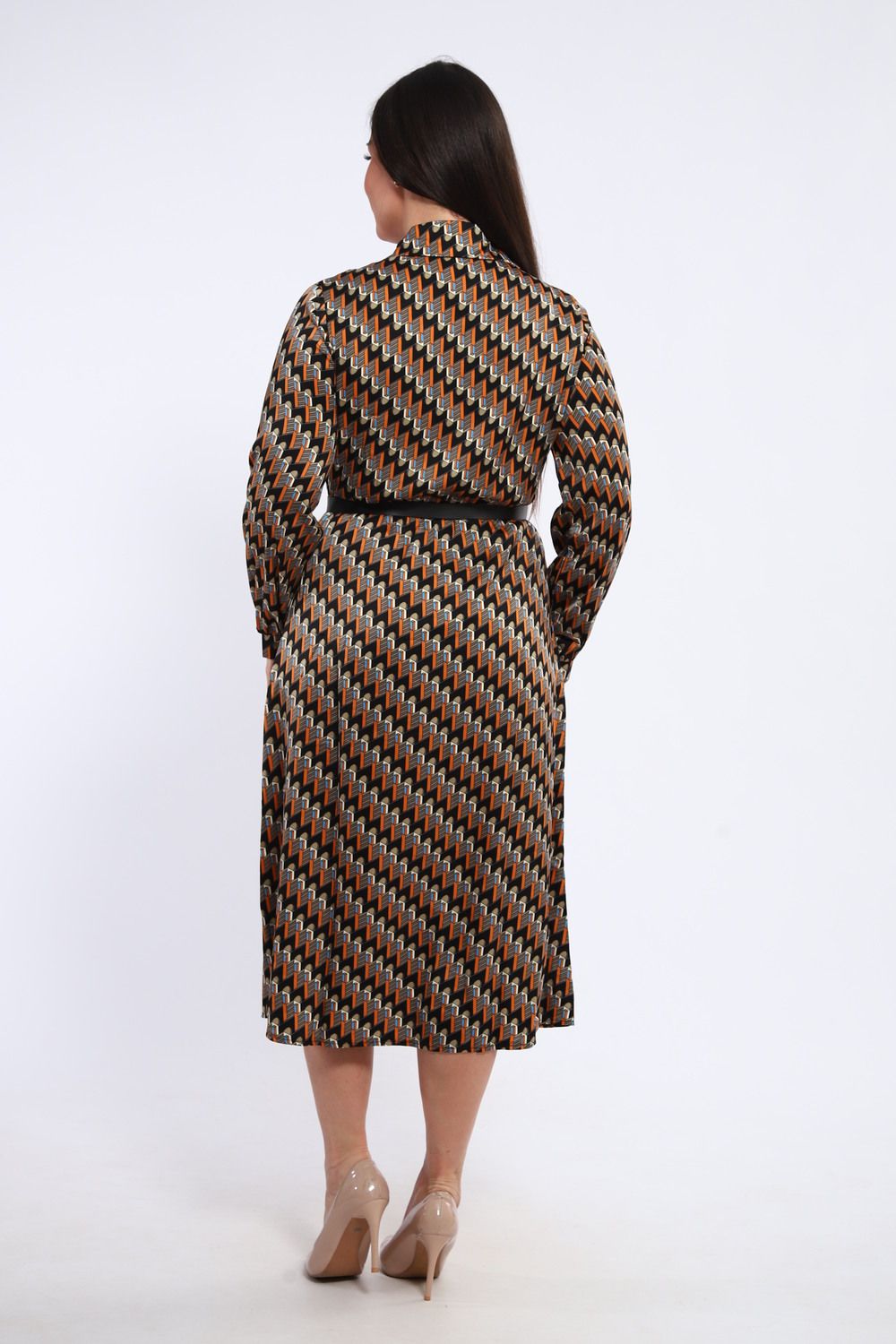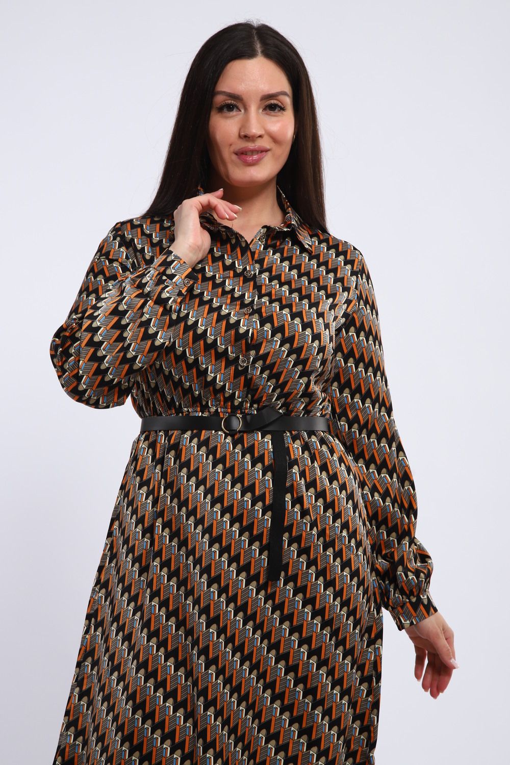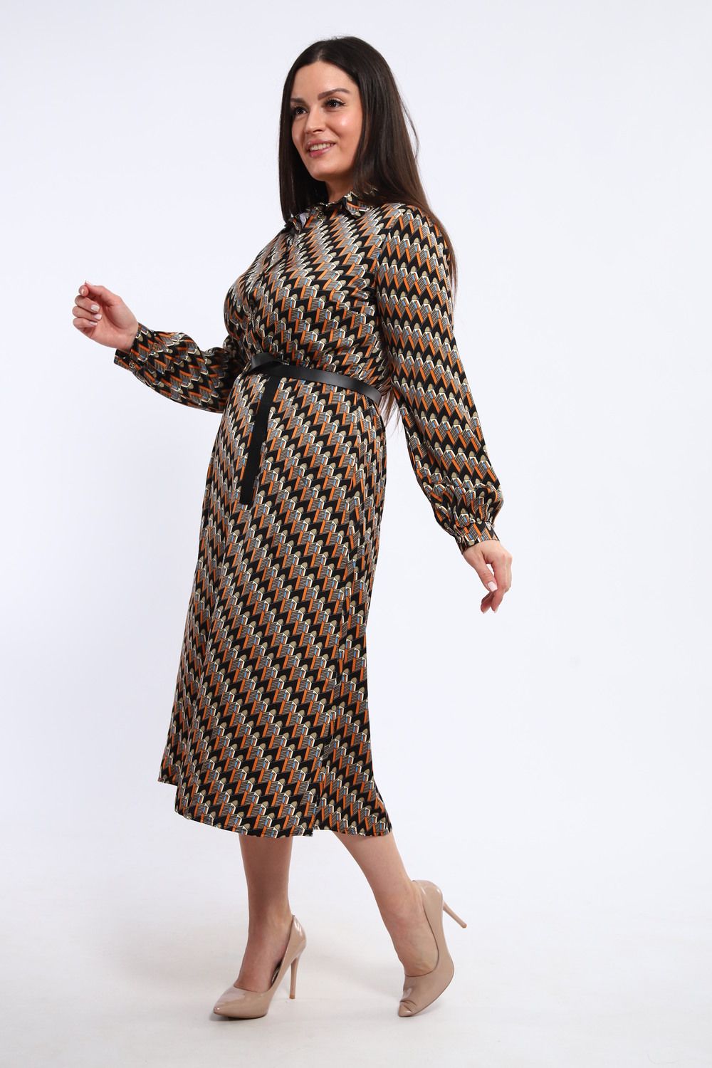 Изящное женское платье, отрезное по талии, сочетает в себе классический силуэт и современные детали. Рубашечный воротник придает образу строгость и элегантность, а длинные рукава, завершающиеся манжетами, подчеркивают изящность запястий. Платье идеально садится по фигуре, акцентируя внимание на талии и создавая женственный силуэт.