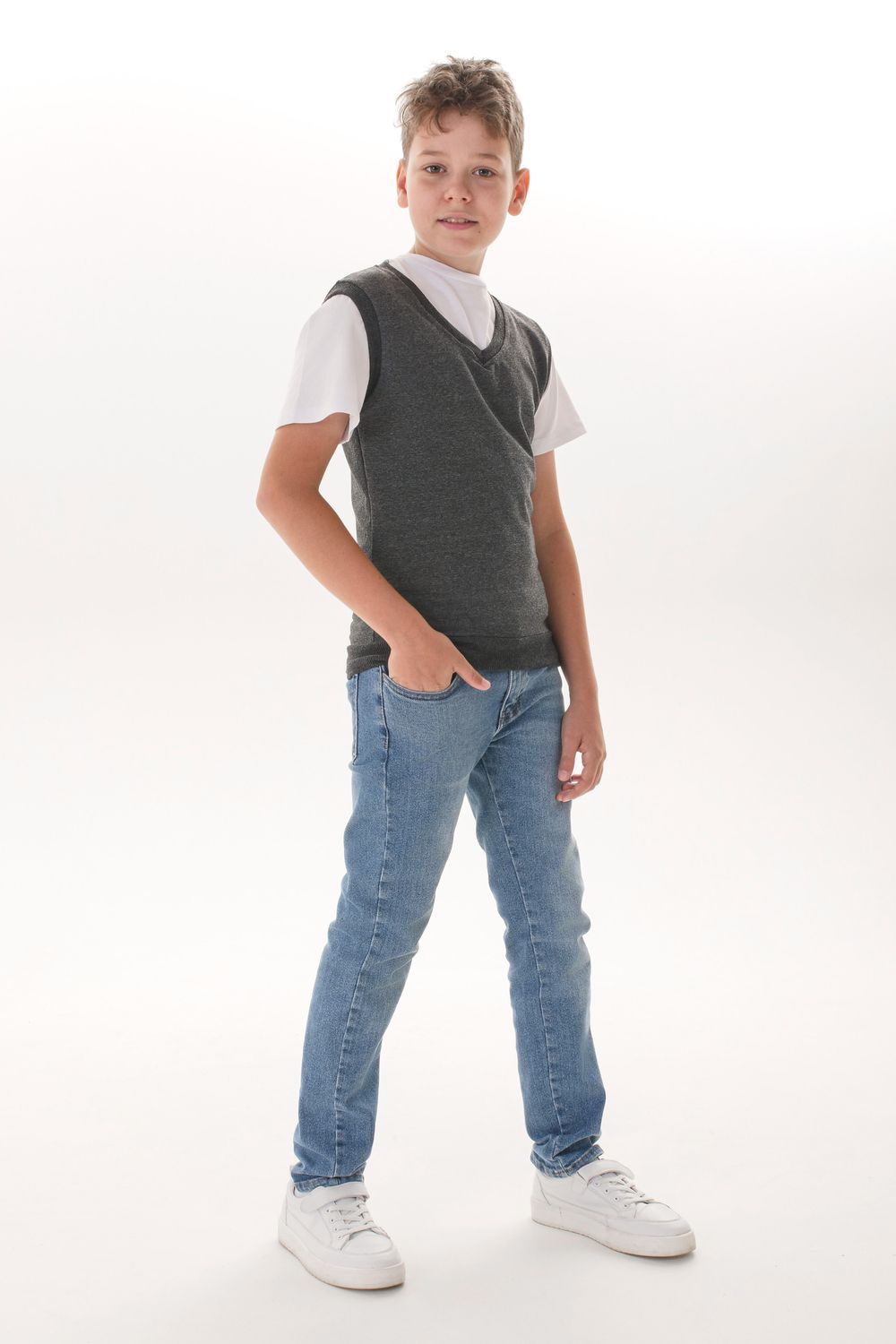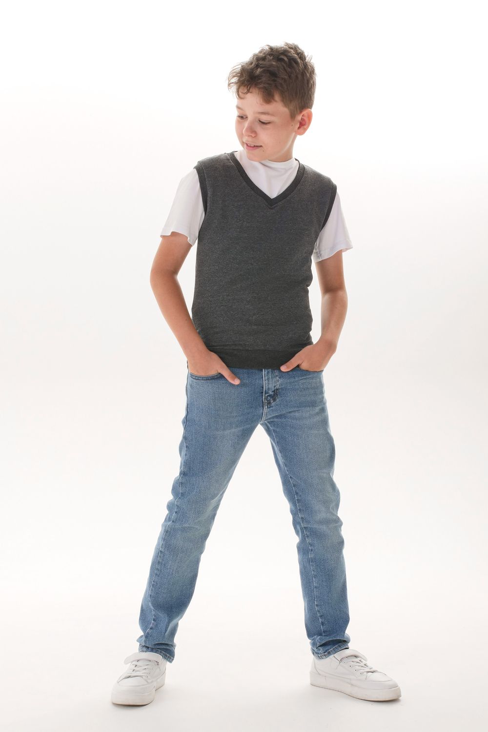 Классический жилет - универсальный предмет гардероба как для мальчика, так и для девочки. Он подойдет для множества школьных, а так же повседневных образов в стиле casual. Удачно сочетается с брюками и с джинсами, на девочках будет отлично смотреться с юбкой. Наша модель не сковывает движения, позволяя ребенку быть активным. Жилет выполнен из качественной турецкой ткани. Модель прямого силуэта, с V-образным вырезом. Горловина, манжеты и пояс выполнены из кашкорсе.