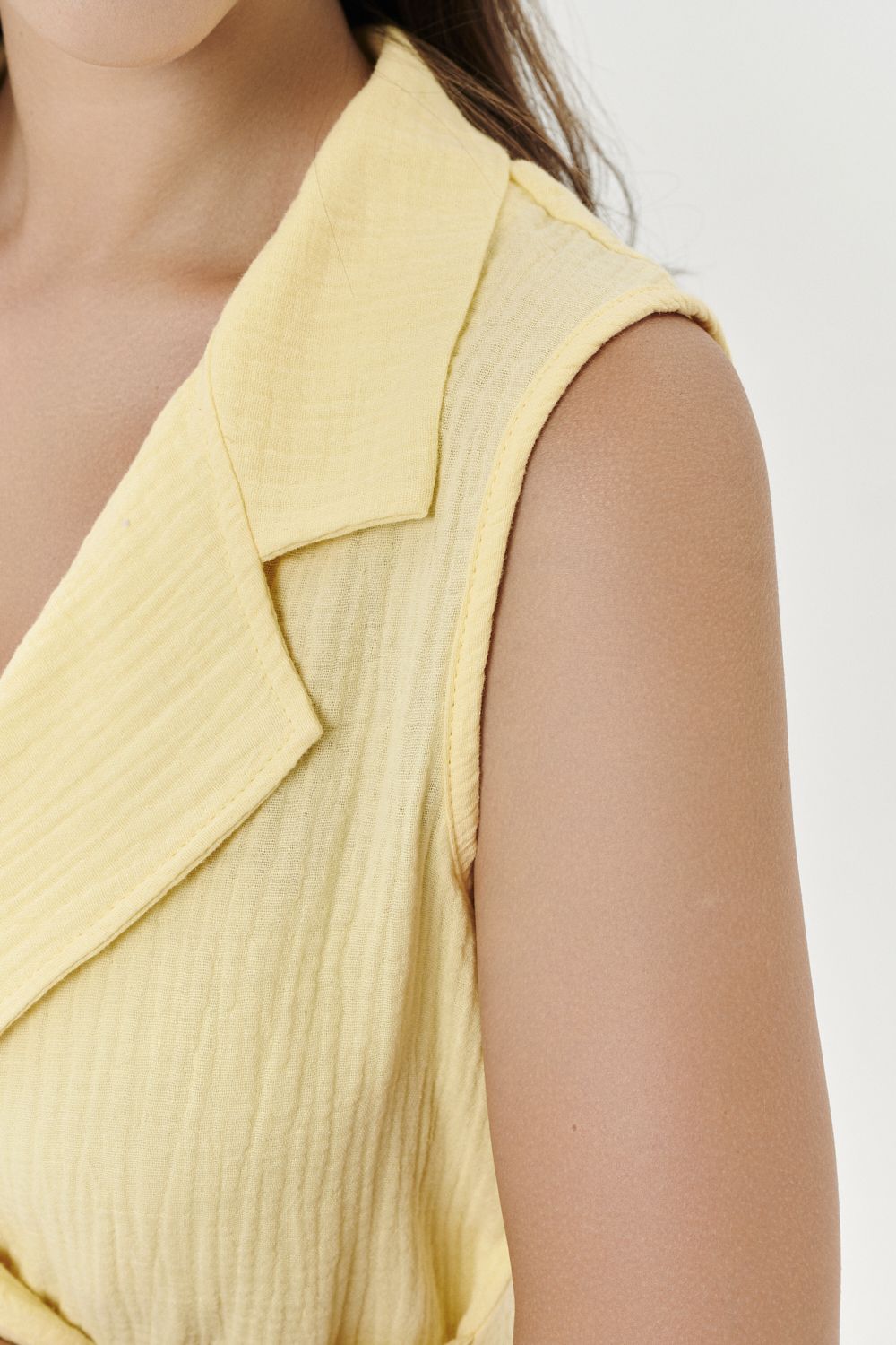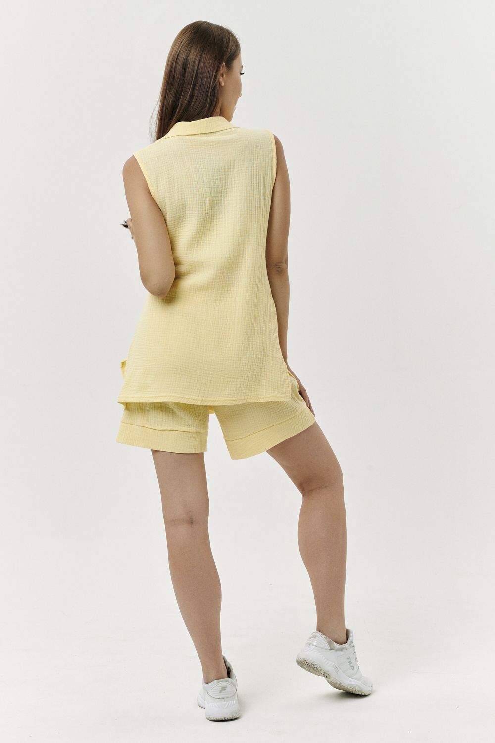 Жилет полуприлегающего силуэта, длиной до середины бедра, с английским воротником. В нижней части боковых швов обработаны разрезы. Застегивание осуществляется с помощью декоративного шнура, продетого через люверсы. Можно составить комплект с шортами 8259