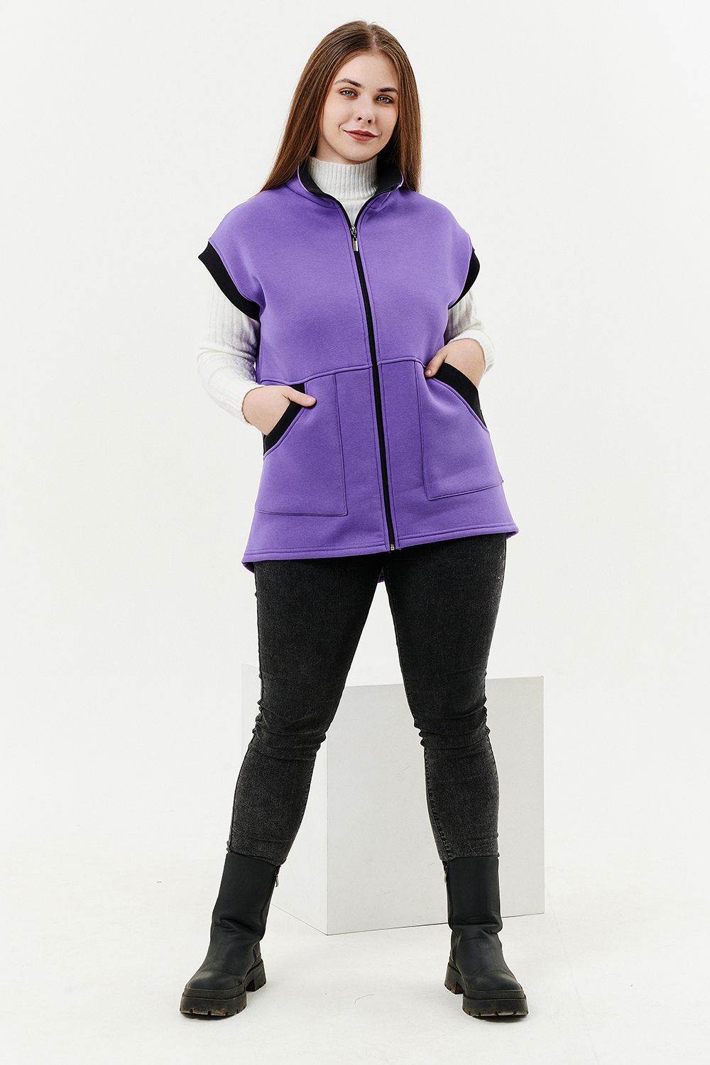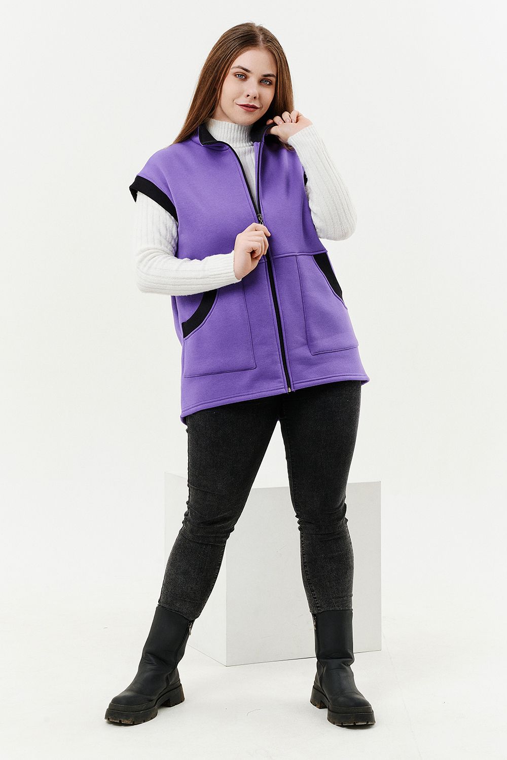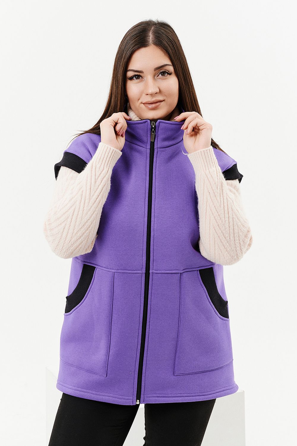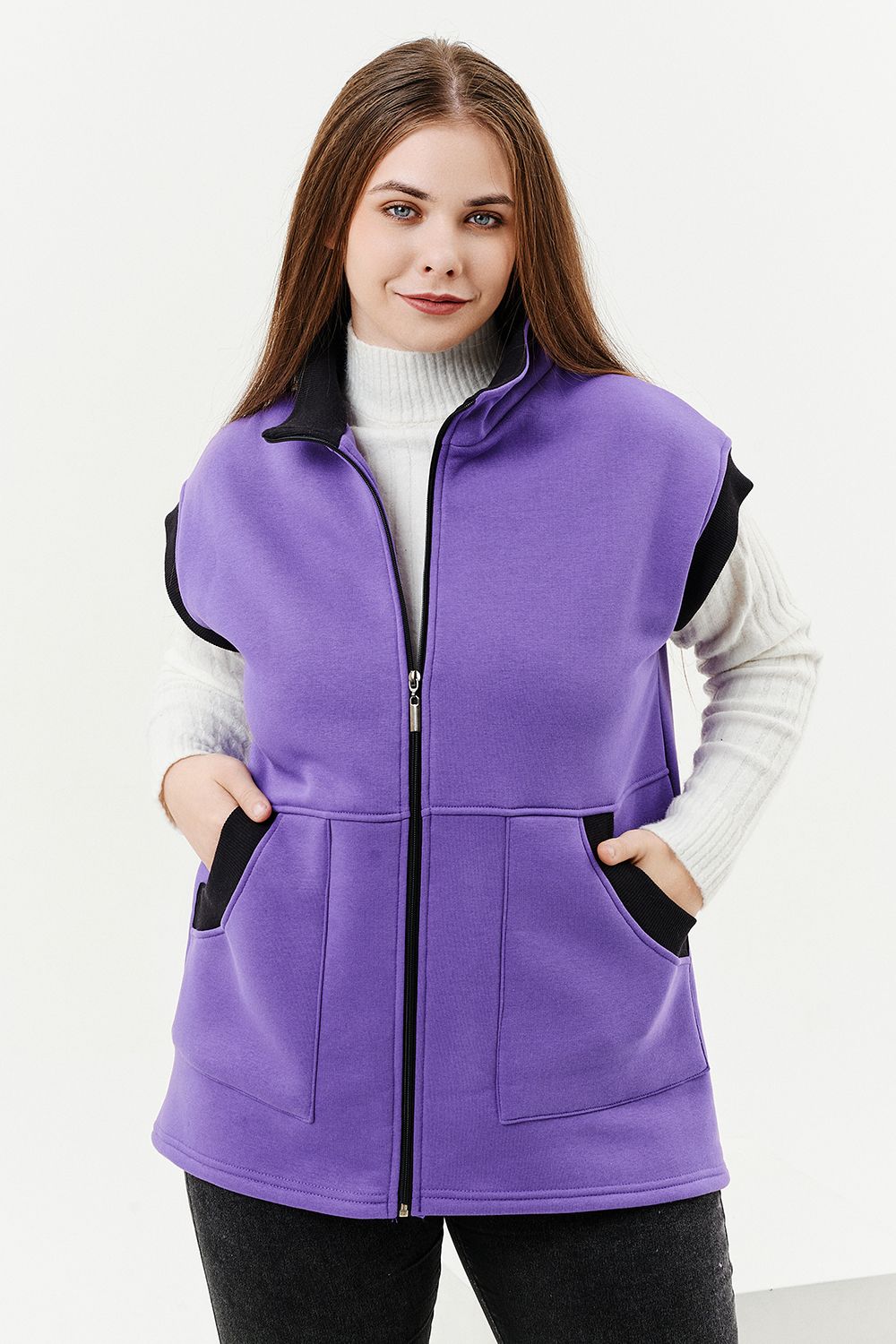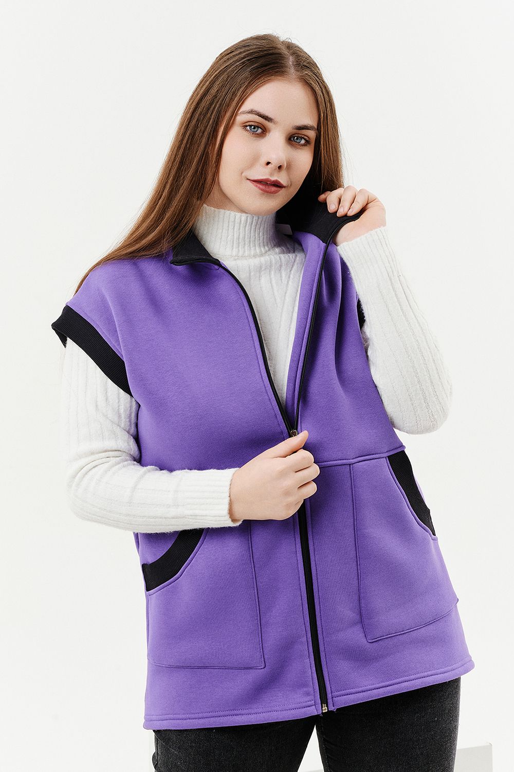 Жилет женский прямого силуэта. Застежка на тесьму - молнию. Воротник - стойка. На полочке два накладных кармана. Обтачки пройм, фигурного входа в карман и нижний воротник из кашкорсе контрастного черного цвета. Спинка немного длиннее полочки. Женщина в этом жилете будет выглядеть стильно и одновременно защищена от холода.