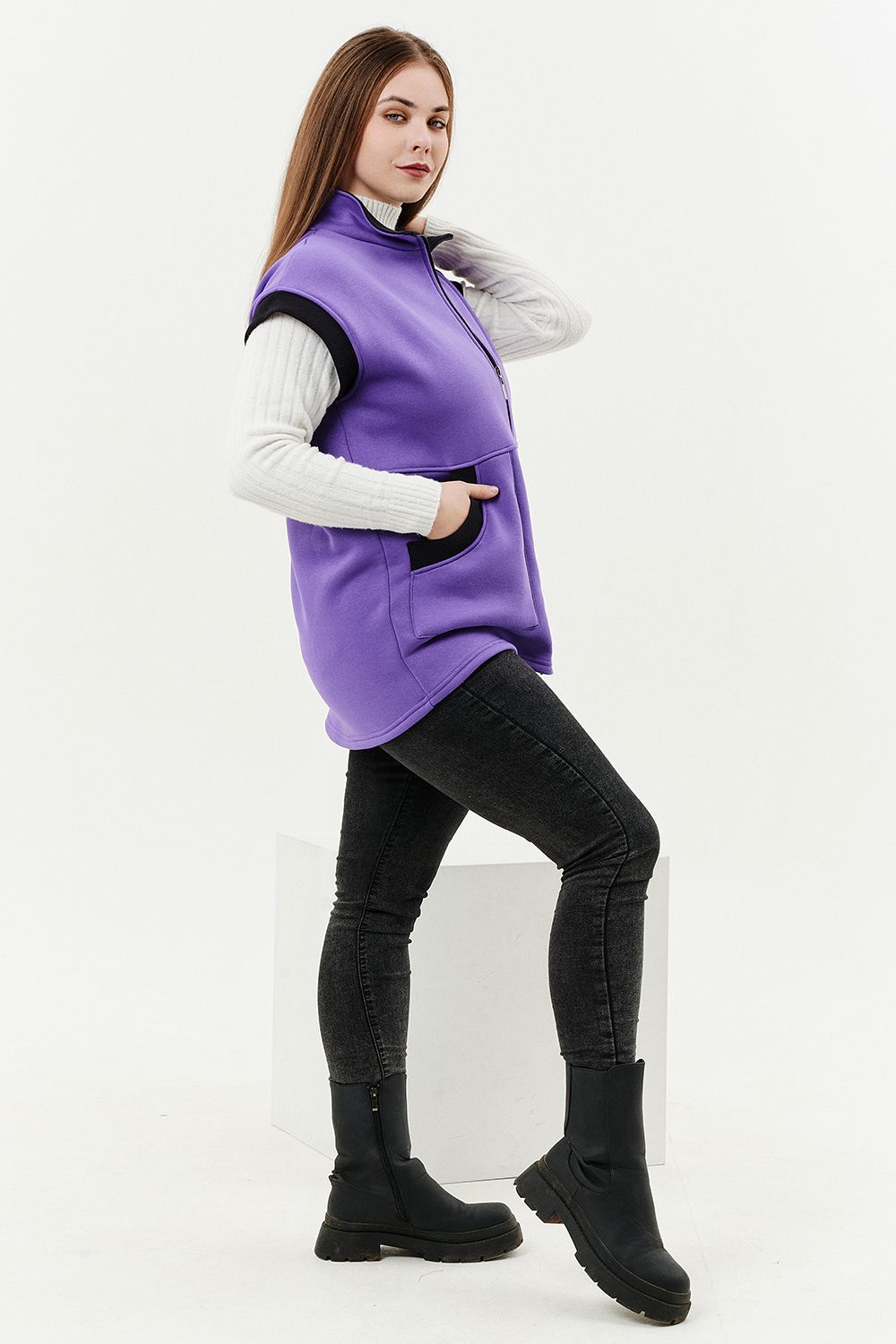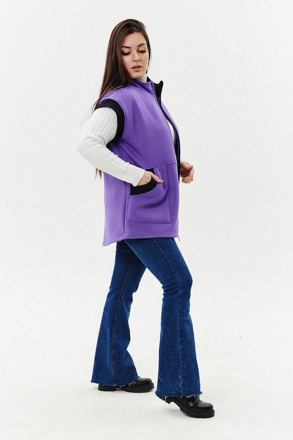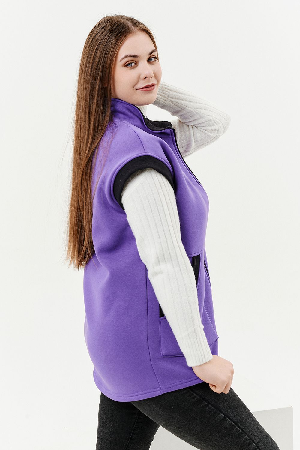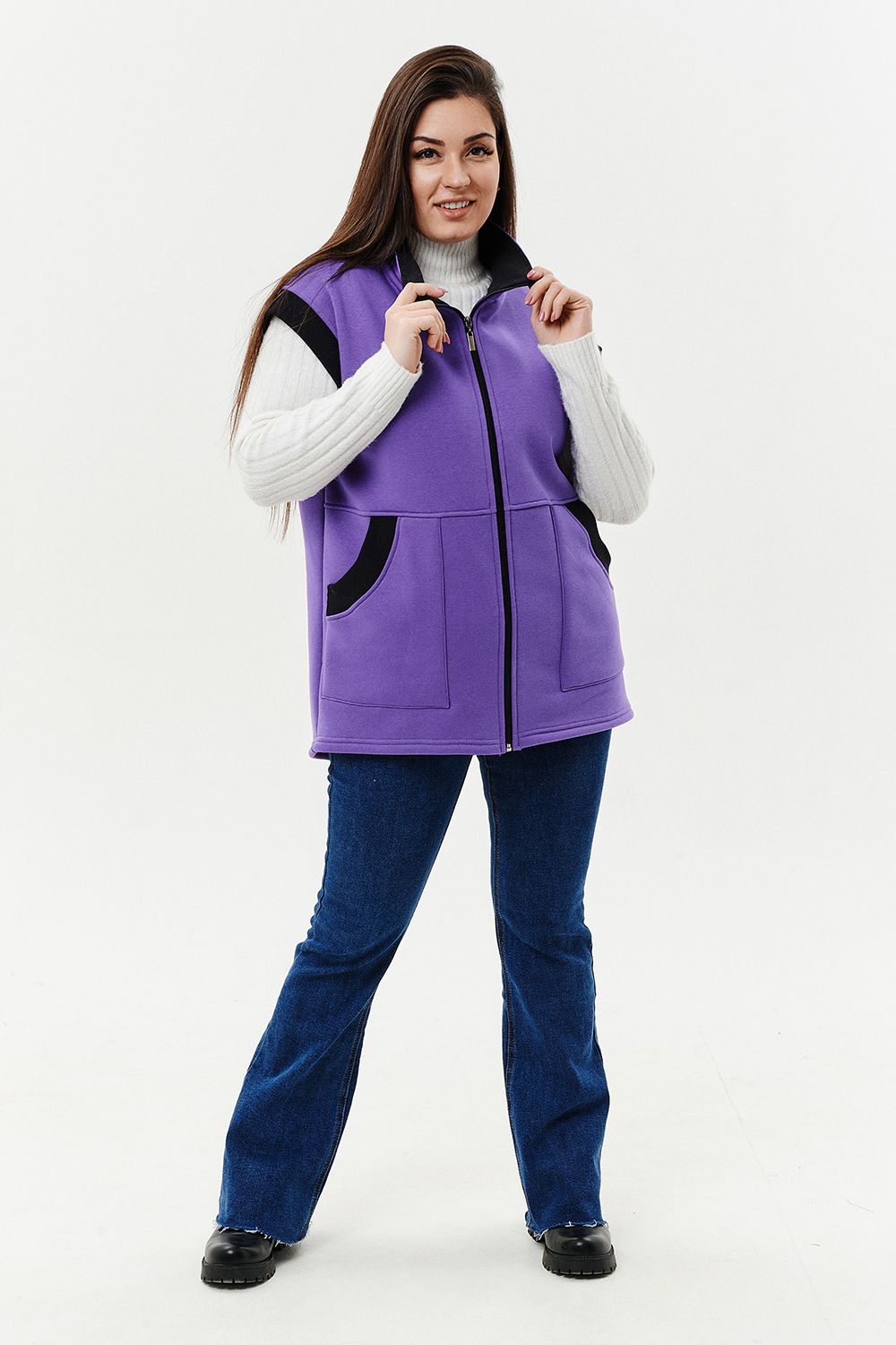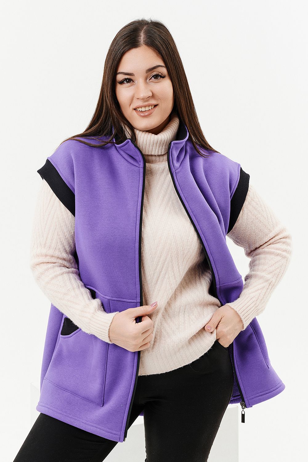 Жилет женский прямого силуэта. Застежка на тесьму - молнию. Воротник - стойка. На полочке два накладных кармана. Обтачки пройм, фигурного входа в карман и нижний воротник из кашкорсе контрастного черного цвета. Спинка немного длиннее полочки. Женщина в этом жилете будет выглядеть стильно и одновременно защищена от холода.