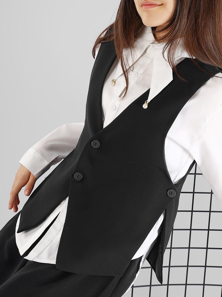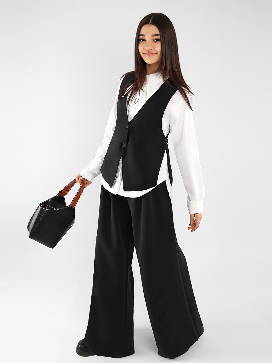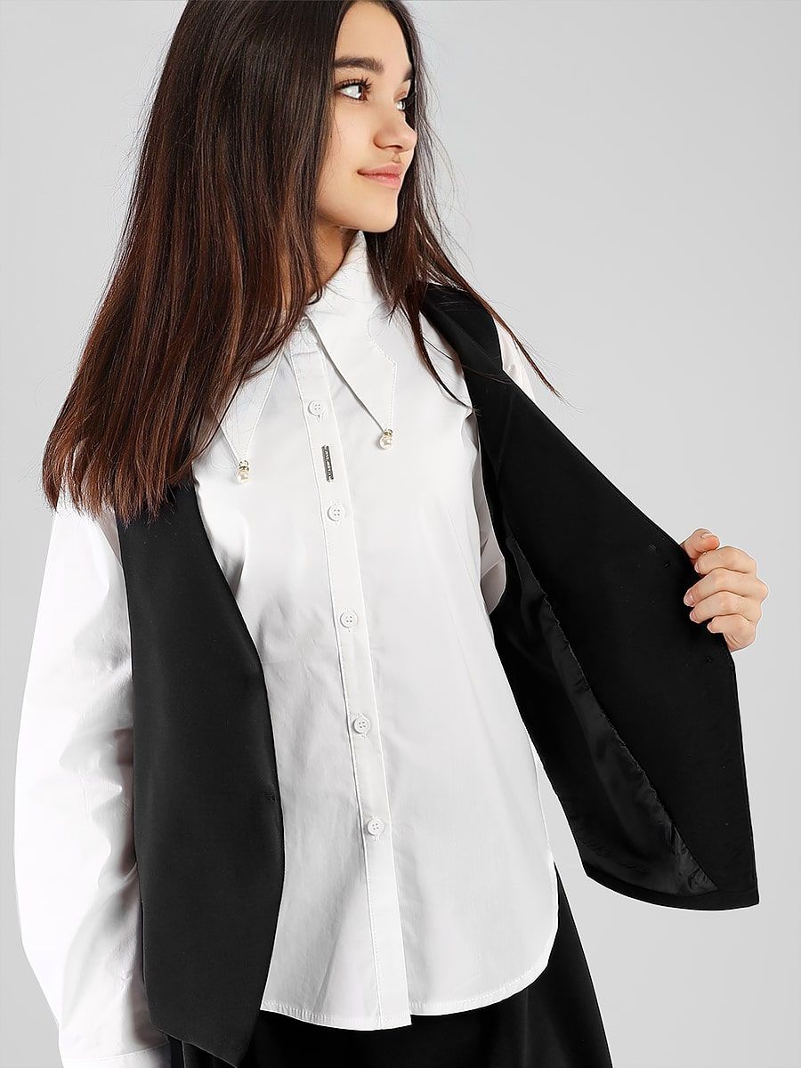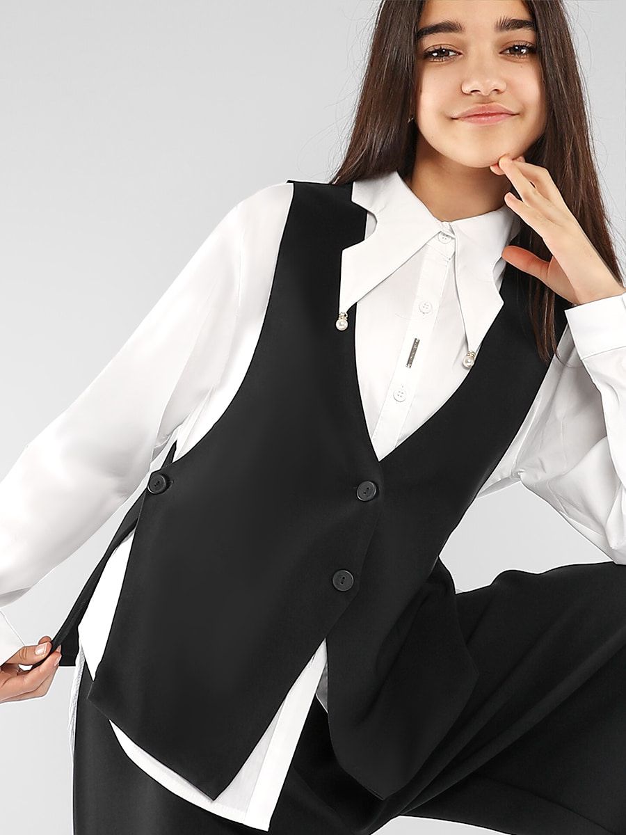 Классический, однобортный жилет для девочки Соль&Перец. Жилет с подкладом, выполнен из износостойкой костюмной ткани «Босс» которая долго сохраняет форму и привлекательный внешний вид. Жилет прекрасно сочетается с юбками и брюками. Подойдет для посещения школы, официального или праздничного мероприятия.