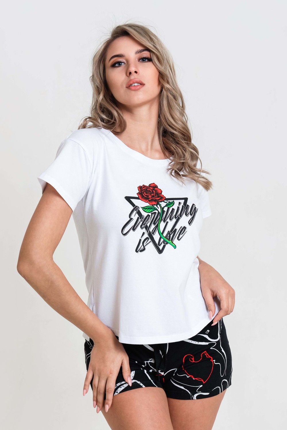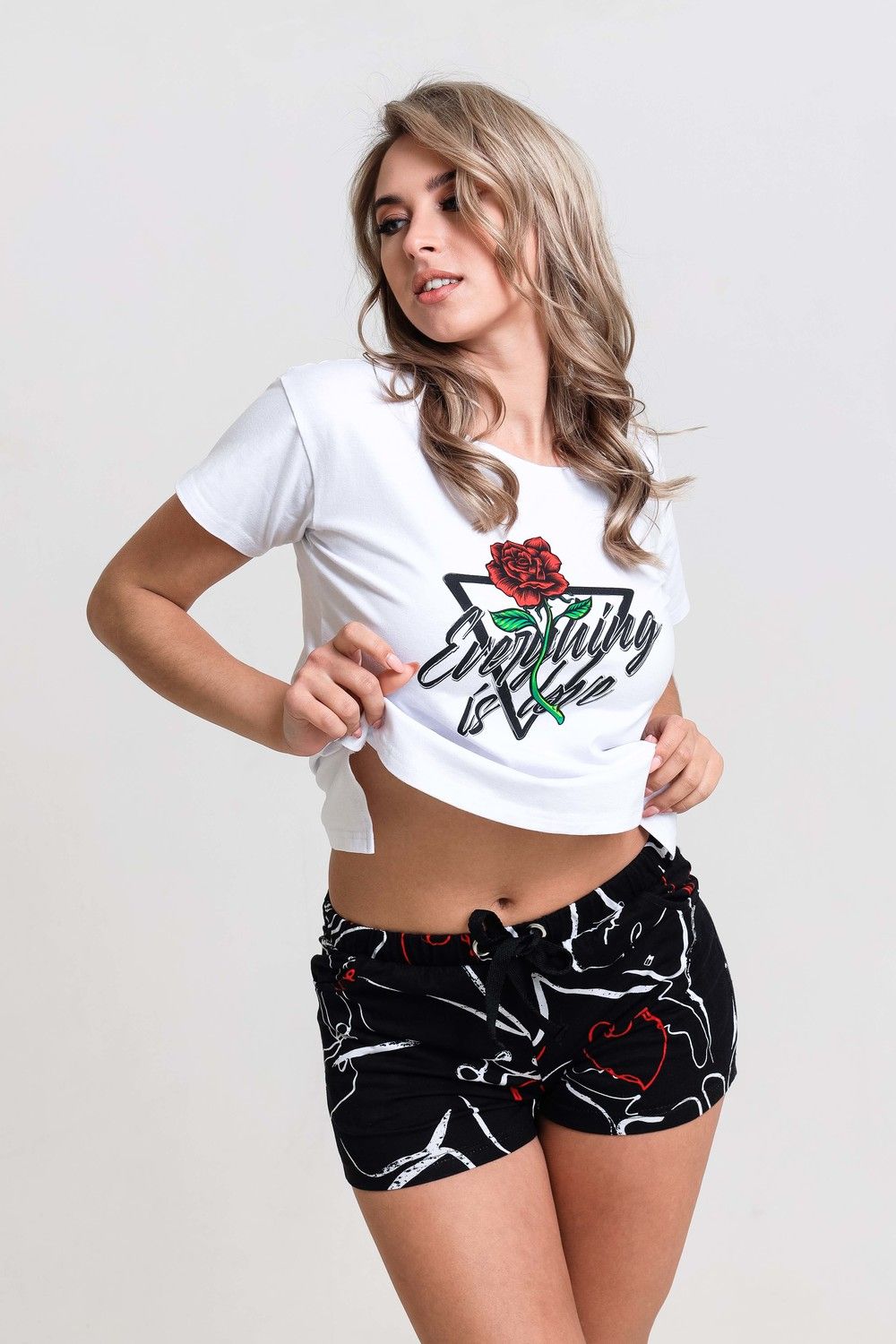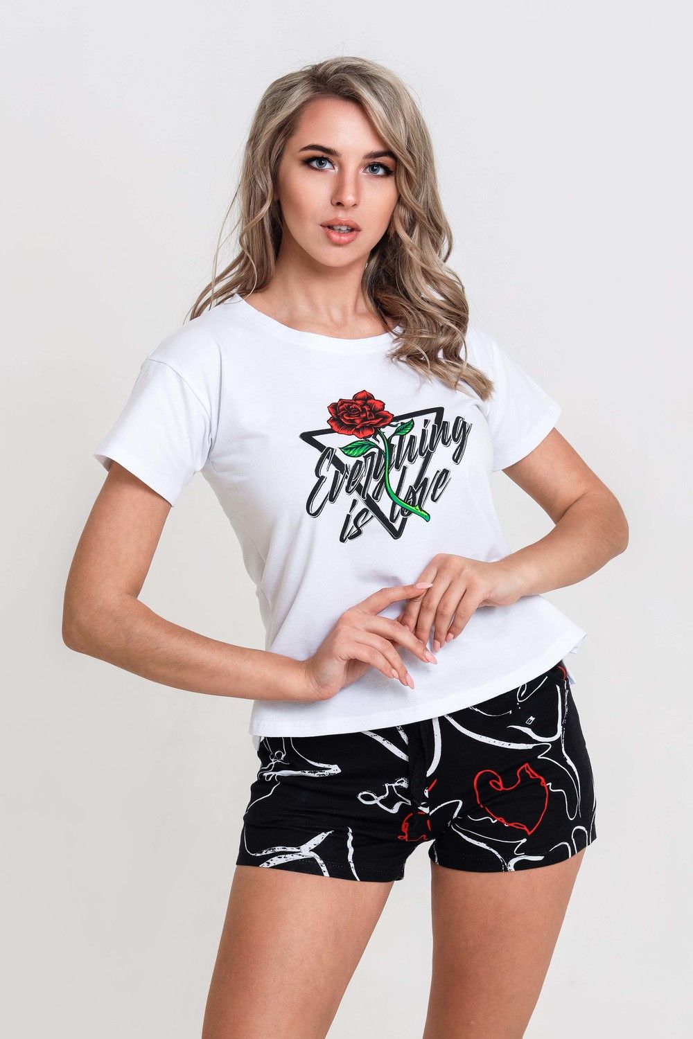 Пижама женская из хлопка. Футболка 95% хлопок, 5% лайкра. Шорты 100% хлопок. Пижама домашняя для сна. Белая укороченная футболка с принтом роза и надписью. Шорты с карманами, пояс на резинке со шнурком. Футболка с шортами подойдут как для повседневного ношения, домашнего времяпрепровождения и комфортного сна. Приятная к телу вещь порадует Вас уютом и комфортом. Отличный подарок сестре, дочери, маме, жене, подруге.