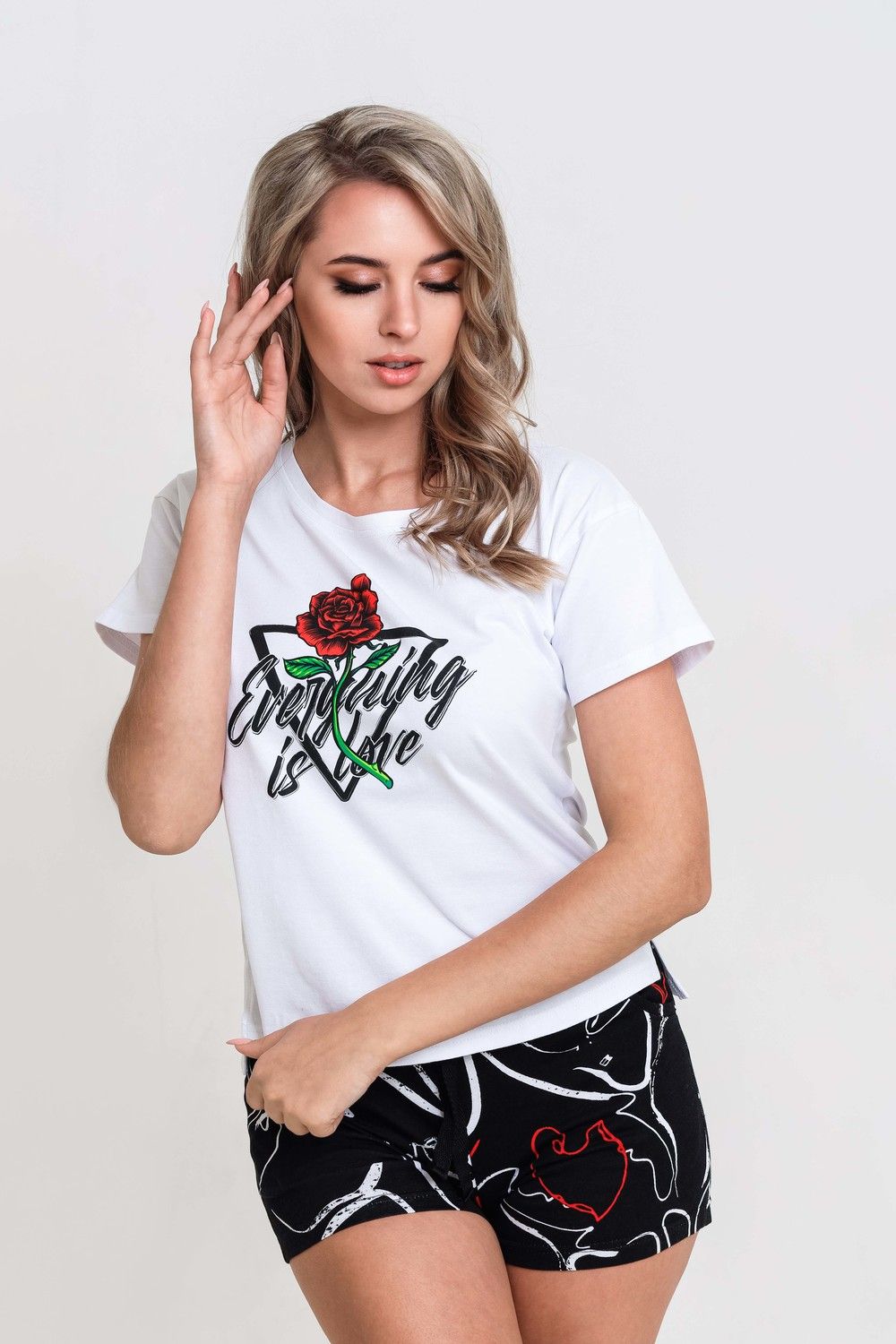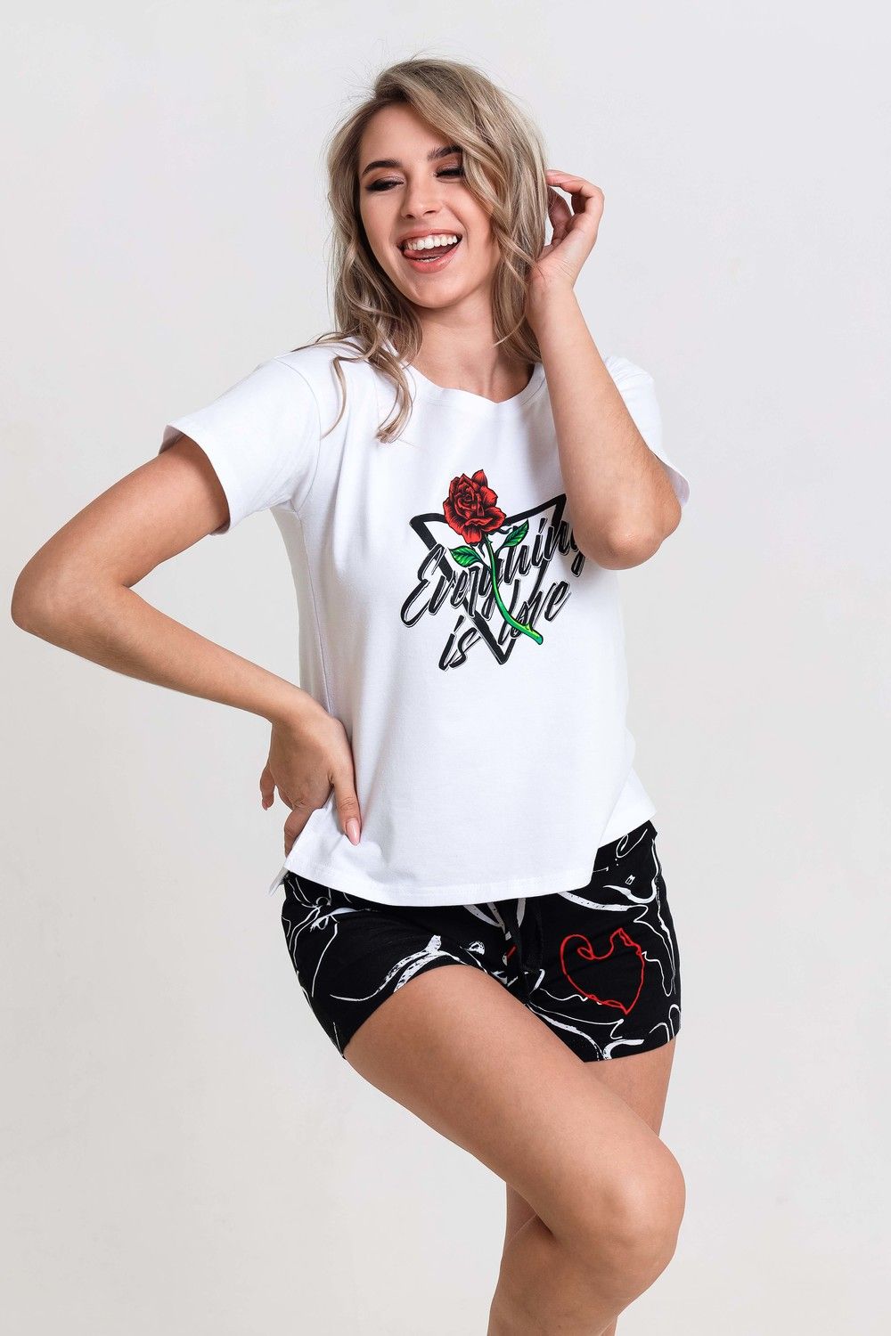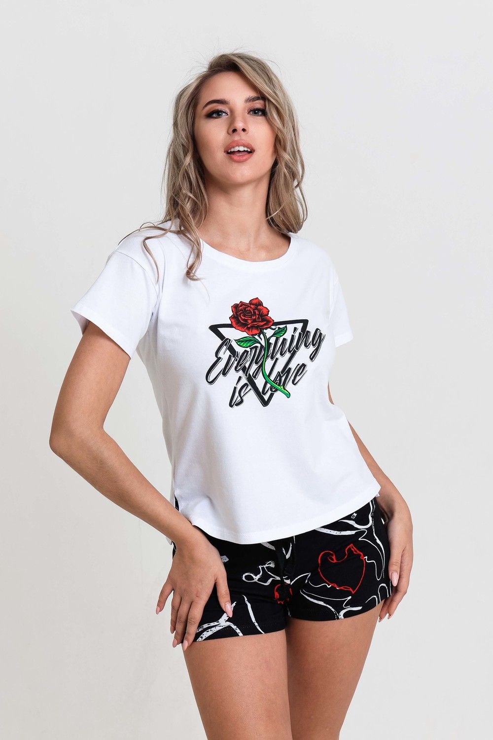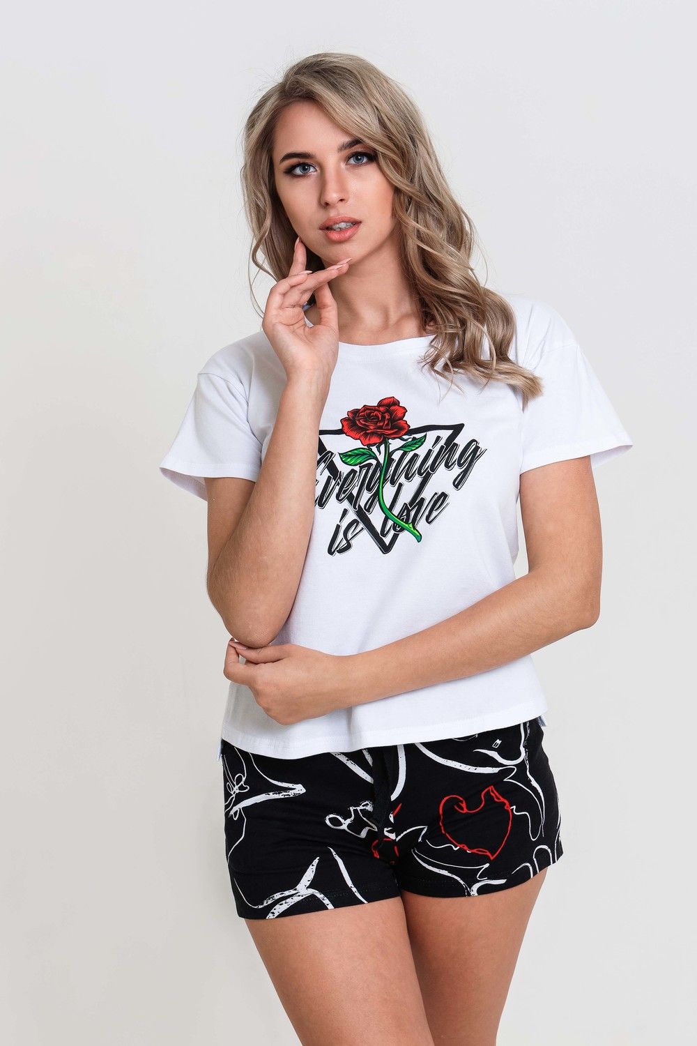 Пижама женская из хлопка. Футболка 95% хлопок, 5% лайкра. Шорты 100% хлопок. Пижама домашняя для сна. Белая укороченная футболка с принтом роза и надписью. Шорты с карманами, пояс на резинке со шнурком. Футболка с шортами подойдут как для повседневного ношения, домашнего времяпрепровождения и комфортного сна. Приятная к телу вещь порадует Вас уютом и комфортом. Отличный подарок сестре, дочери, маме, жене, подруге.