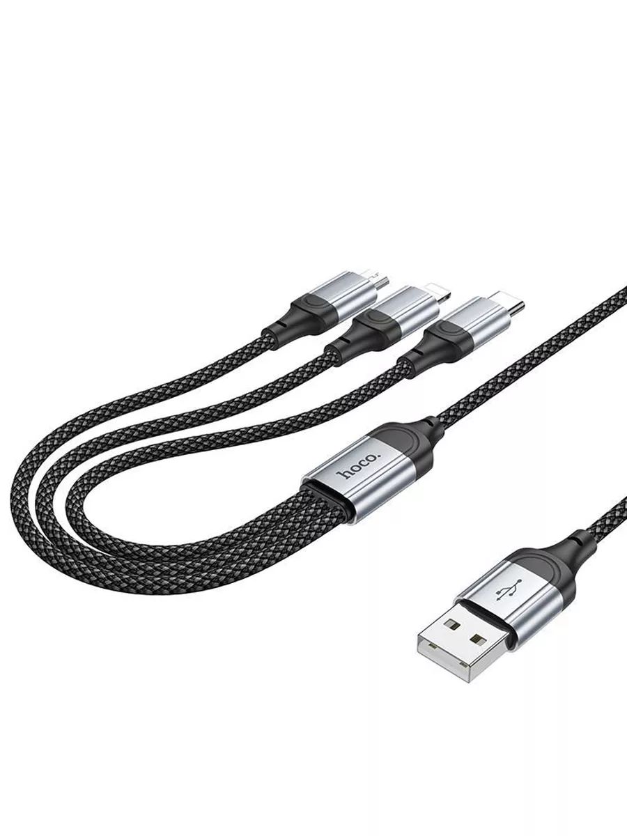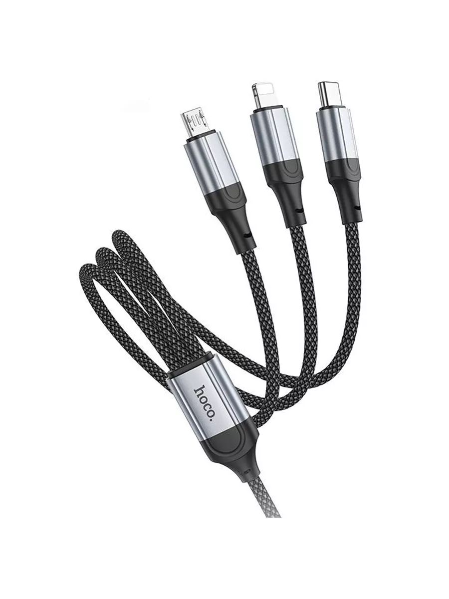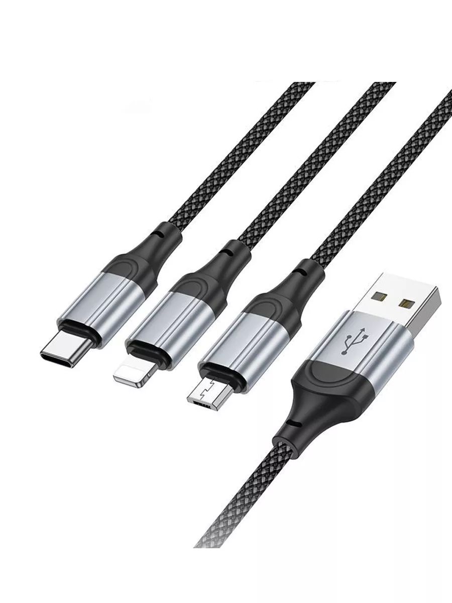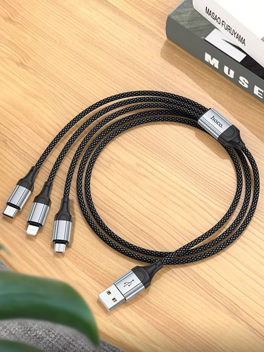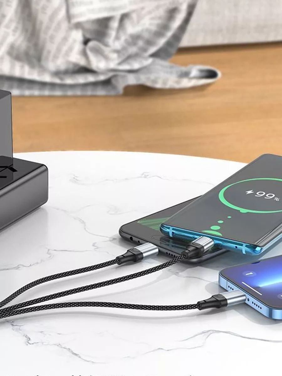 Универсальный кабель для зарядки телефона в новой прочной оболочке представляет собой тройной провод 3 в 1. Он комплектуется разъемом Lightning для зарядки iPhone, а также разъемами Type C и micro USB, которые подходят для смартфонов Samsung, Xiaomi, Huawei, Honor и Realme на операционной системе Android. Этот универсальный провод может быть легко подключен к порту или адаптеру питания типа USB A. Что касается его надежности и прочности, то кабель обладает прочной синтетической оплеткой, которая защищает его от повреждений. Благодаря этому, он идеально подходит для использования в автомобиле, например, подключения к прикуривателю. Будь то на работе или дома, этот кабель обеспечивает практичное зарядное устройство для всех современных гаджетов.