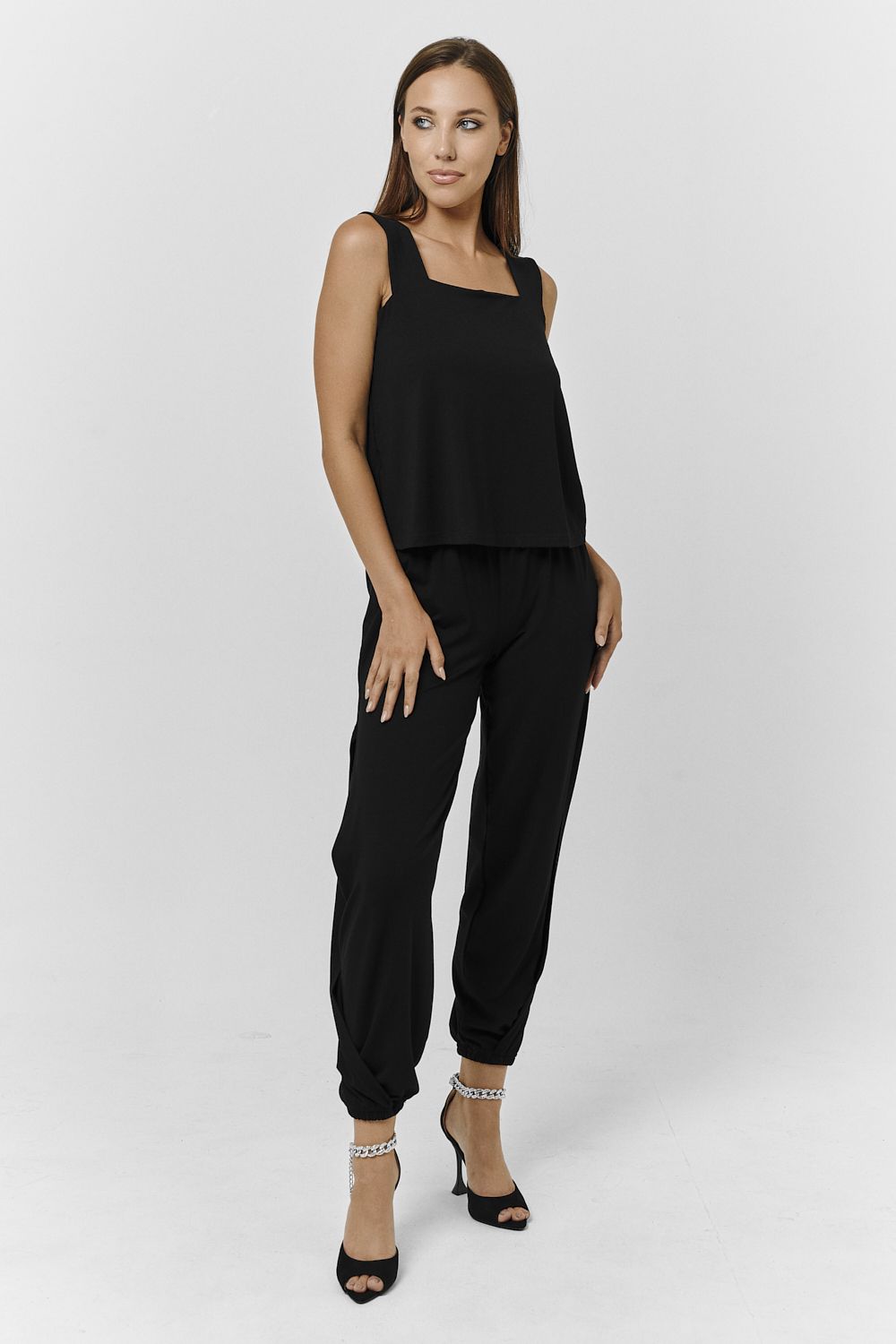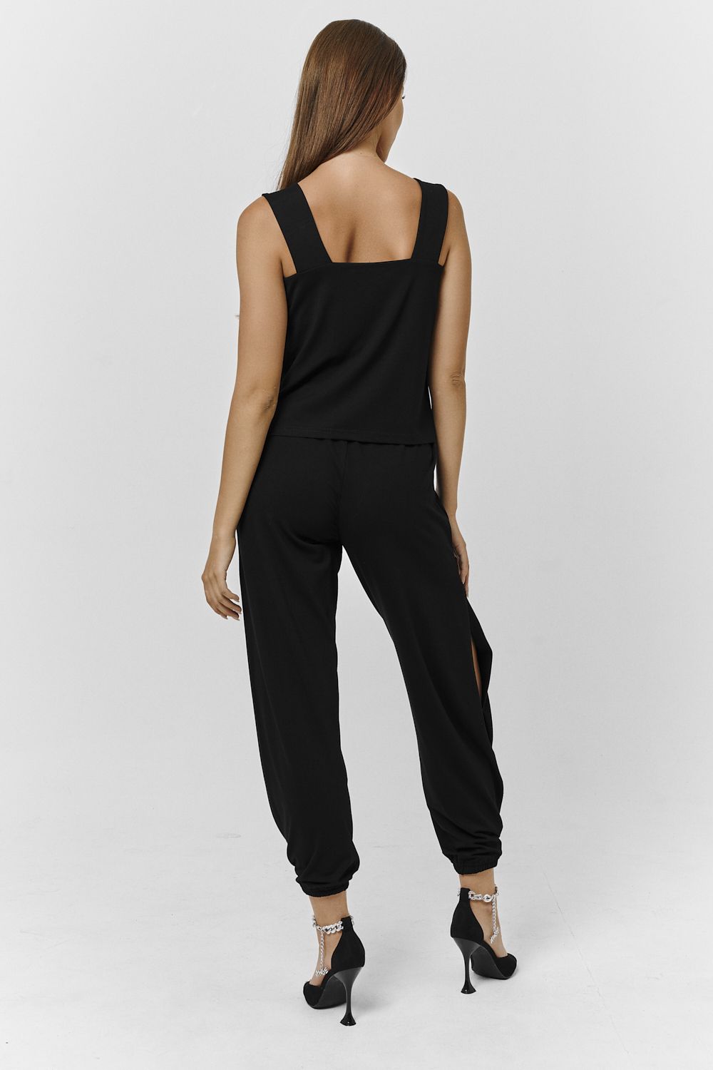 Костюм женский состоит из топа и джоггеров, в боковых швах разрезы.
