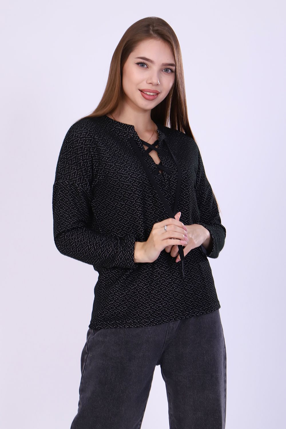Джемпер женский из мягкого вязаного трикотажа. V-образный вырез горловины декорирован люверсами и шнуром, спущенная пройма, длинный рукав. Джемпер комфортный, универсальный, создаст неповторимый стиль для модницы любой фигуры и возраста. С наступлением холодов эта вещь становится основой всего базового гардероба, отличным офисным вариантом.