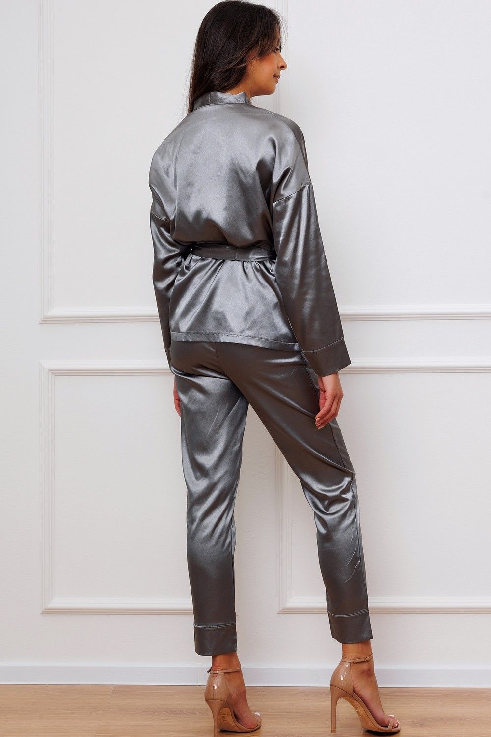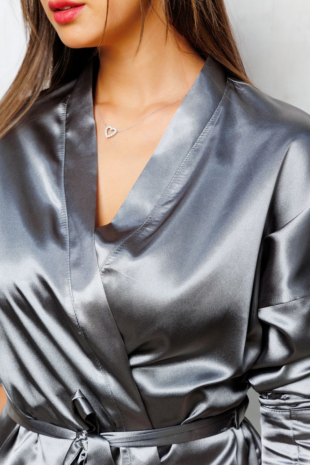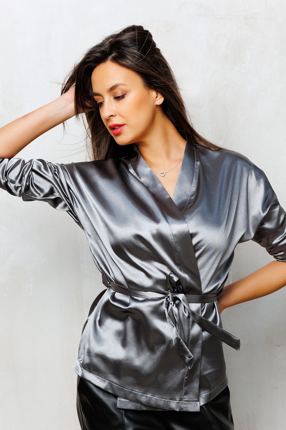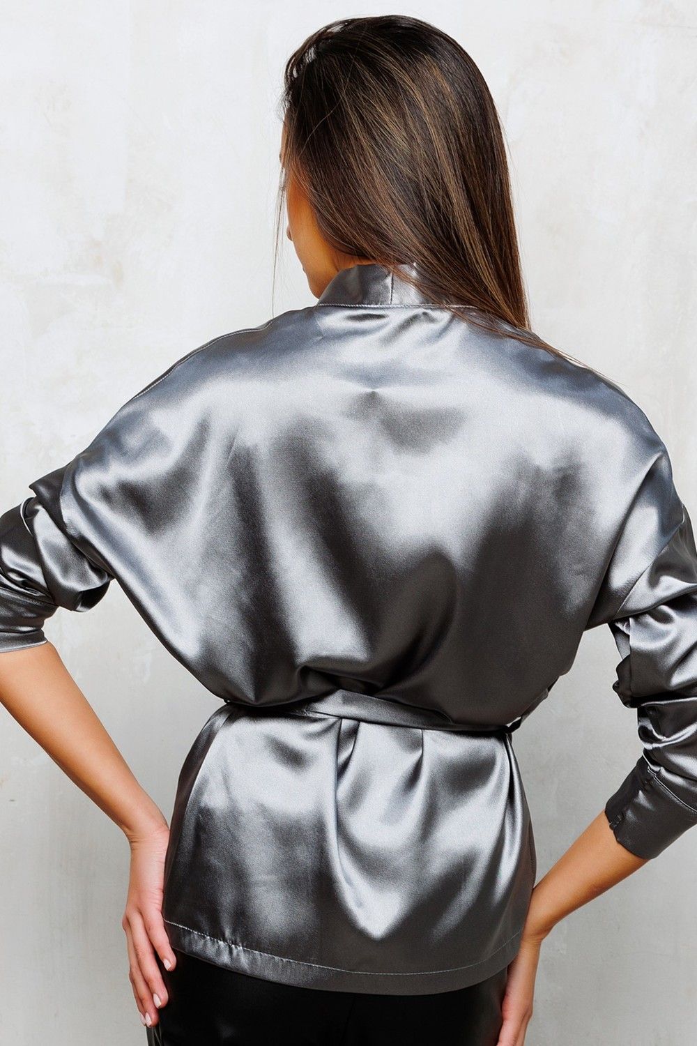 Жакет из струящегося атласа в невероятном серебристом оттенке. Отлично смотрится с кожаной юбкой или брюками. Модель жакета - на запах, без застежки. В комплекте пояс. Рост модели 173 см.
