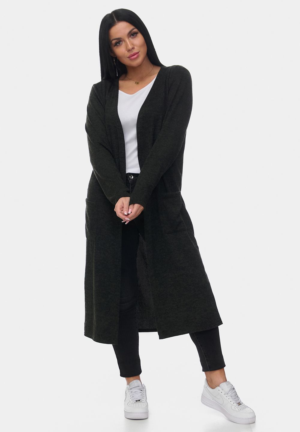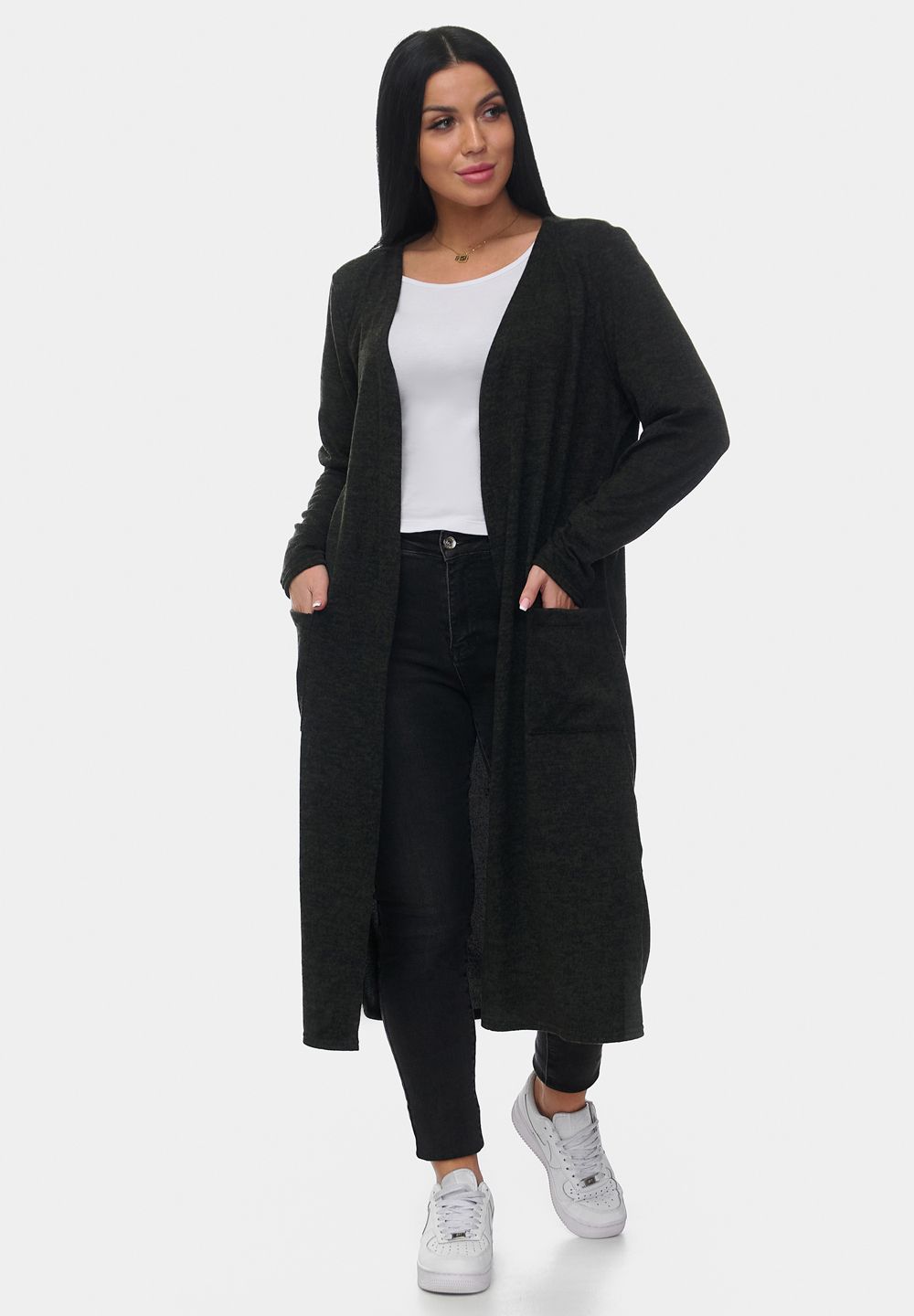 Стильный и уютный длинный кардиган из мягкой ангоры софт. Модель прямого кроя с удобными накладными карманами и открытой линией переда. Приятный на ощупь материал обеспечивает комфорт и тепло, идеально подходит для повседневных образов. Отлично сочетается с джинсами и брюками.