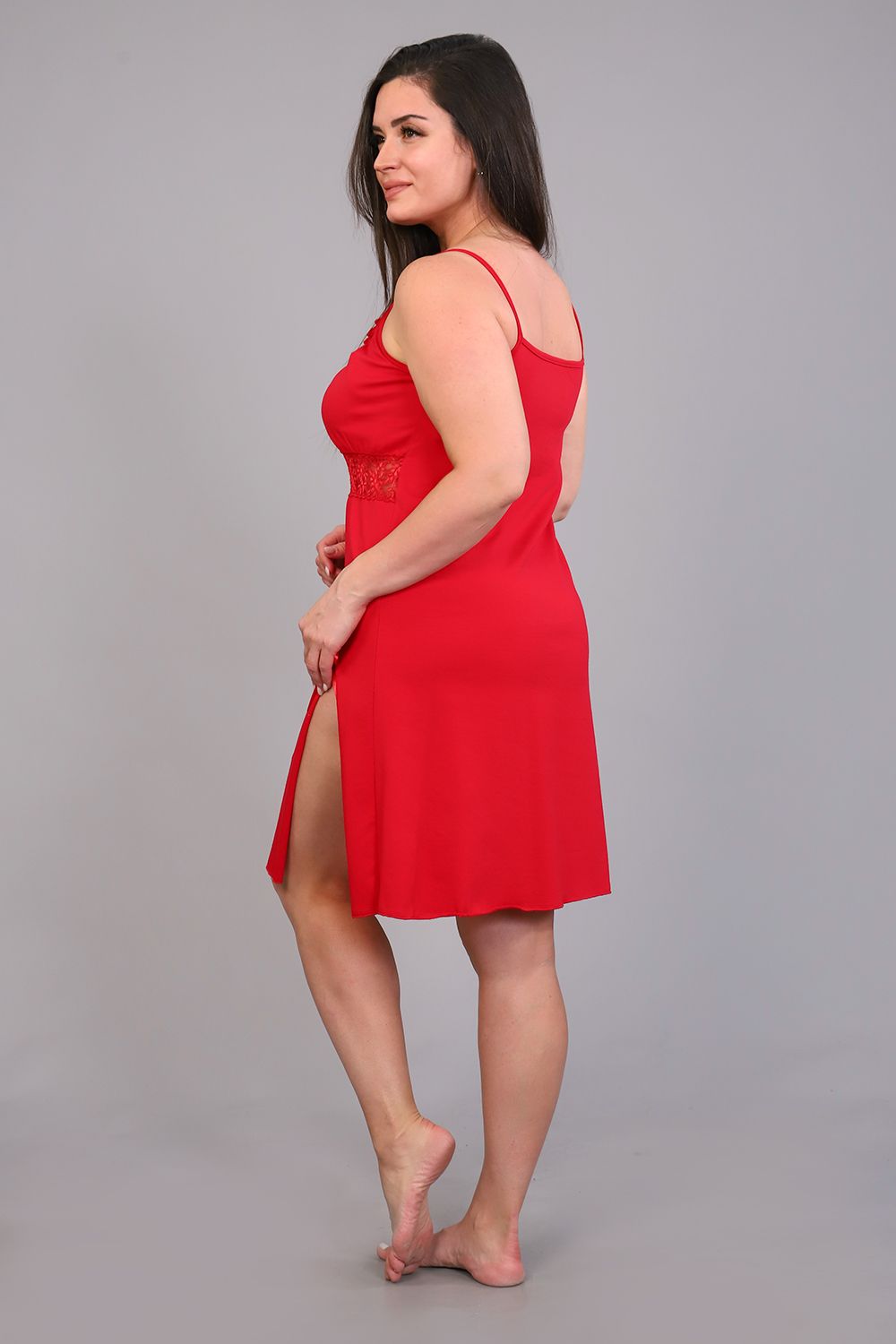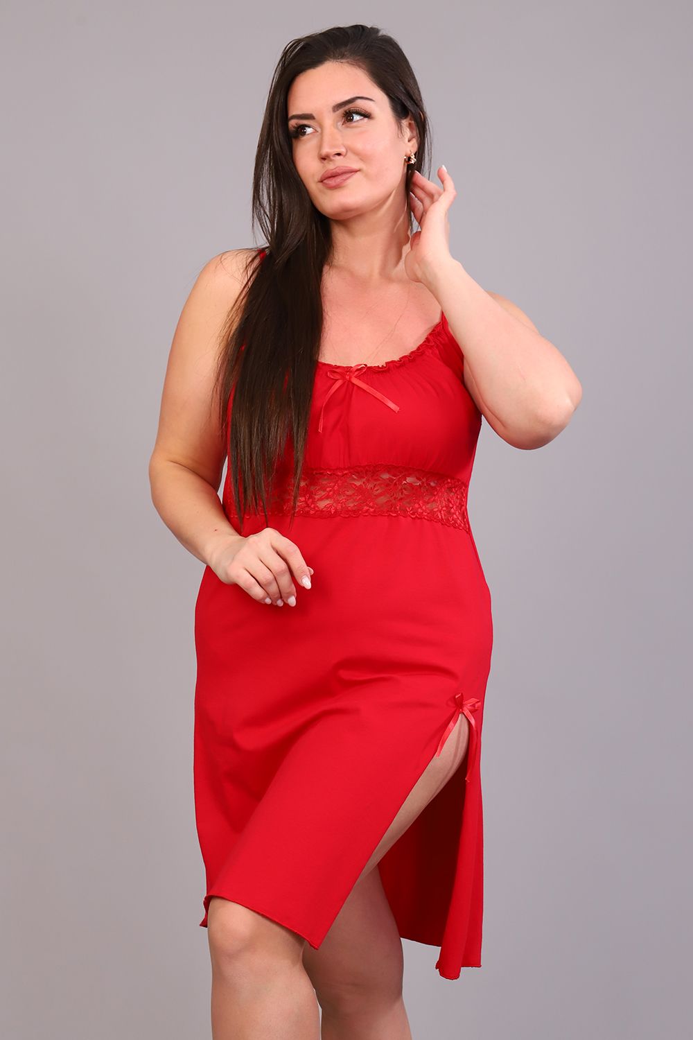 Сорочка ночная с эластичным кружевом из однотонной вискозы. Изящная модель на узких бретелях, с кружевом чуть ниже груди и разрезом на передней полочке. Декольте, разрез и низ сорочки обработаны волнистым краем. Сорочка уютная, комфортная для сна.