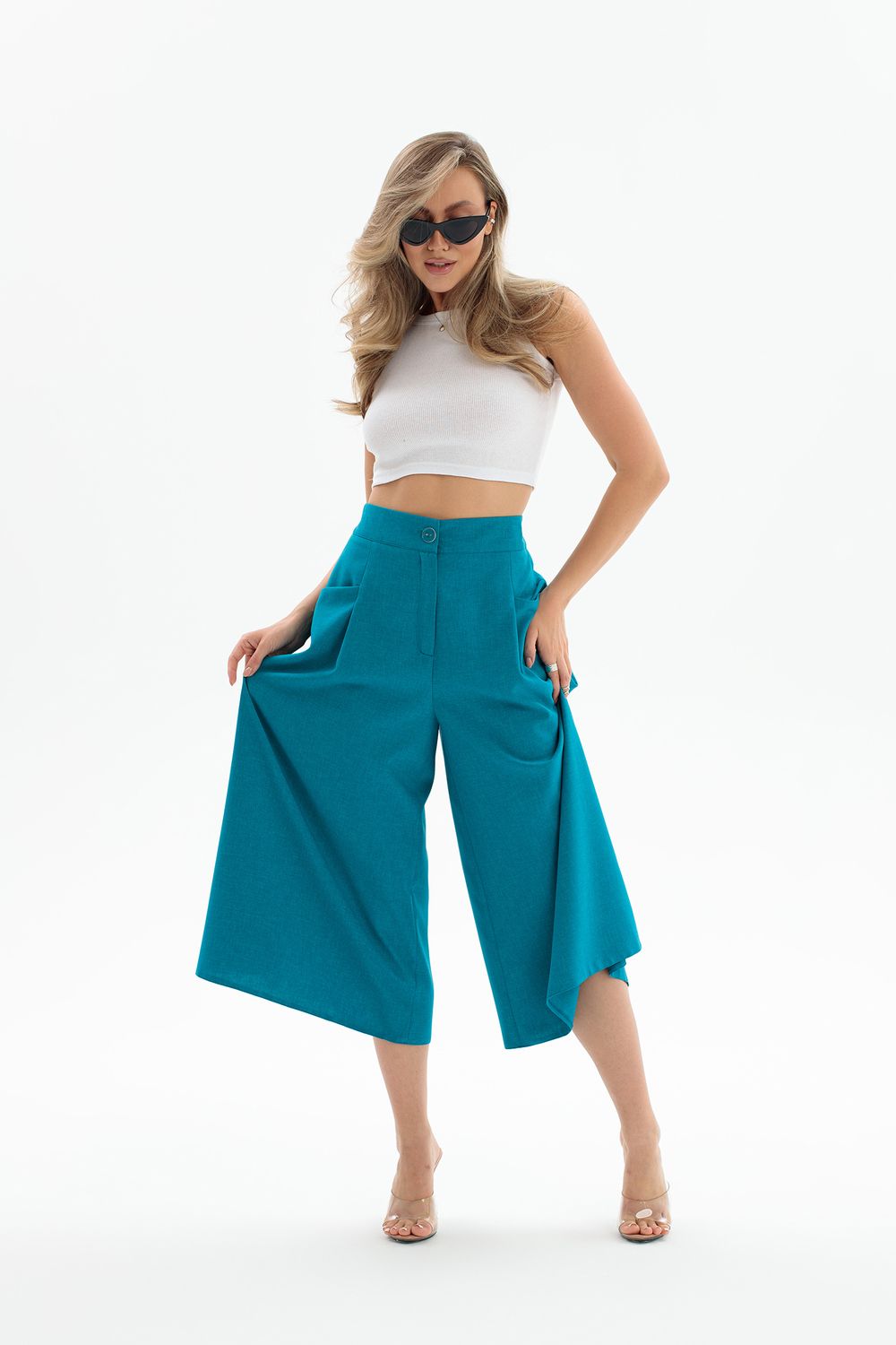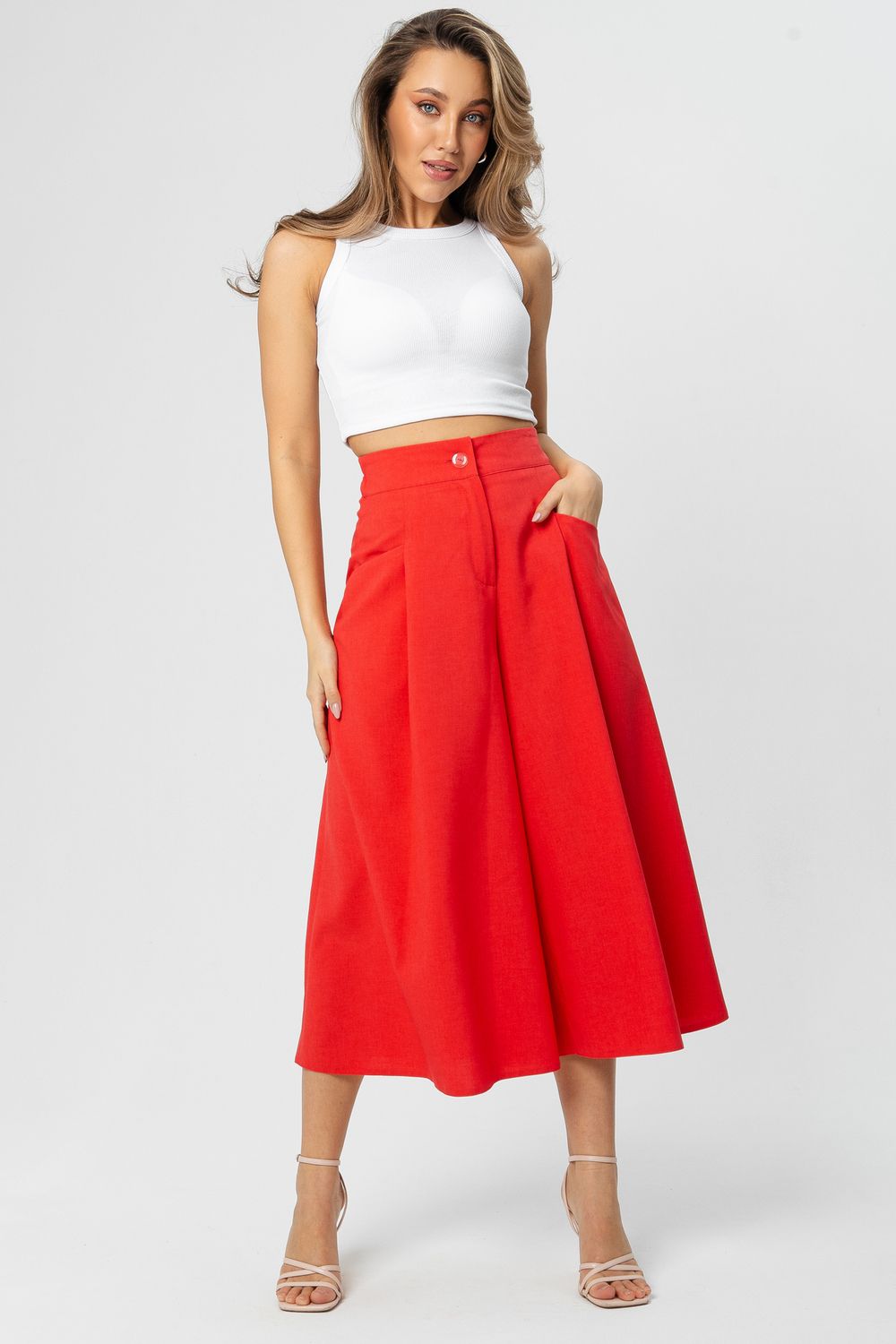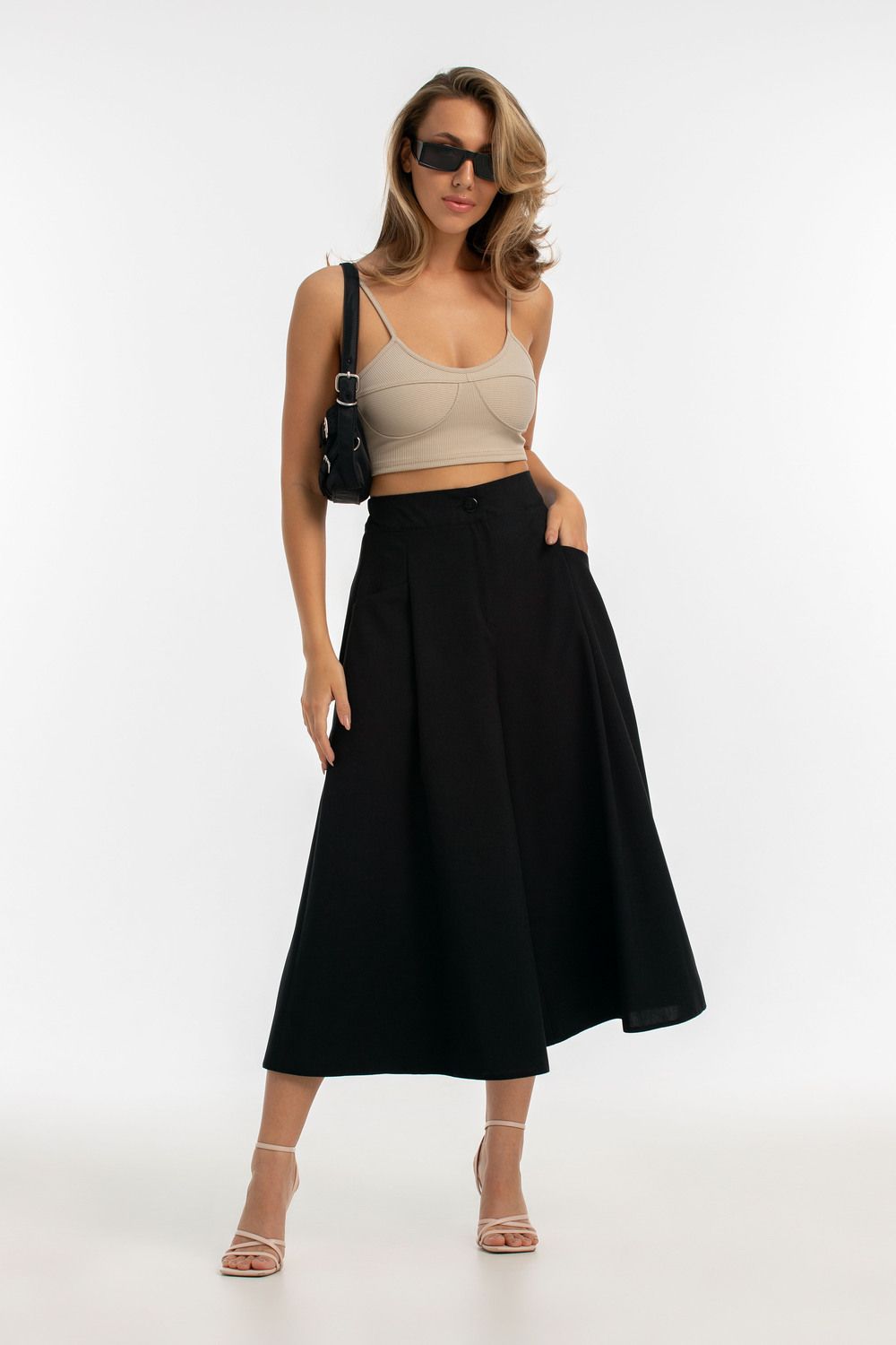 Романтичная юбка с односторонними складками, которые расходятся в разные стороны от середины юбки, не создавая лишний объем на бедрах. Для практичности по бокам выполнены карманы. В шлевки вдет пояс, который можно завязать на красивый бант.