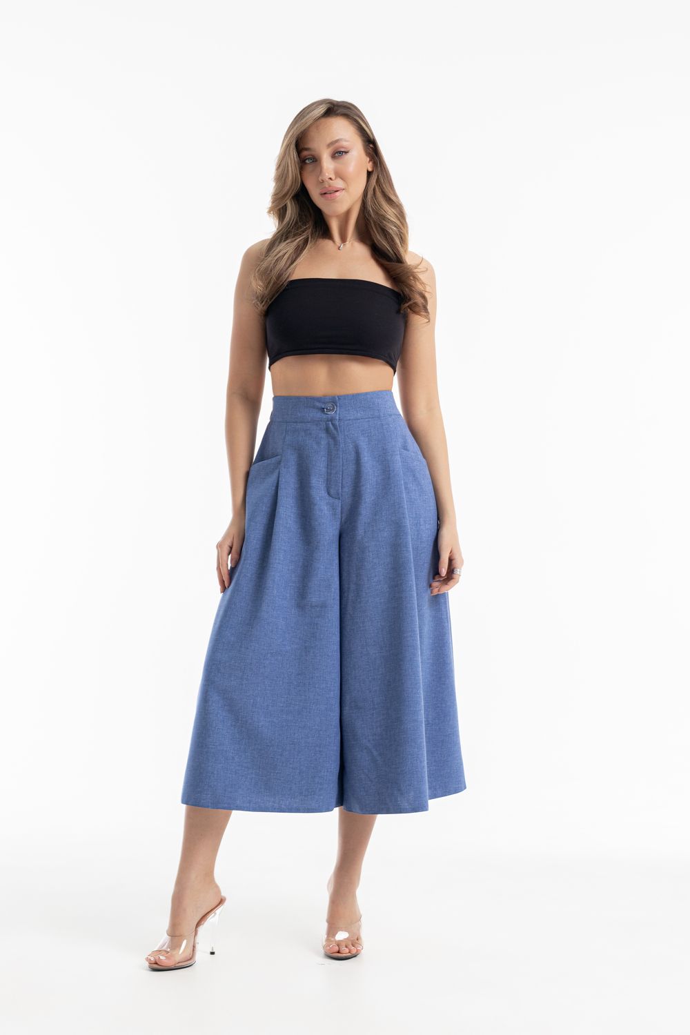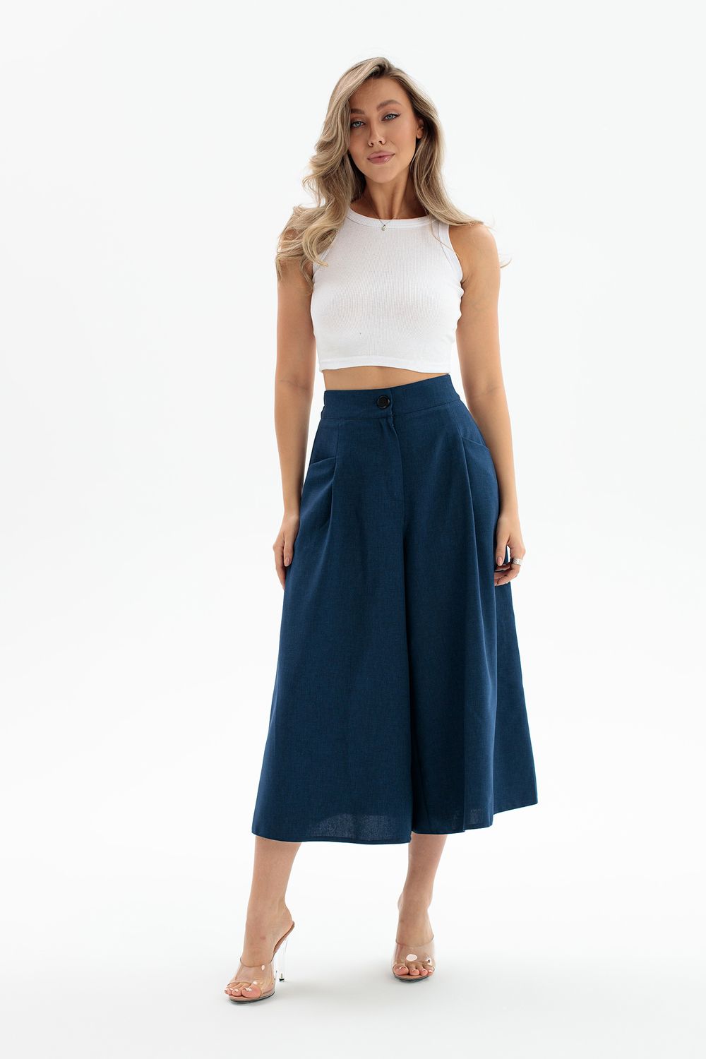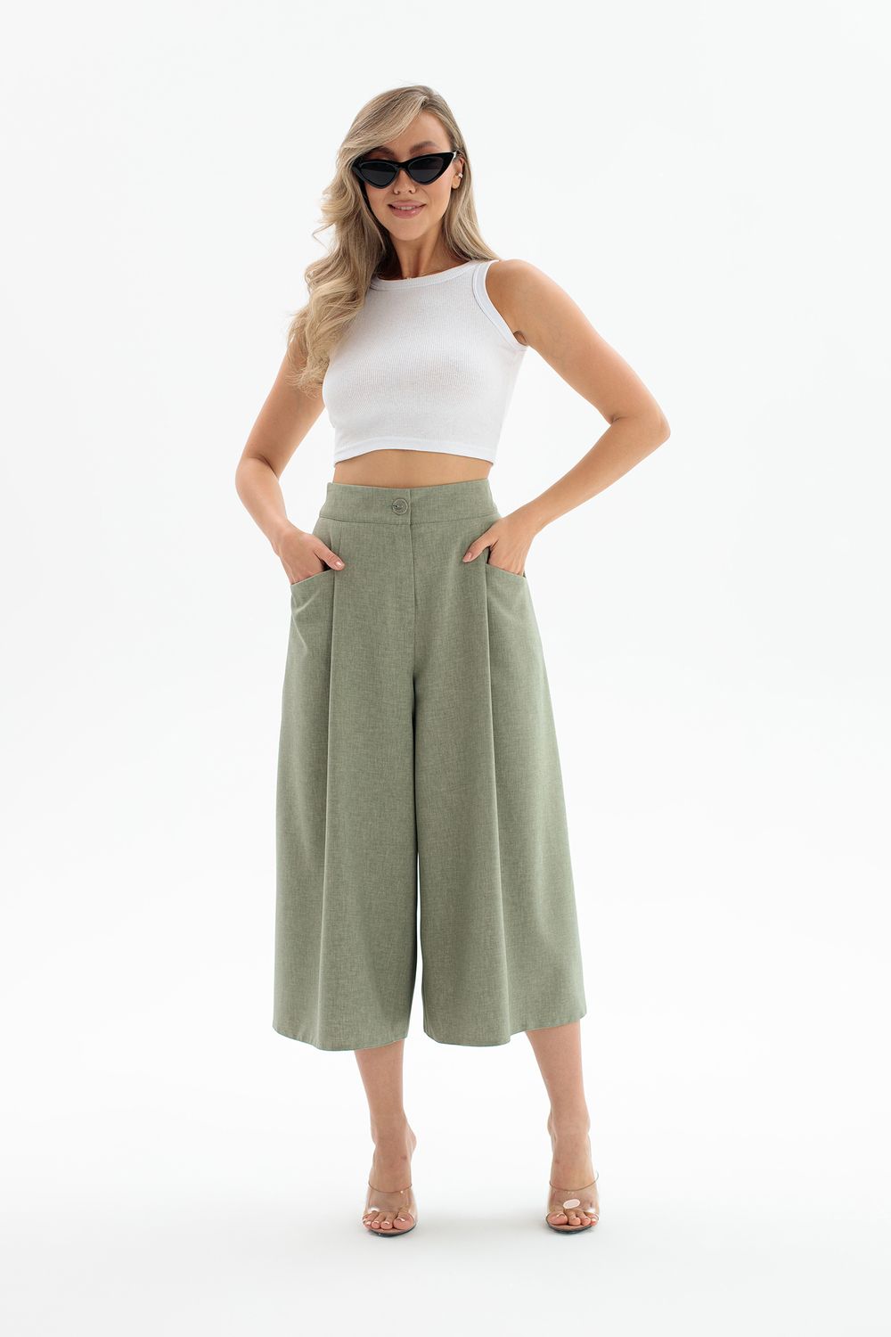 Романтичная юбка с односторонними складками, которые расходятся в разные стороны от середины юбки, не создавая лишний объем на бедрах. Для практичности по бокам выполнены карманы. В шлевки вдет пояс, который можно завязать на красивый бант.