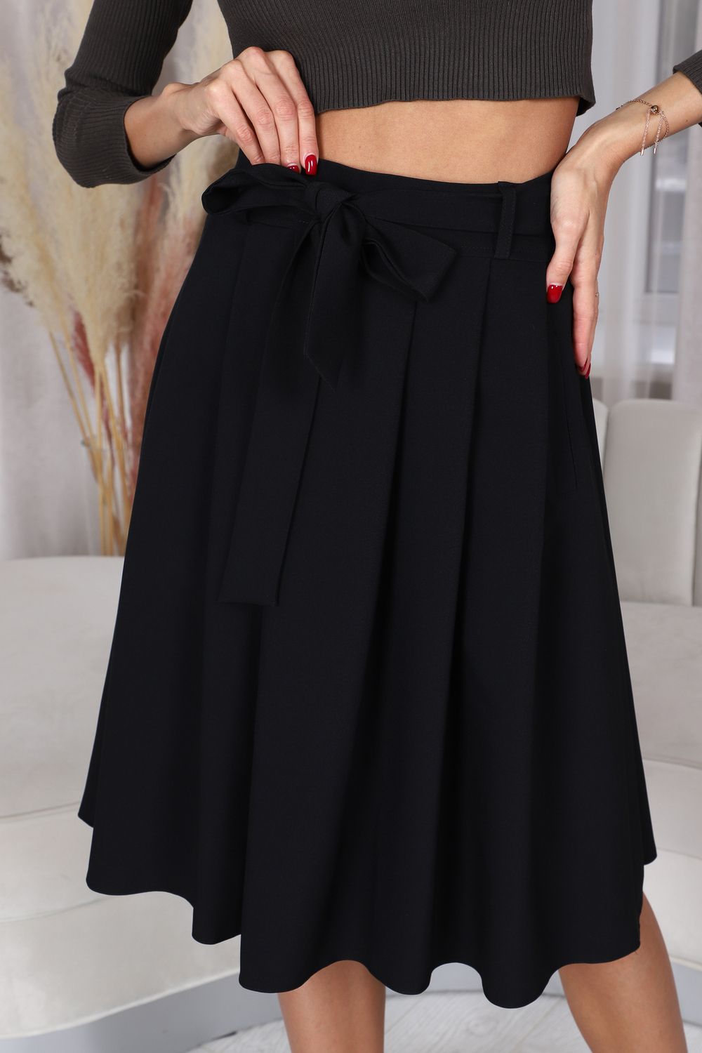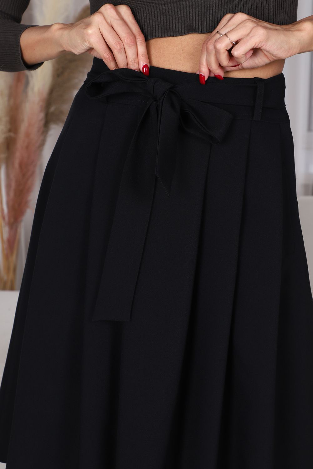 Романтичная юбка с односторонними складками, которые расходятся в разные стороны от середины юбки, не создавая лишний объем на бедрах. Для практичности по бокам выполнены карманы. В шлевки вдет пояс, который можно завязать на красивый бант.