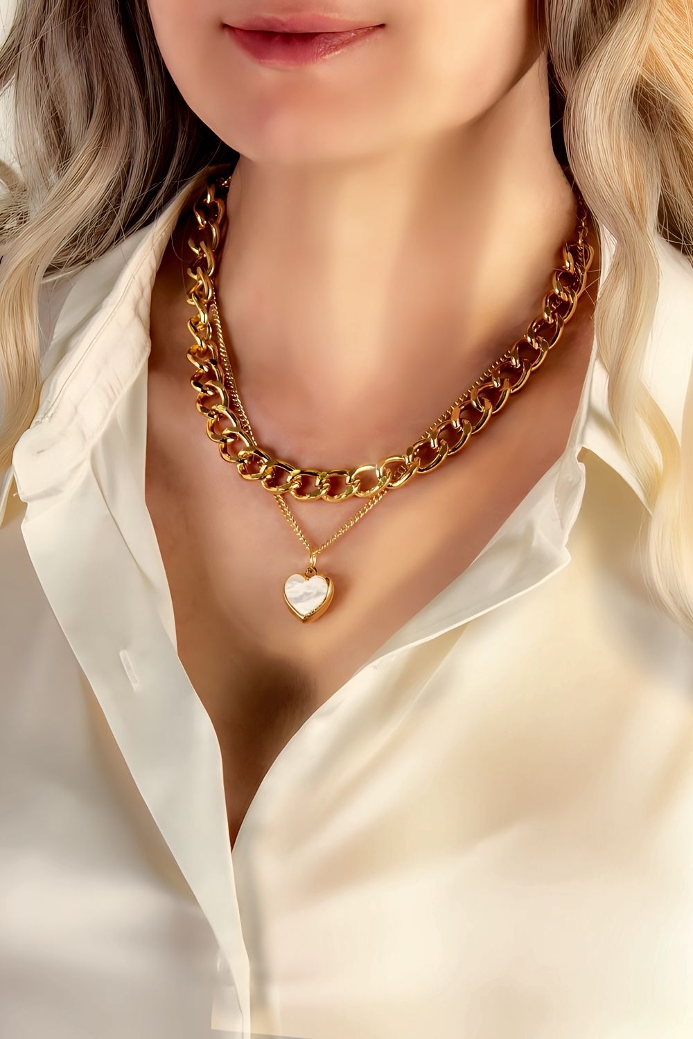 Колье на шею Сердце двустороннее Перламутр/Золото, + Подарок, в подарочном мешочке: двойная массивная цепочка на шею с подвеской Сердце двустороннее Перламутр/Золото создана из экологичного сплава отличается полновесной конструкцией и изысканной премиальной обработкой глянцевых звеньев, напоминающей роскошь драгоценных металлов. Сочетание массивной цепочки на шею и более тонкой длинной, украшенной двусторонней подвеской в форме сердца, создаёт эффектный и запоминающийся акцент и станет символом гармонии и вдохновения. Носите колье в соответствии с вашим настроением - она имеет две стороны: одна сторона сердца– нежный перламутр, дарящий образу романтичность, а другая – глянцевое золото, добавляющее элегантности и шика. Регулируемая длина колье составляет 36 см, а благодаря удлинительной цепочке (6 см), вы сможете подобрать оптимальную посадку, добавив длины по своему желанию и идеально подстраивать его под любой вырез или стиль одежды. Колье легко впишется в разный гардероб — от легких летних образов до уютных осенне-зимних нарядов. Оно также идеально подходит для повседневной носки, добавляя изысканности даже самому простому образу. Сегодня крупные геометрические аксессуары под винтаж на пике популярности, и мы предлагает вам коллекцию, которая соответствует самым актуальным трендам в мире бижутерии. Каждое наше изделие – это изящное сочетание стиля и комфорта. Мы тщательно отбираем лучшие модели, чтобы каждая наша вещь была необычным и модным украшением, которое приятно получить. Современный дизайн и универсальный размер ожерелья подходит и для молодых девушек, и для женщин, которые ценят изысканность. А утончённый стиль станет дополнением вечернего образа, праздничного наряда, строгого офисного имиджа или просто внесёт яркую деталь в повседневное время. Оно поможет вам создать неповторимый образ, который запомнится окружающим.