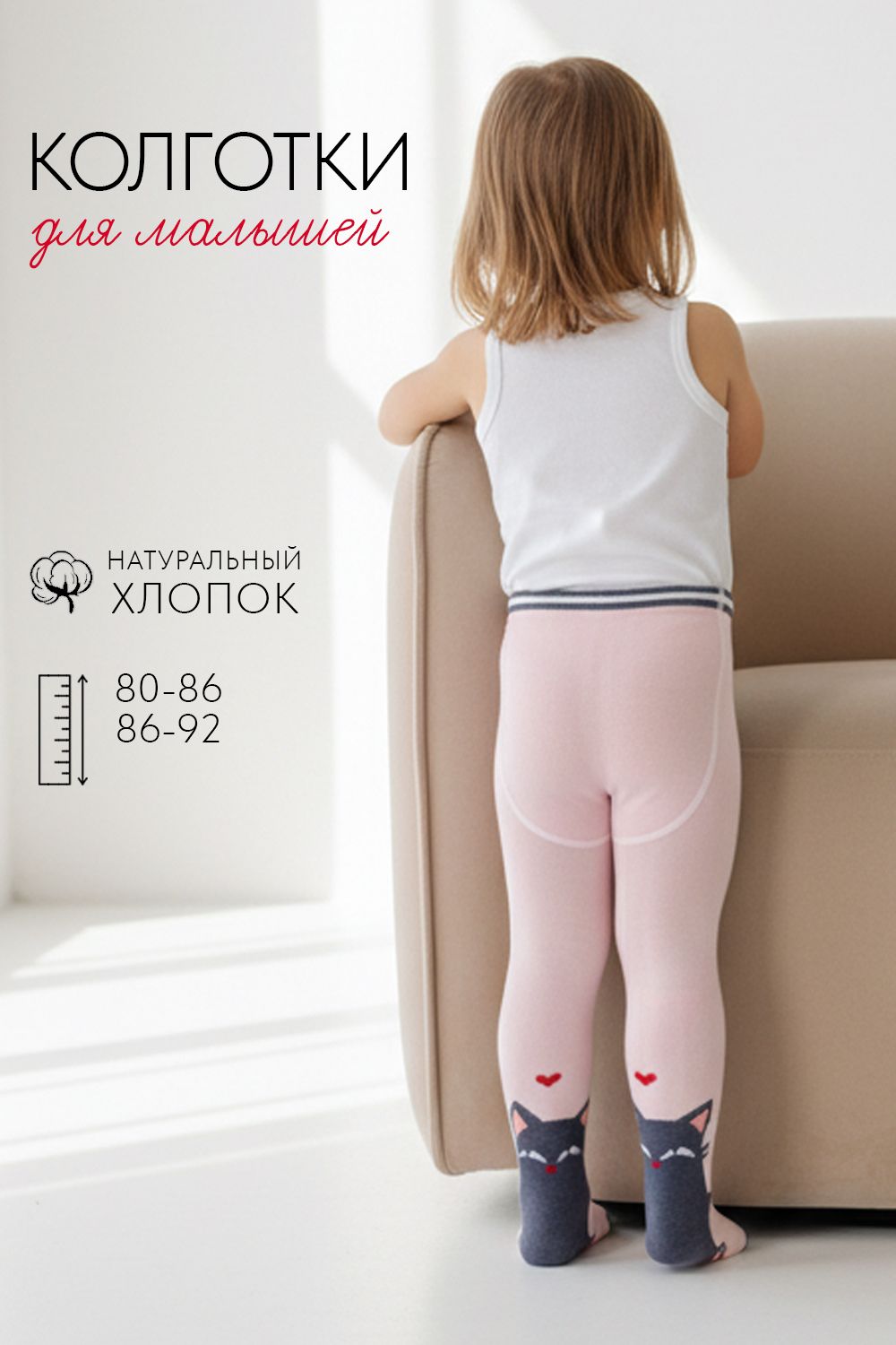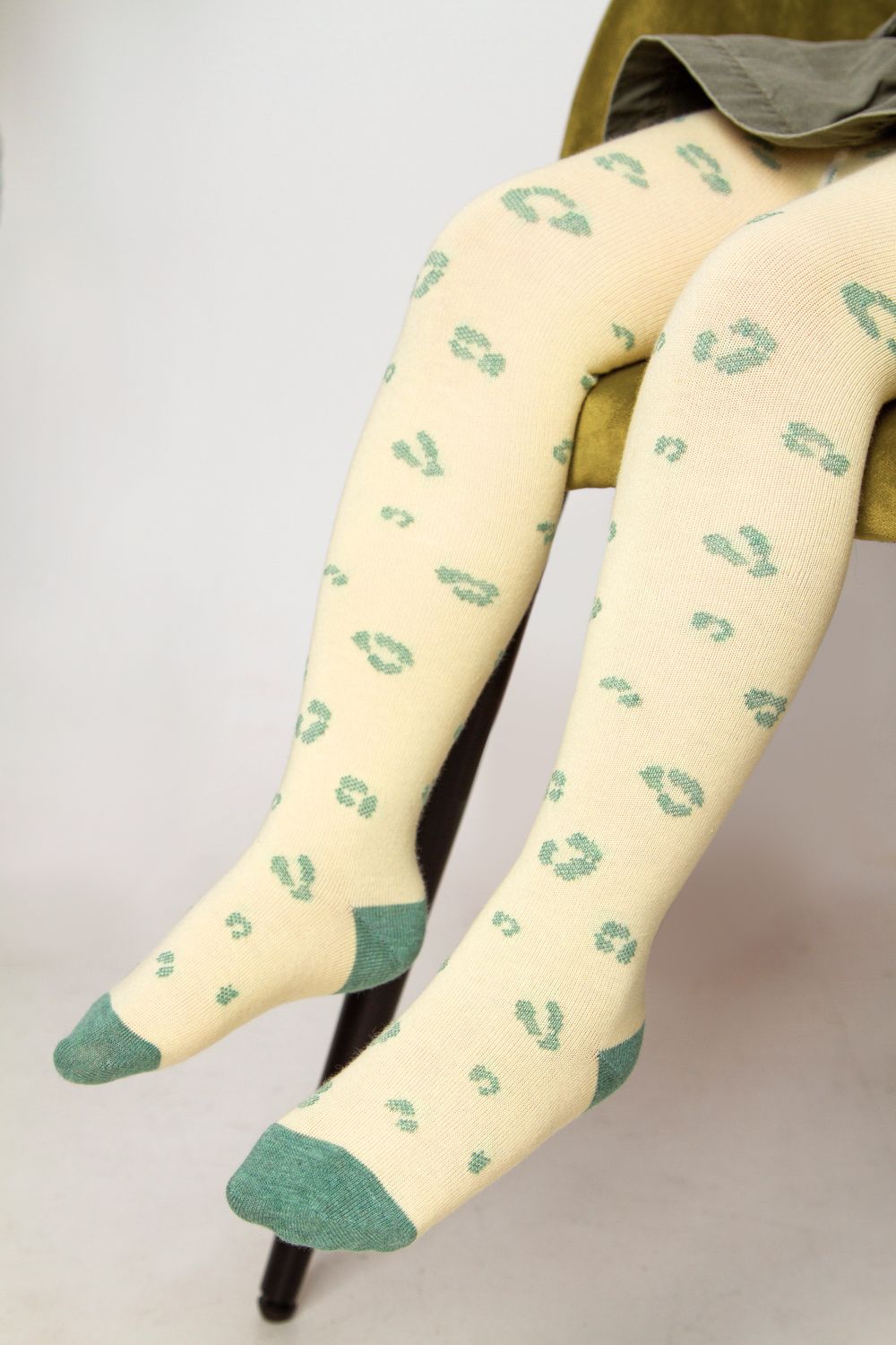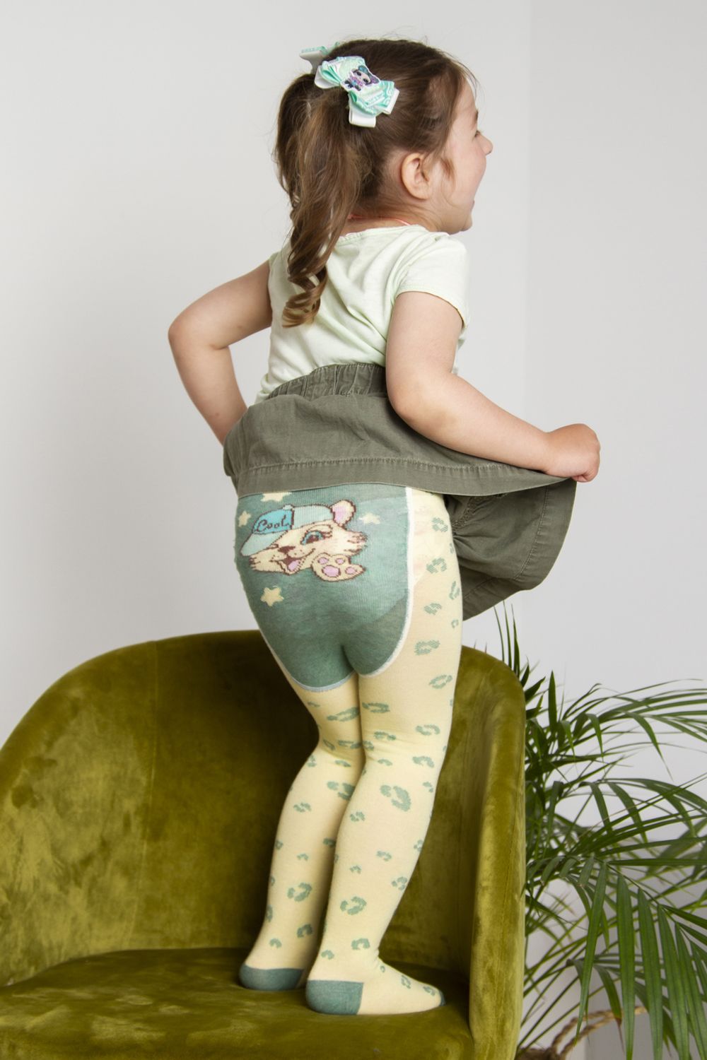 Детские колготки с вывязанными пятнышками. Сзади вывязана мордочка леопарда в кепке.