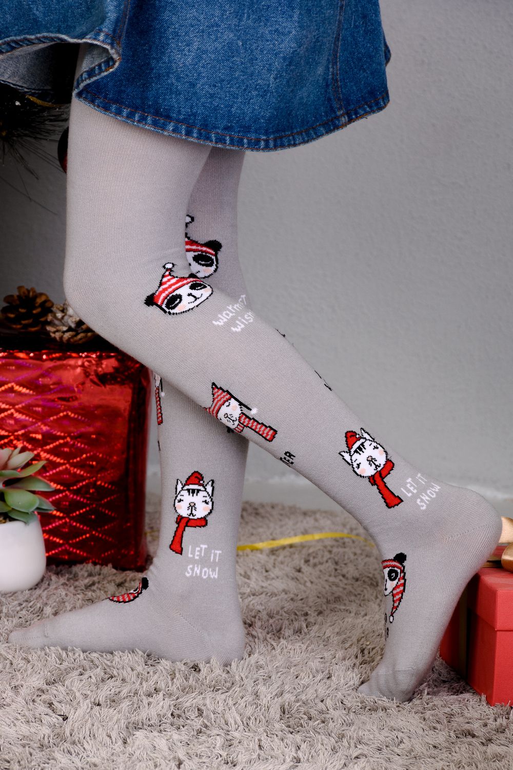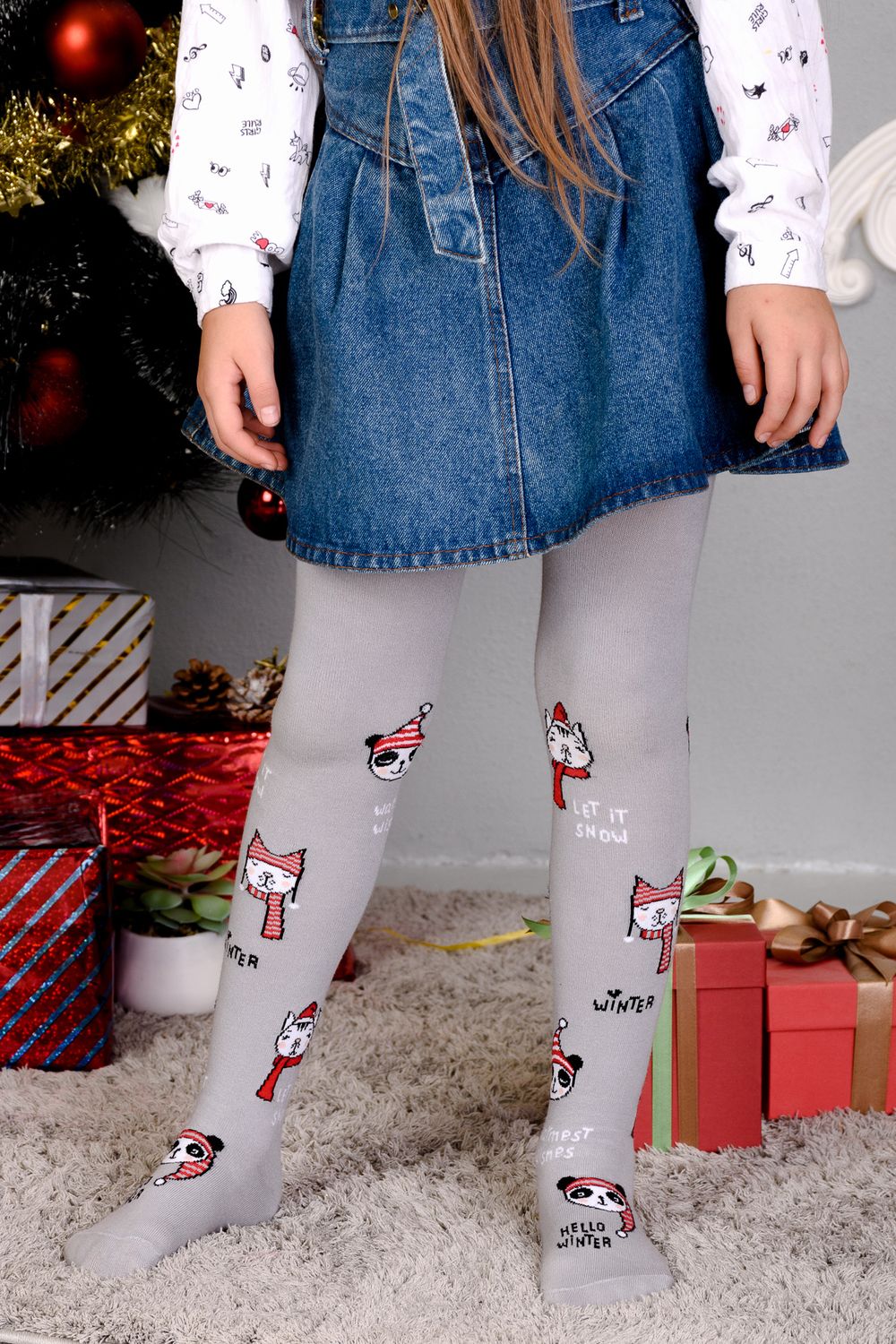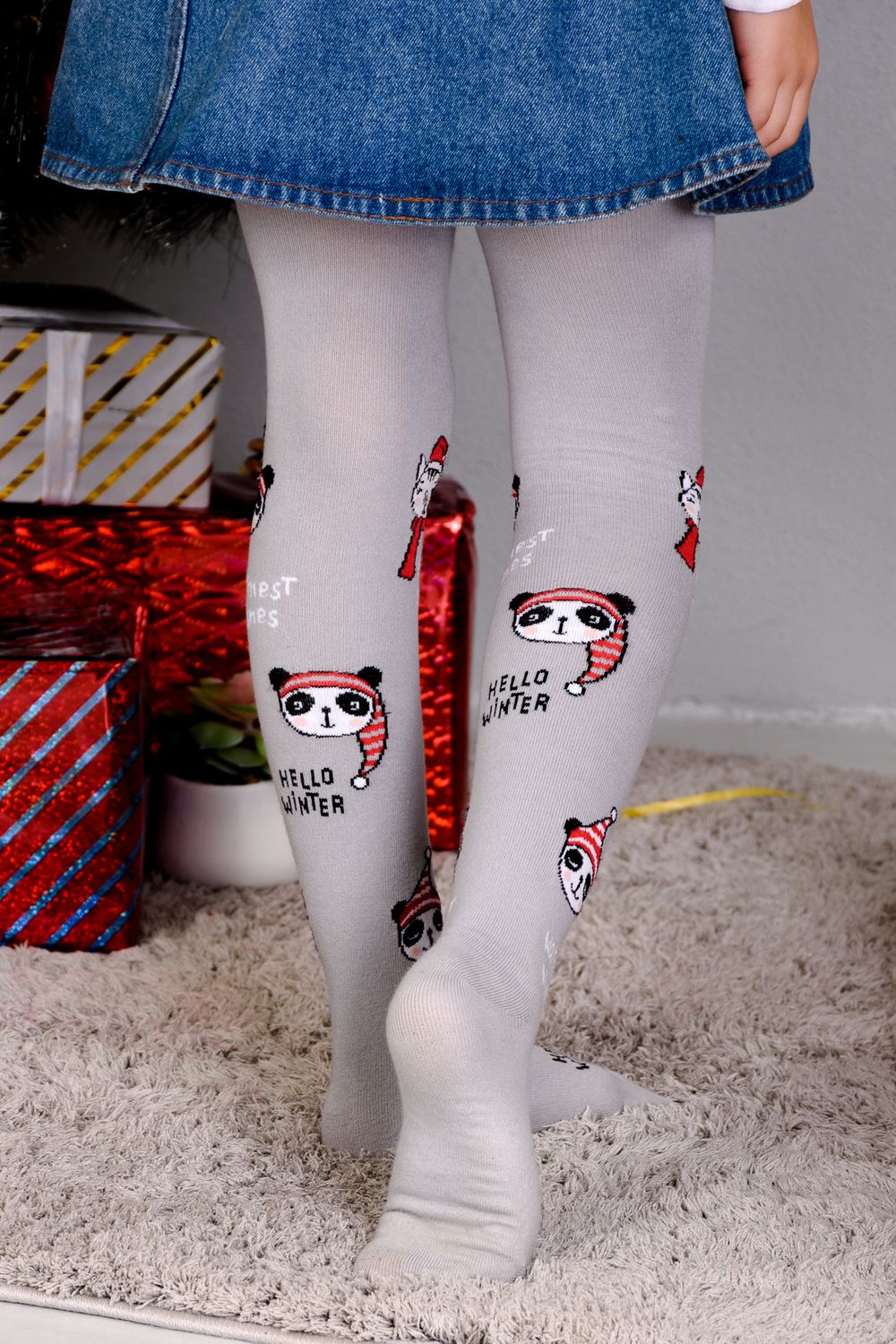 Однотонные детские колготки с новогодними рисунками и надписями