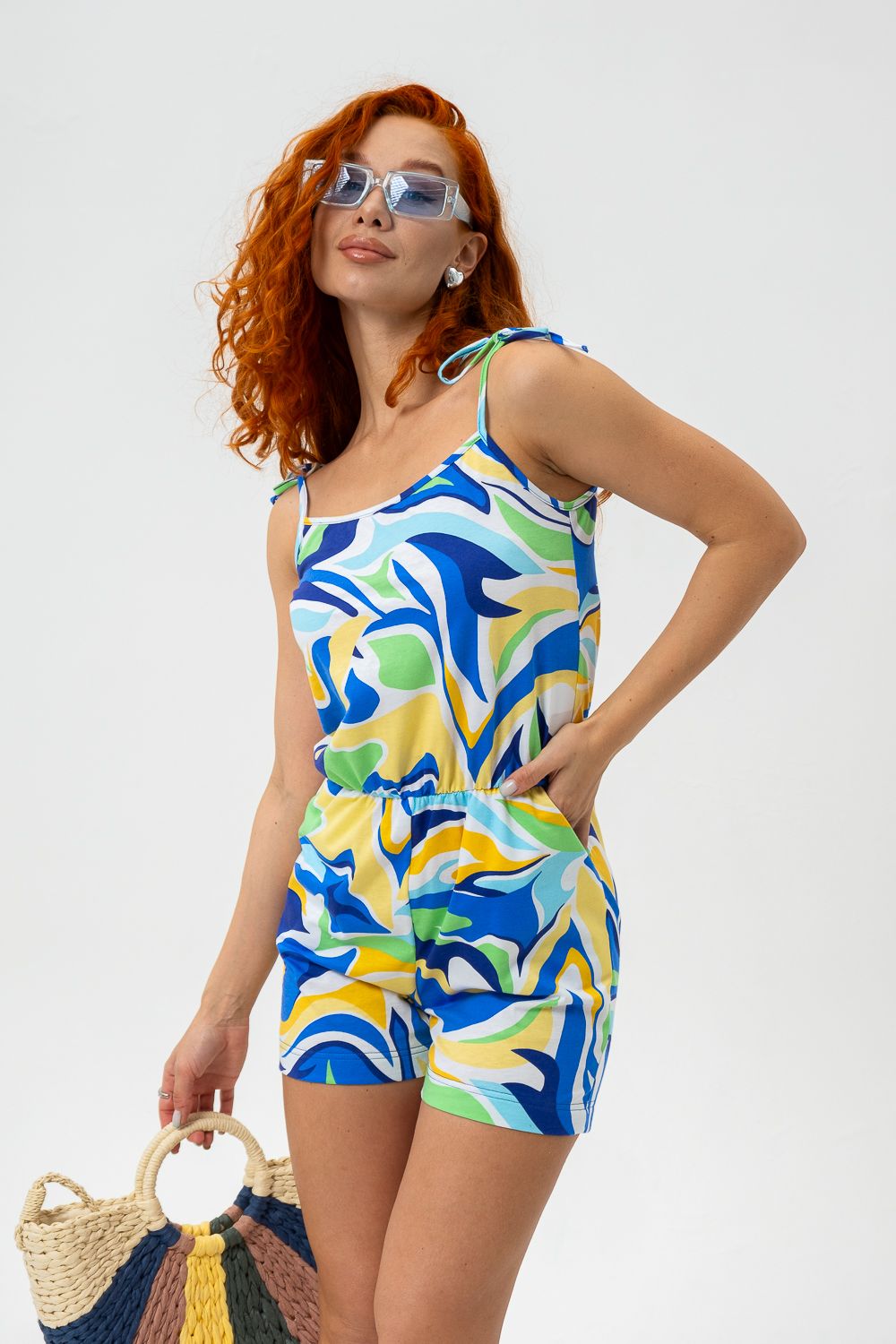 Комфортный и удобный комбинезон с шортами. Верх комбинезона выполнен в виде топа с бретельками на завязках. Шорты свободные с карманами. По линии талии для удобства вшита резинка. Комбинезон с шортами универсальный элемент летней одежды, в нём вы будете чувствовать себя комфортно в летний зной, вам будет удобно на отдыхе или проводить время на даче.