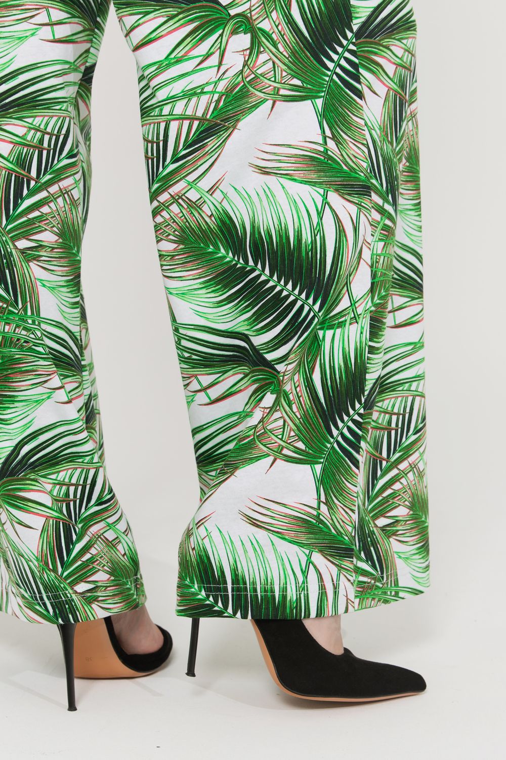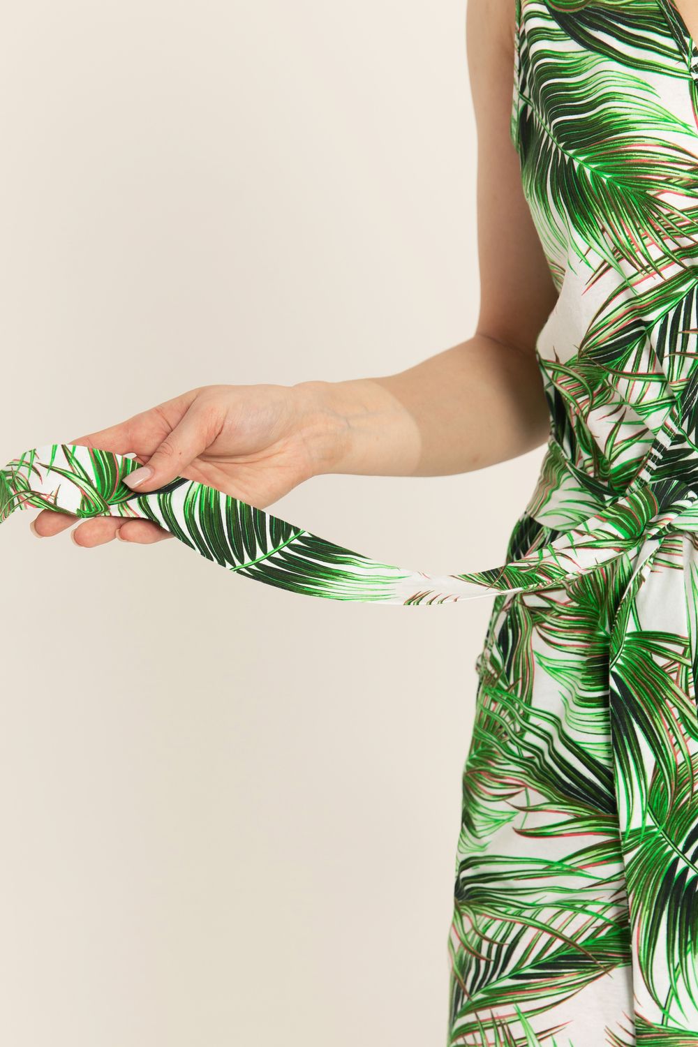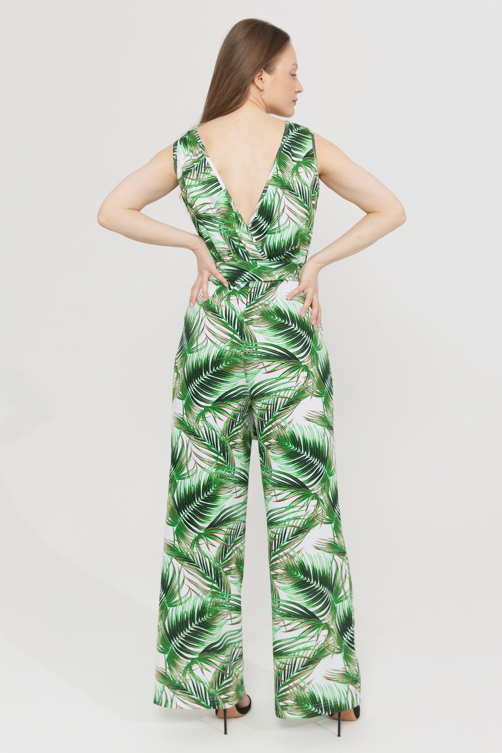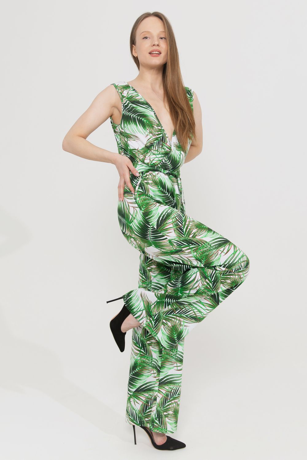 Стильный и универсальный элемент летней одежды - комбинезон с брюками. Верх комбинезона соединён с брюками, тем самым создаётся непрерывный образ сверху вниз, визуально удлиняя фигуру. Передняя и задняя части верха комбинезона состоят из двух отдельных элементов, которые соединены на запах, образуя элегантный V-образный вырез. По линии талии вшита резинка, а в комплекте есть пояс. Брюки свободные, прямые с боковыми карманами.