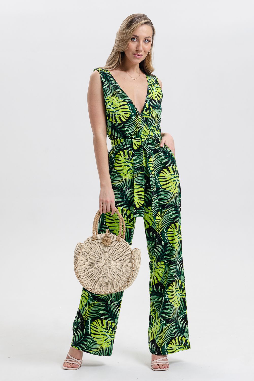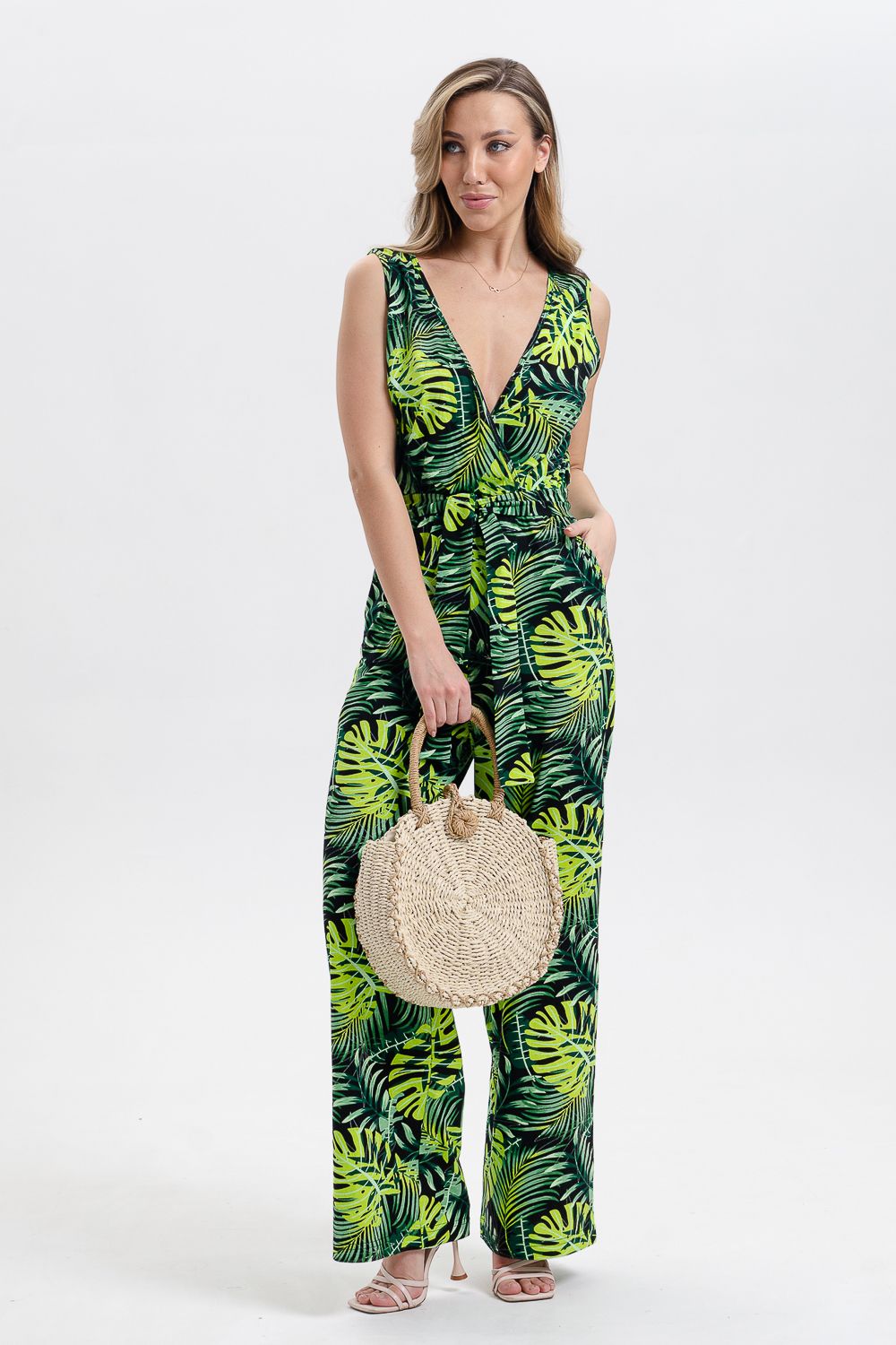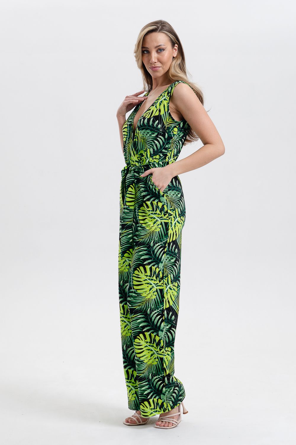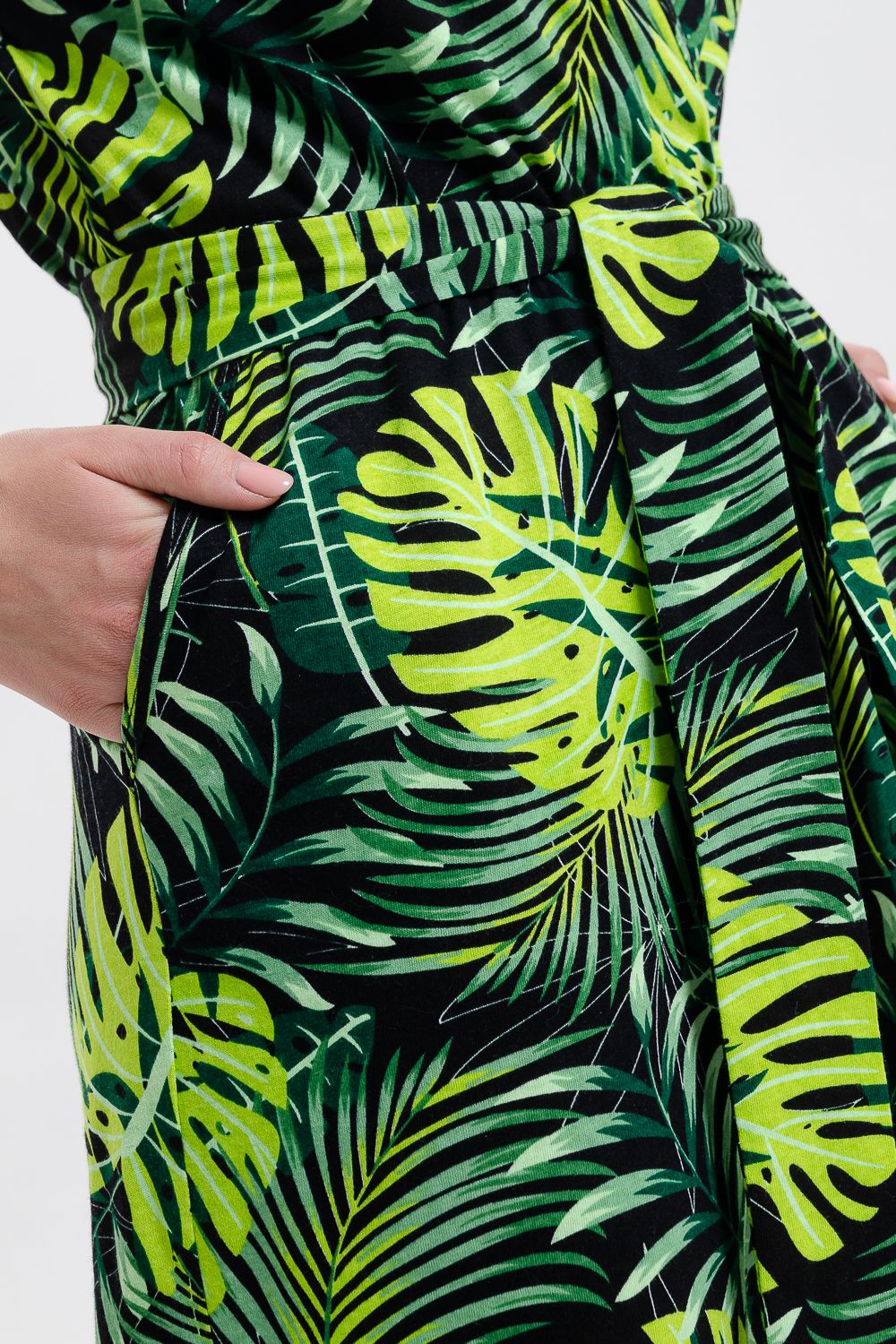 Стильный и универсальный элемент летней одежды - комбинезон с брюками. Верх комбинезона соединён с брюками, тем самым создаётся непрерывный образ сверху вниз, визуально удлиняя фигуру. Передняя и задняя части верха комбинезона состоят из двух отдельных элементов, которые соединены на запах, образуя элегантный V-образный вырез. По линии талии вшита резинка, а в комплекте есть пояс. Брюки свободные, прямые с боковыми карманами.