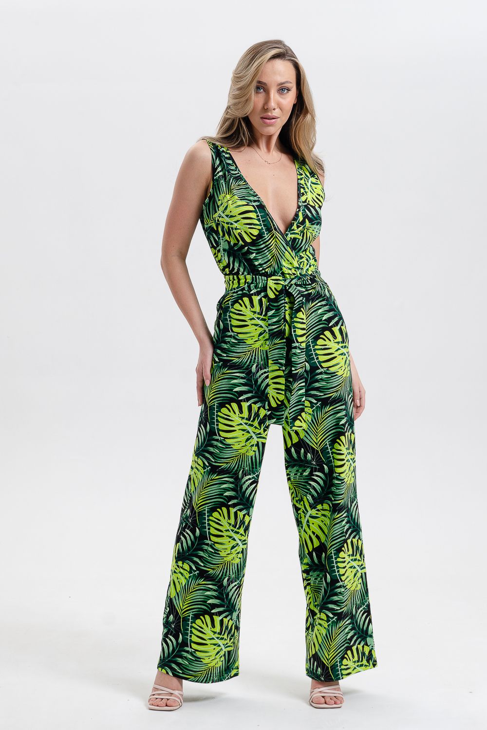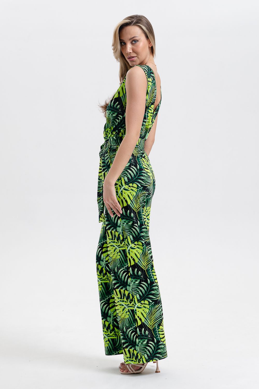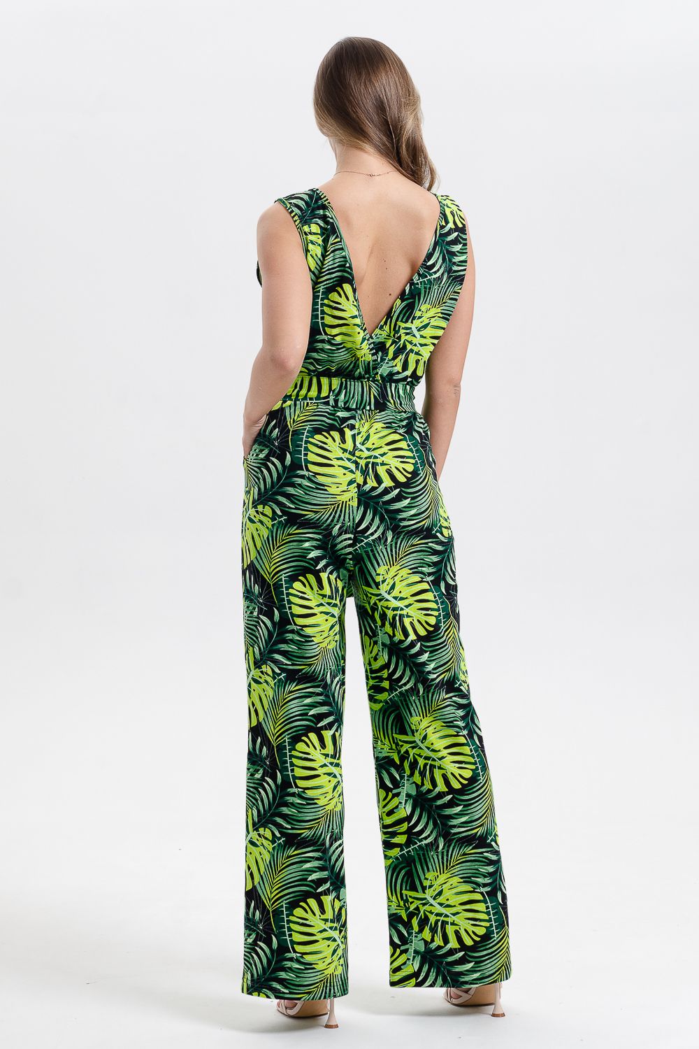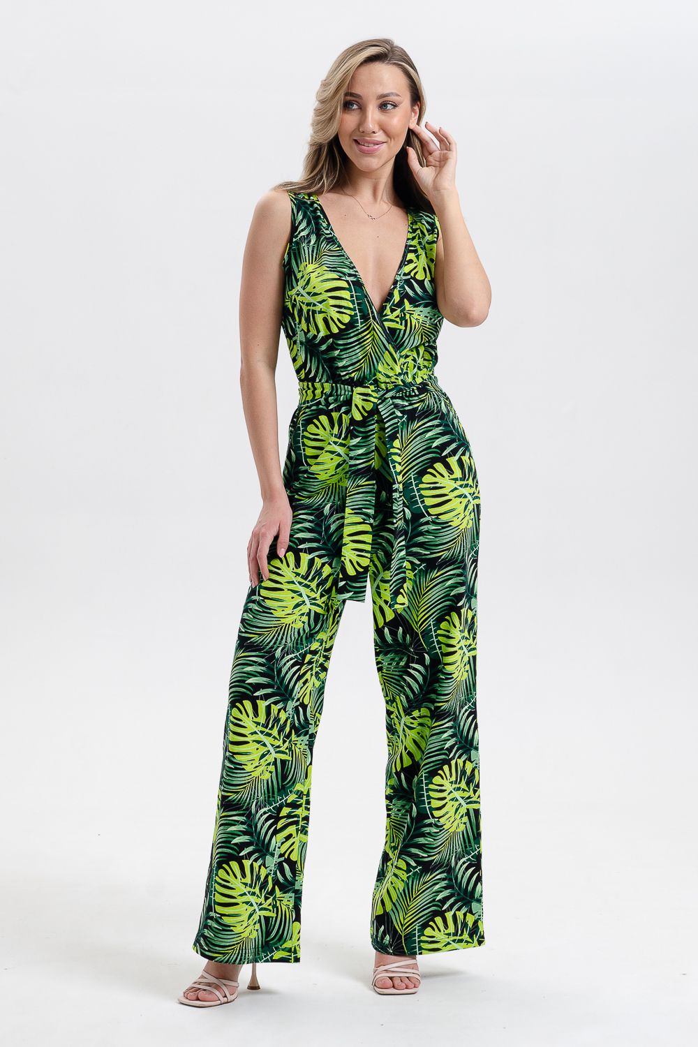 Стильный и универсальный элемент летней одежды - комбинезон с брюками. Верх комбинезона соединён с брюками, тем самым создаётся непрерывный образ сверху вниз, визуально удлиняя фигуру. Передняя и задняя части верха комбинезона состоят из двух отдельных элементов, которые соединены на запах, образуя элегантный V-образный вырез. По линии талии вшита резинка, а в комплекте есть пояс. Брюки свободные, прямые с боковыми карманами.