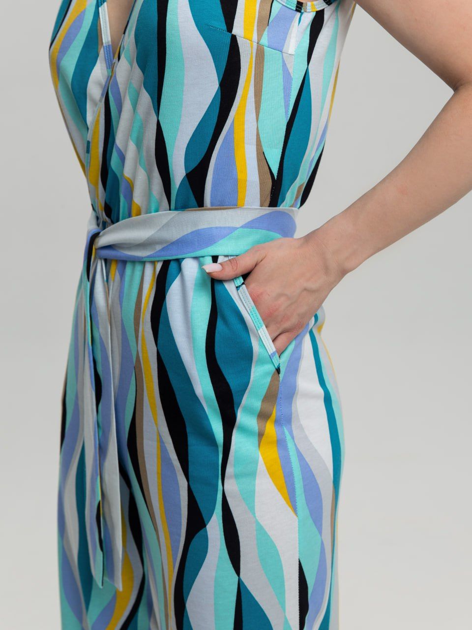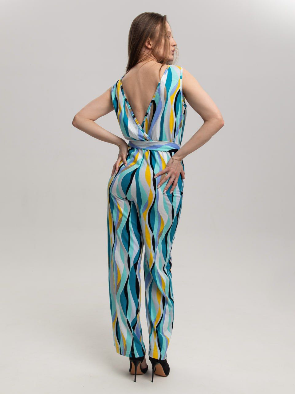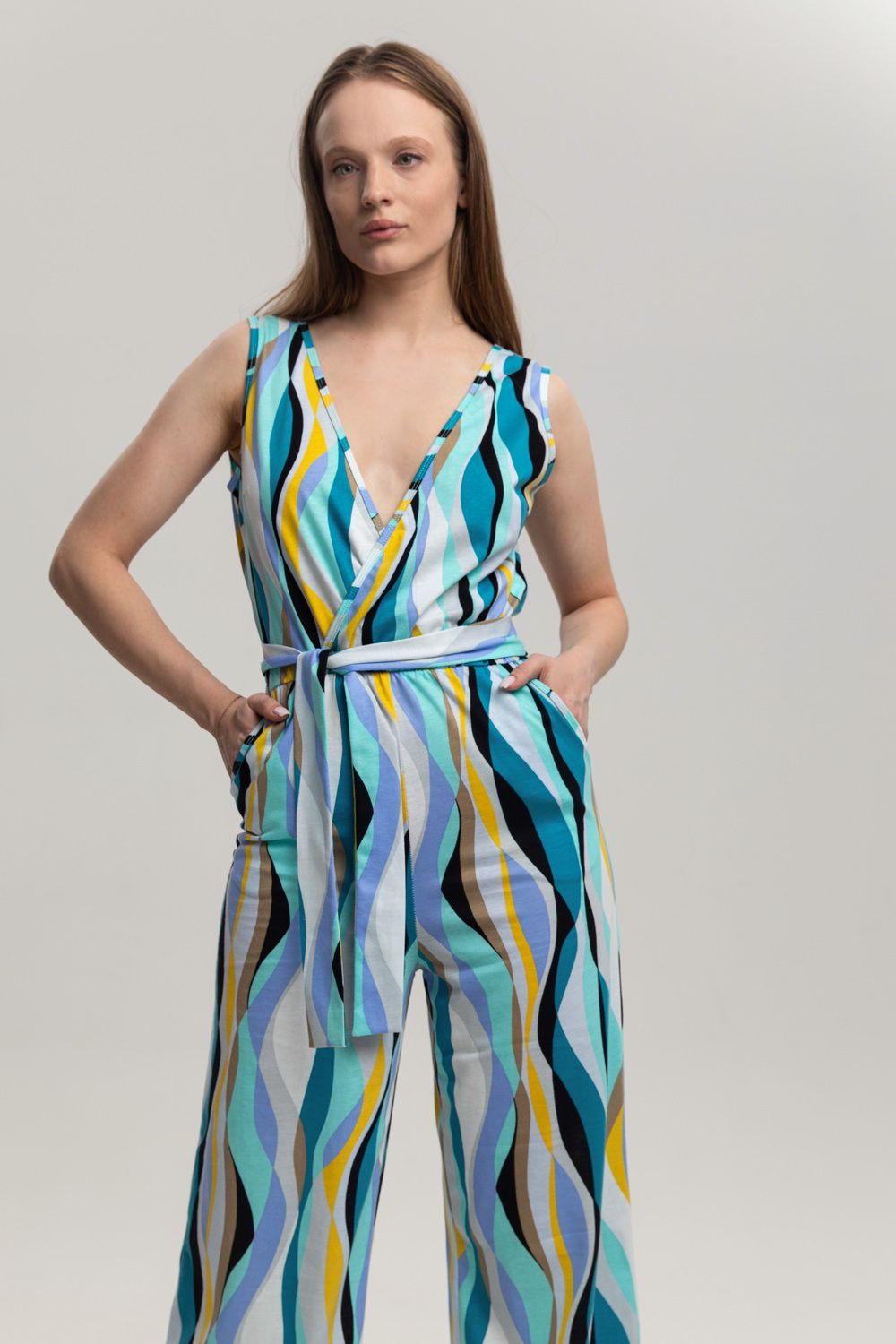 Стильный и универсальный элемент летней одежды - комбинезон с брюками. Верх комбинезона соединён с брюками, тем самым создаётся непрерывный образ сверху вниз, визуально удлиняя фигуру. Передняя и задняя части верха комбинезона состоят из двух отдельных элементов, которые соединены на запах, образуя элегантный V-образный вырез. По линии талии вшита резинка, а в комплекте есть пояс. Брюки свободные, прямые с боковыми карманами.