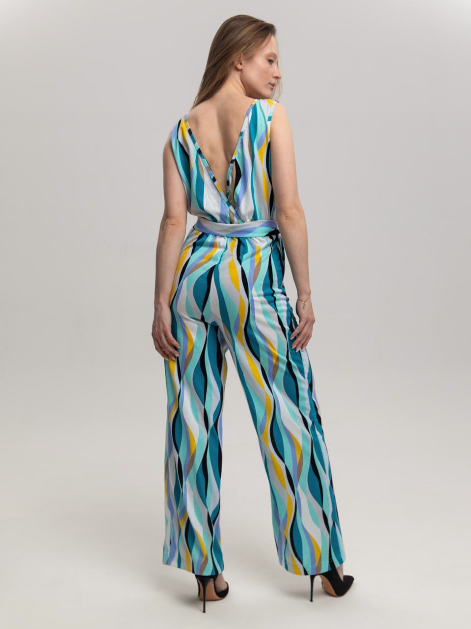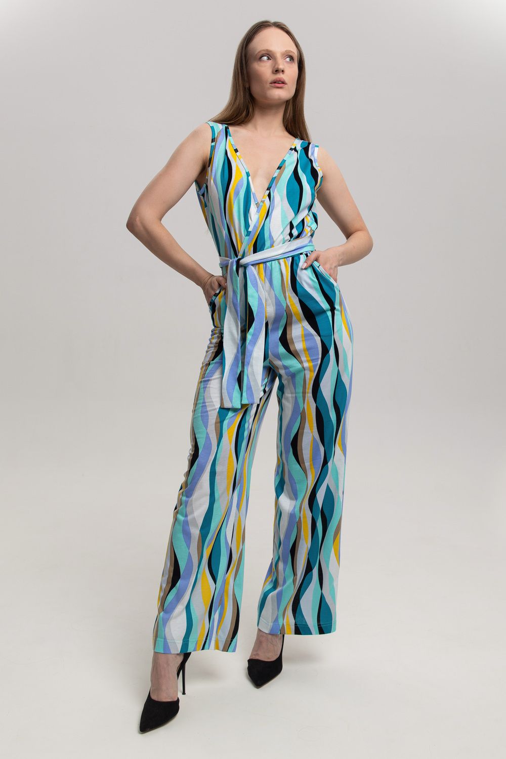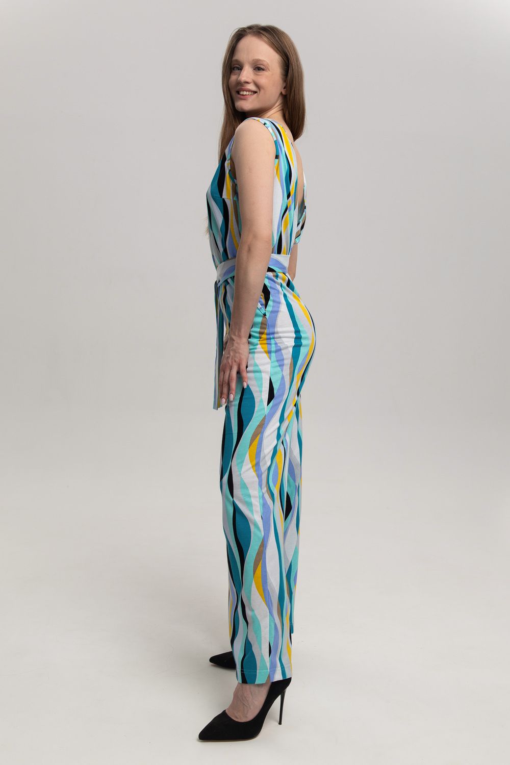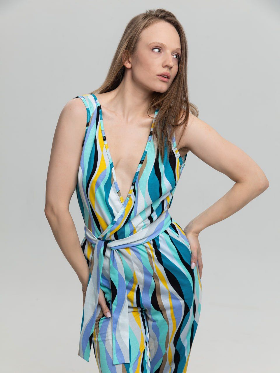 Стильный и универсальный элемент летней одежды - комбинезон с брюками. Верх комбинезона соединён с брюками, тем самым создаётся непрерывный образ сверху вниз, визуально удлиняя фигуру. Передняя и задняя части верха комбинезона состоят из двух отдельных элементов, которые соединены на запах, образуя элегантный V-образный вырез. По линии талии вшита резинка, а в комплекте есть пояс. Брюки свободные, прямые с боковыми карманами.