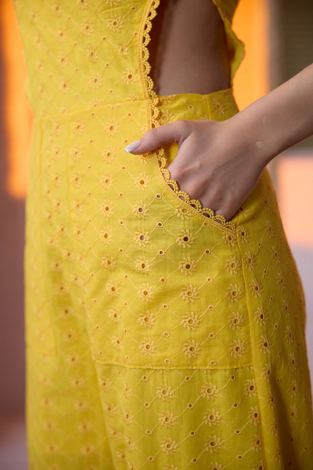 Стильный комбинезон из ткани - шитье. Длина ниже колена. Боковые карманы, фигурные вырезы на талии.