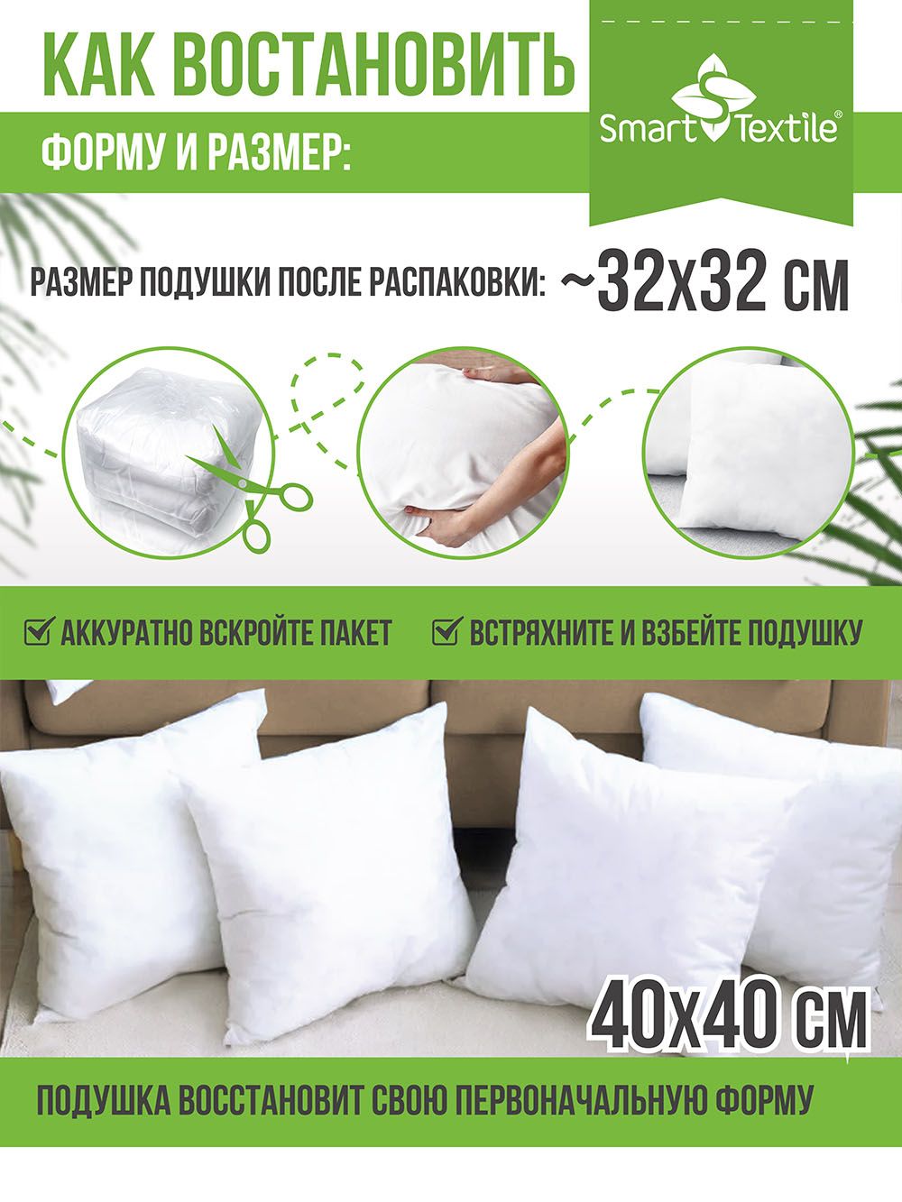 Практичность: В комплекте 4 подушки размером 40х40 см каждая. Подушки быстро восстанавливают форму после распаковки и сохраняют свои размеры и упругость.