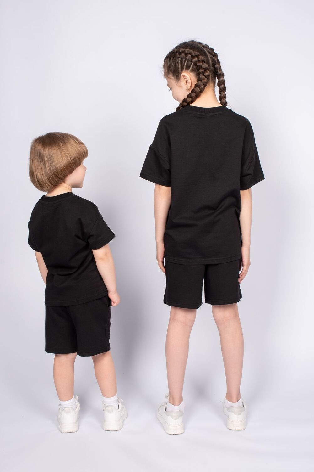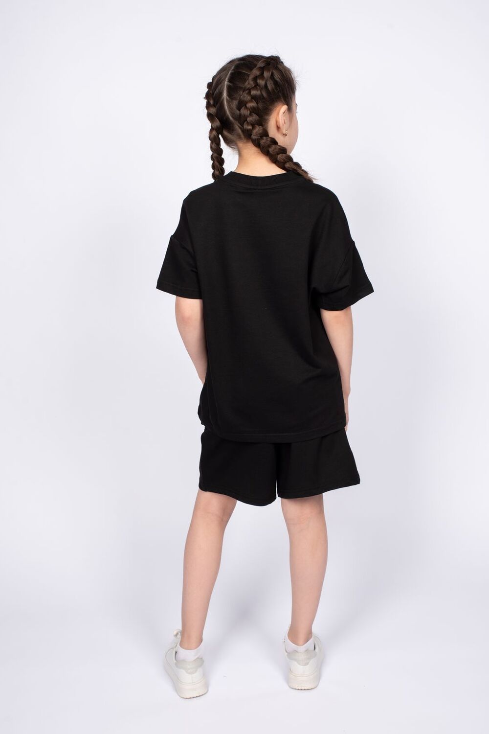 Комплект детский, состоящий из футболки и шорт. Футболка оверсайз с фигурным низом и спущенным рукавом. Горловина круглая, обработана воротником из кашкорсе. Горловина спинки внутри укреплена бейкой из кулирки. Низ изделия и рукава обработан швом вподгибку. Шорты прямого силуэта. Отрезной пояс, в цвет изделия, из основного полотна с эластичной тесьмой внутри. По поясу шорт вставлен плоский утягивающий шнурок. Длина шнурка = длина пояса + 45 см для возможности завязывания. На передней половинке шорт карманы с отрезным бочком. Низ изделия обработан швом в подгибку.