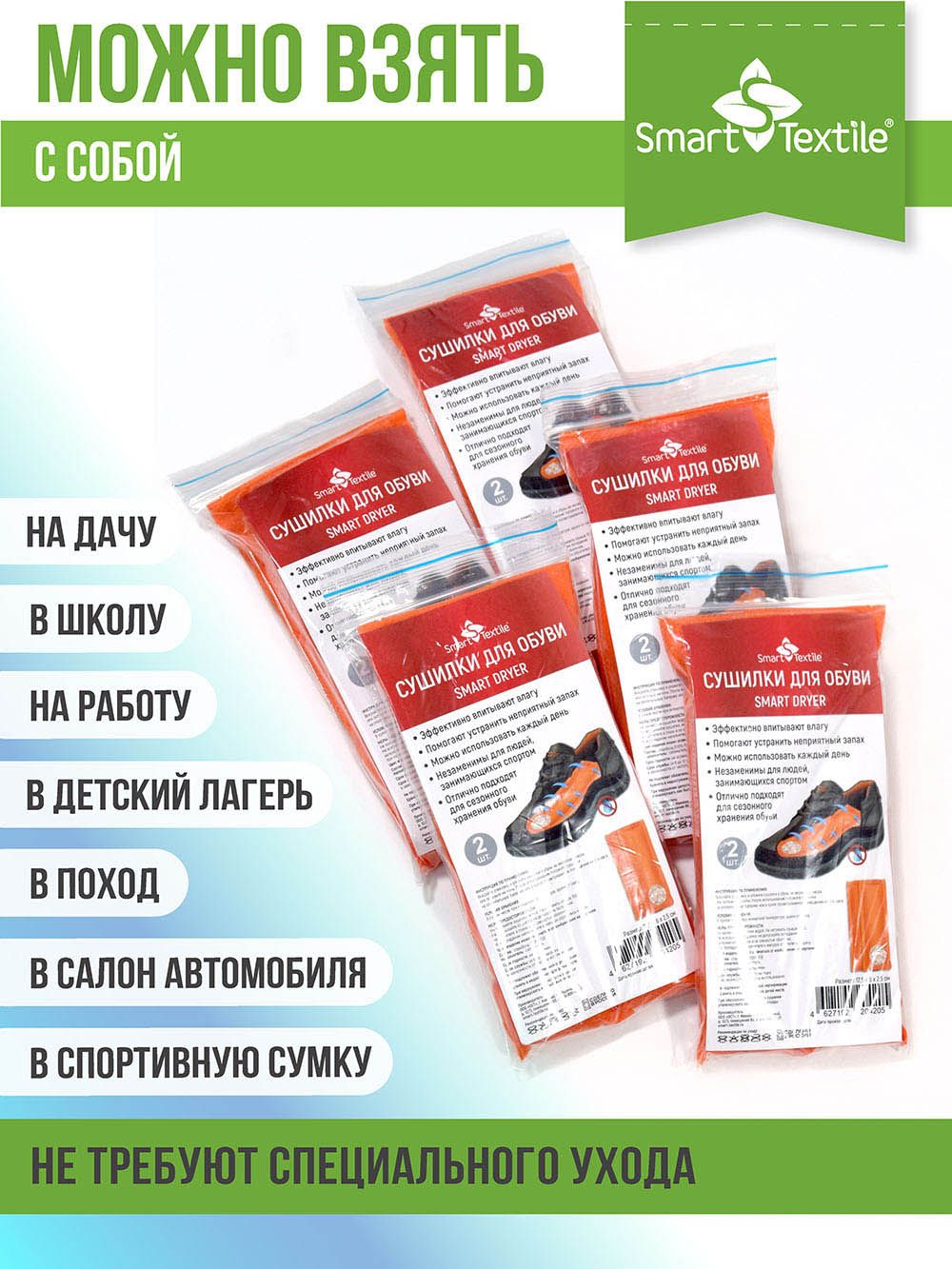 Силикагель не только отлично впитывает влагу, пот, но и устраняет неприятные запахи, предотвращая распространение бактерий и микроорганизмов. Все это значительно продлевает срок службы обуви и вносит определенную долю комфорта. Этим сушилка для обуви «Smart Dryer» выгодно отличается от многих электроприборов, разработанных специально для сушки обуви. Кроме того, она просто незаменима, когда условия пользования электрической или тепловой сушилкой ограничены. В офисе, например, в образовательном учреждении, общественной приёмной и т.д.