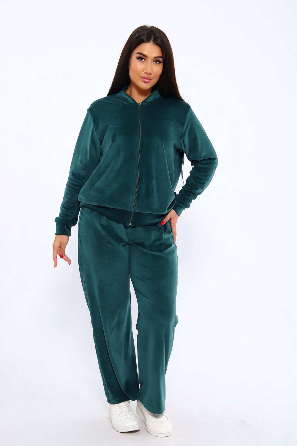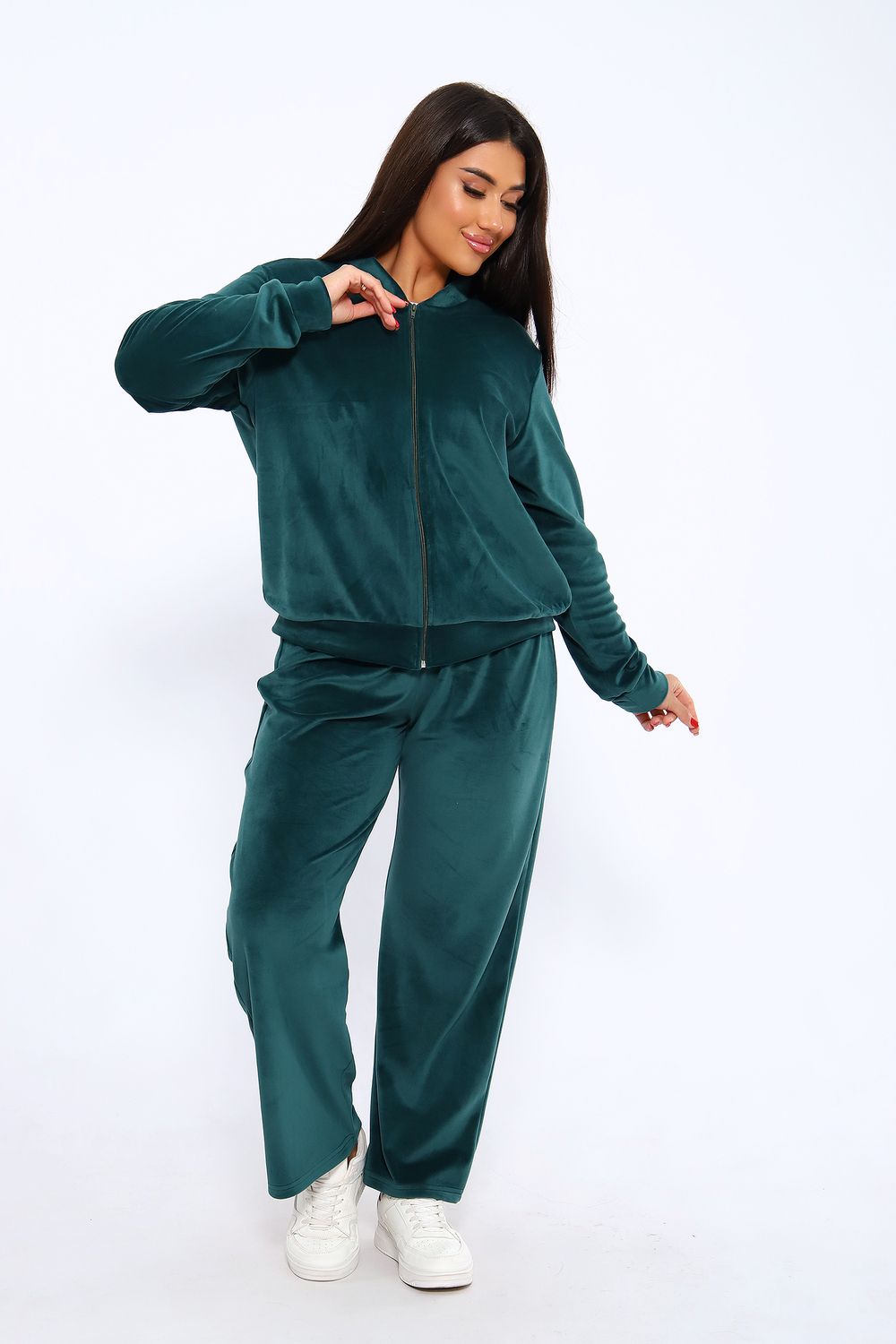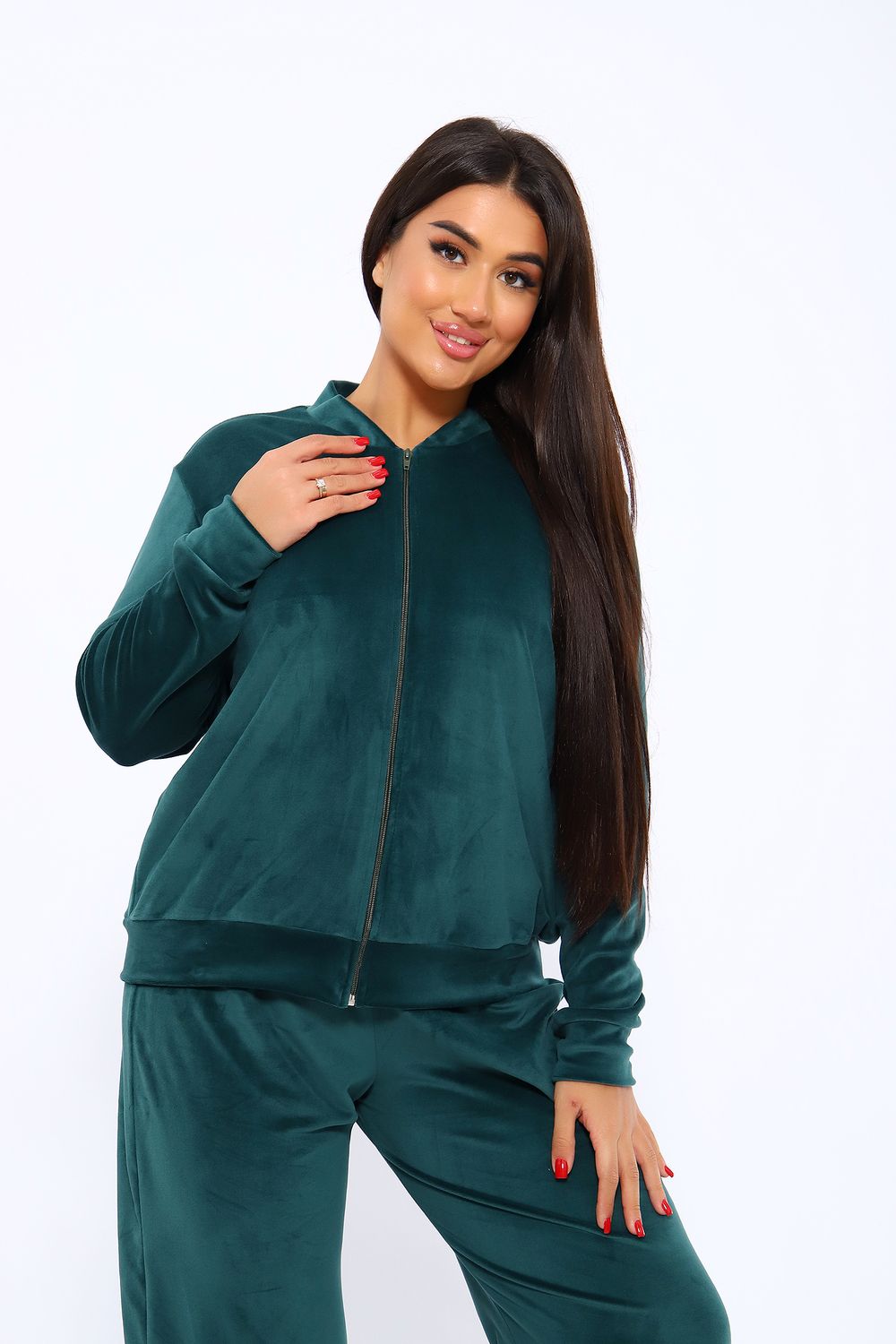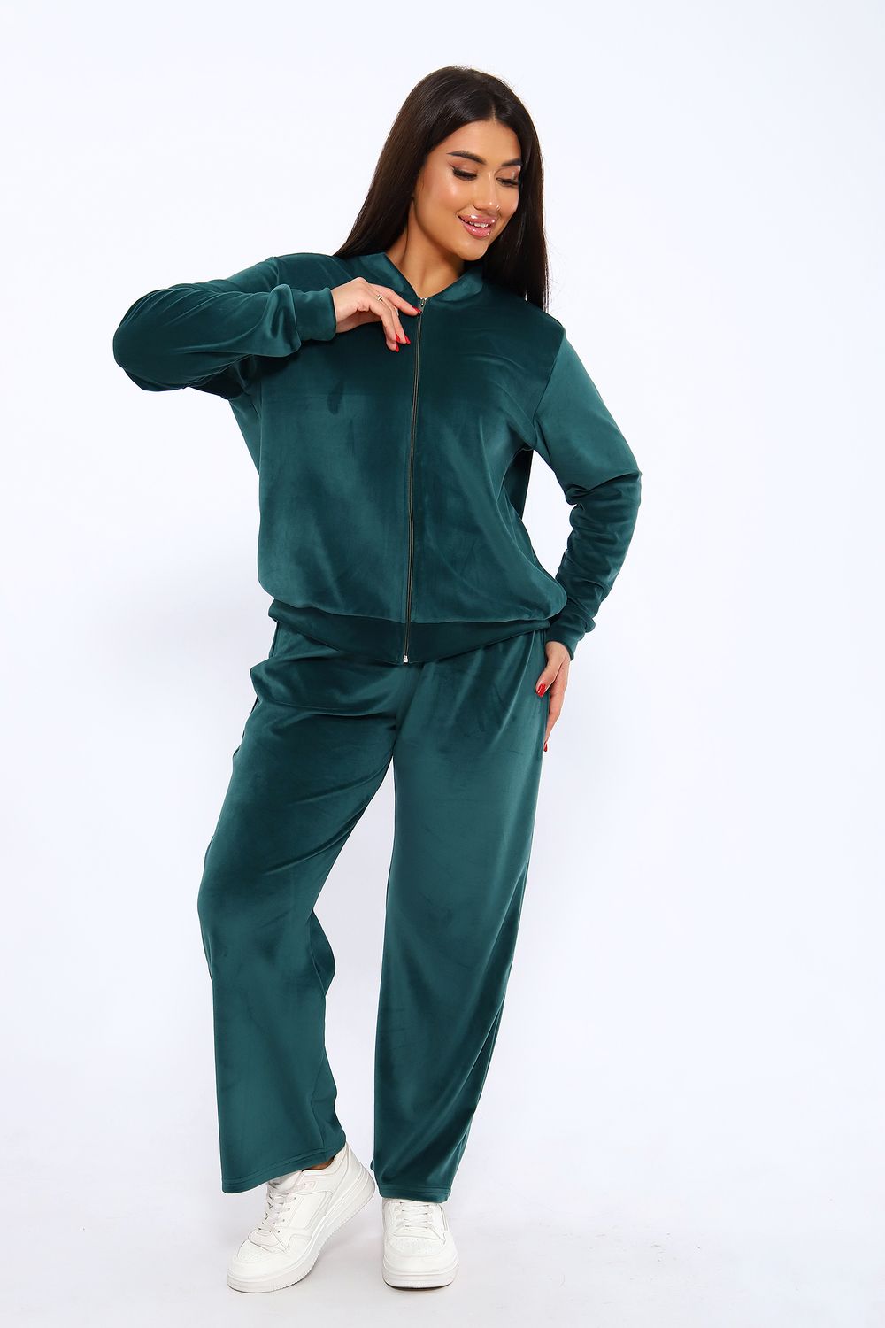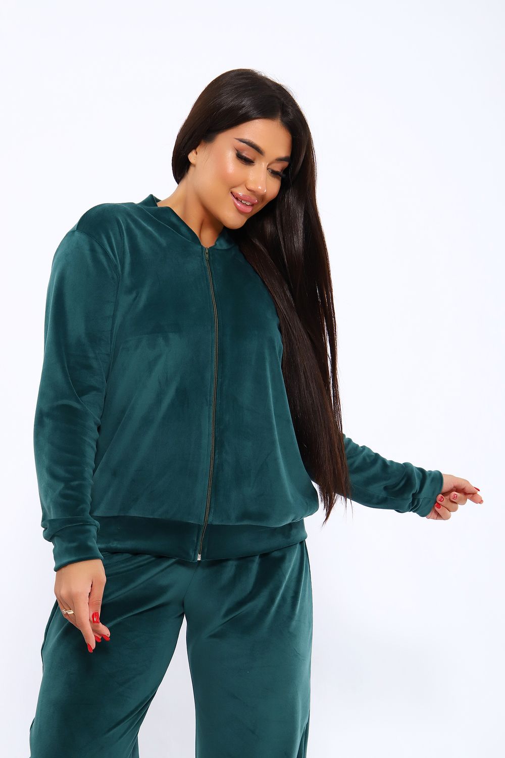 Костюм женский из мягкого велюра состоит из брюк и бомбера. Брюки имеют идеальную посадку, бомбер свободного кроя. Костюм идеально подойдет как для дома, так и для отдыха и прогулок.