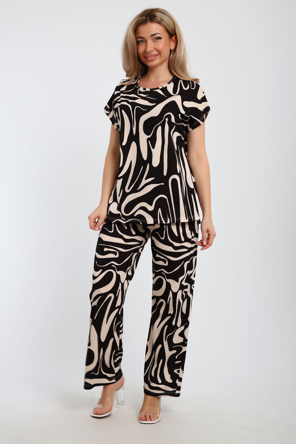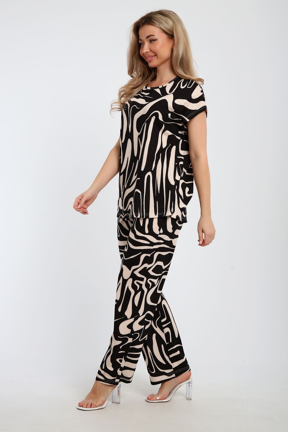 Костюм женский выполнен из кулирки 100% хлопок, состоит из футболки со спущенным плечом и брюк. Брюки свободного кроя на поясе, горловина футболки обработана узким кантом. Костюм очень комфортный, удобный, идеально подойдет как для прогулок, так и для дома и отдыха.