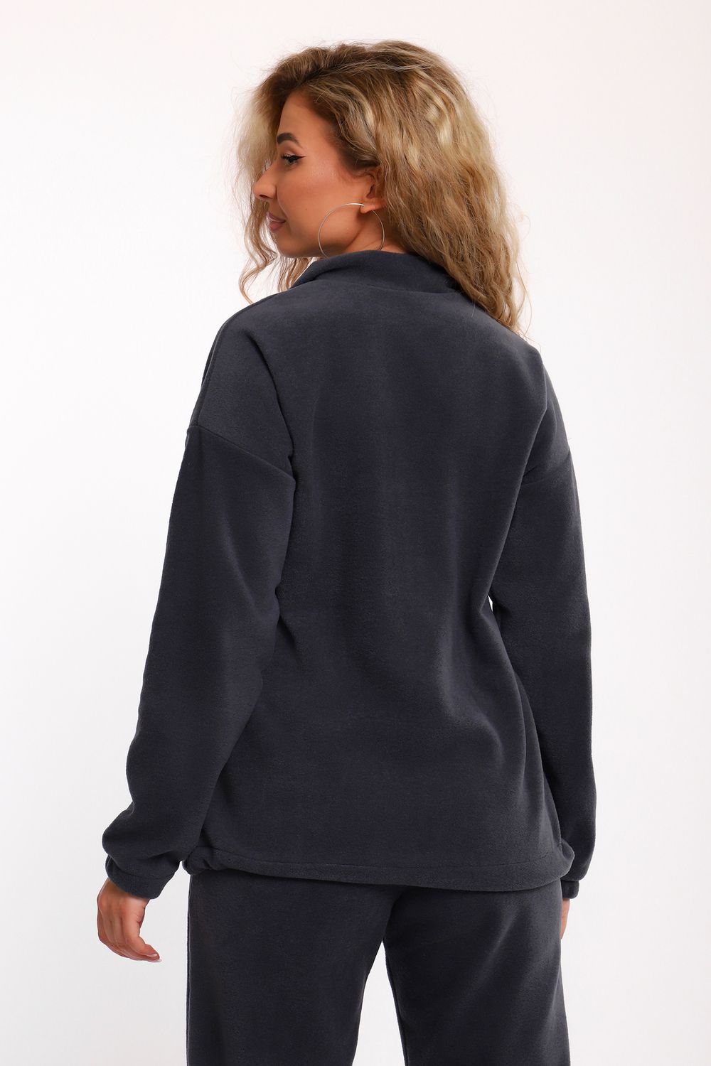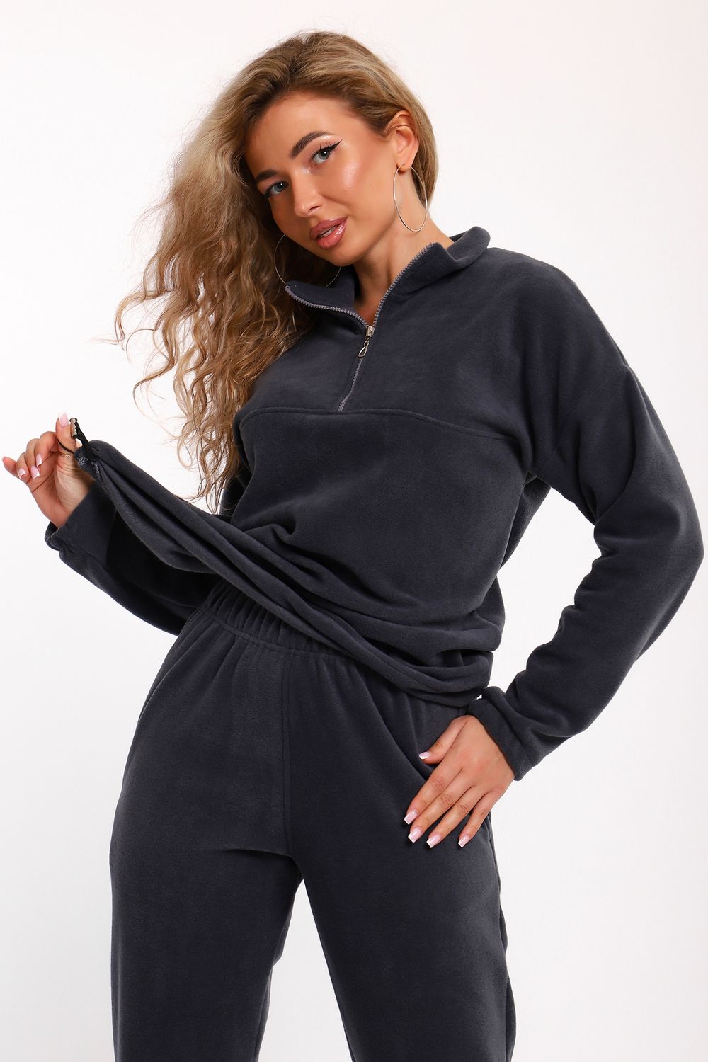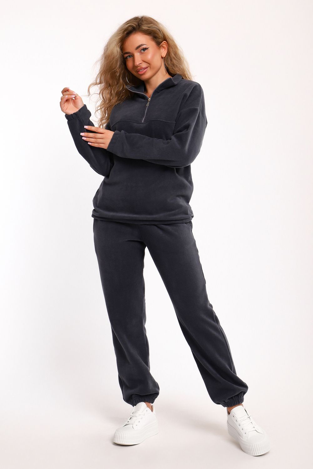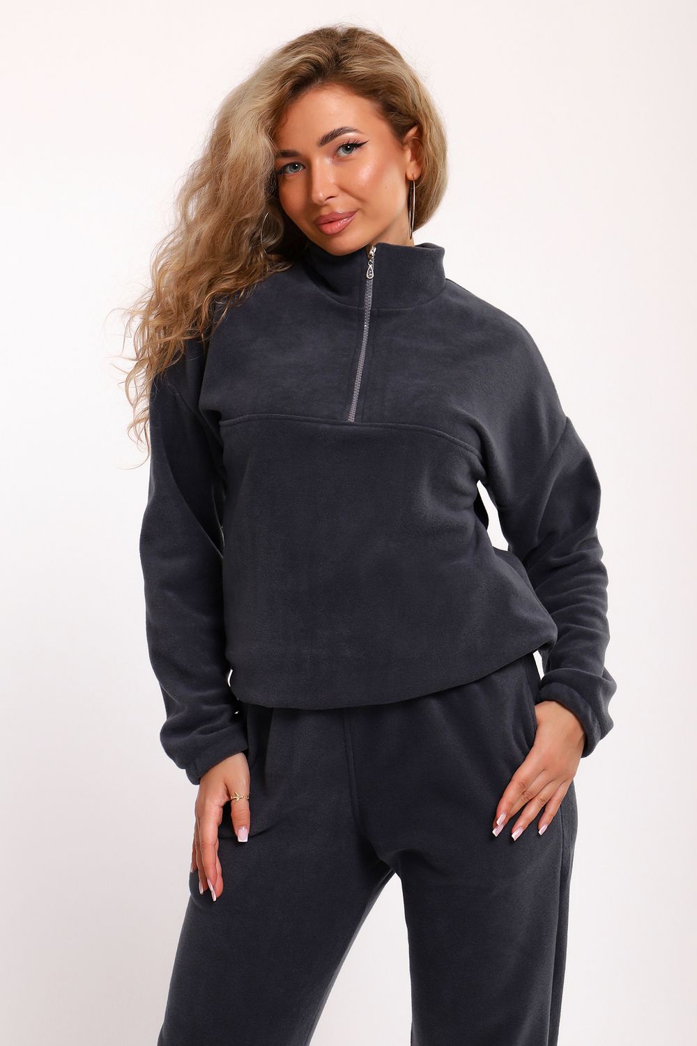 Костюм женский флисовый состоит из толстовки и брюк. Толстовка с кокеткой, на молнии, с воротником-стойкой, рукав спущенный внизу на резинке. Брюки с карманами, внизу на резинке. Костюм мягкий, теплый, удобный, идеально подойдет для прогулок и отдыха в прохладное время года. Молния может отличаться по цвету.