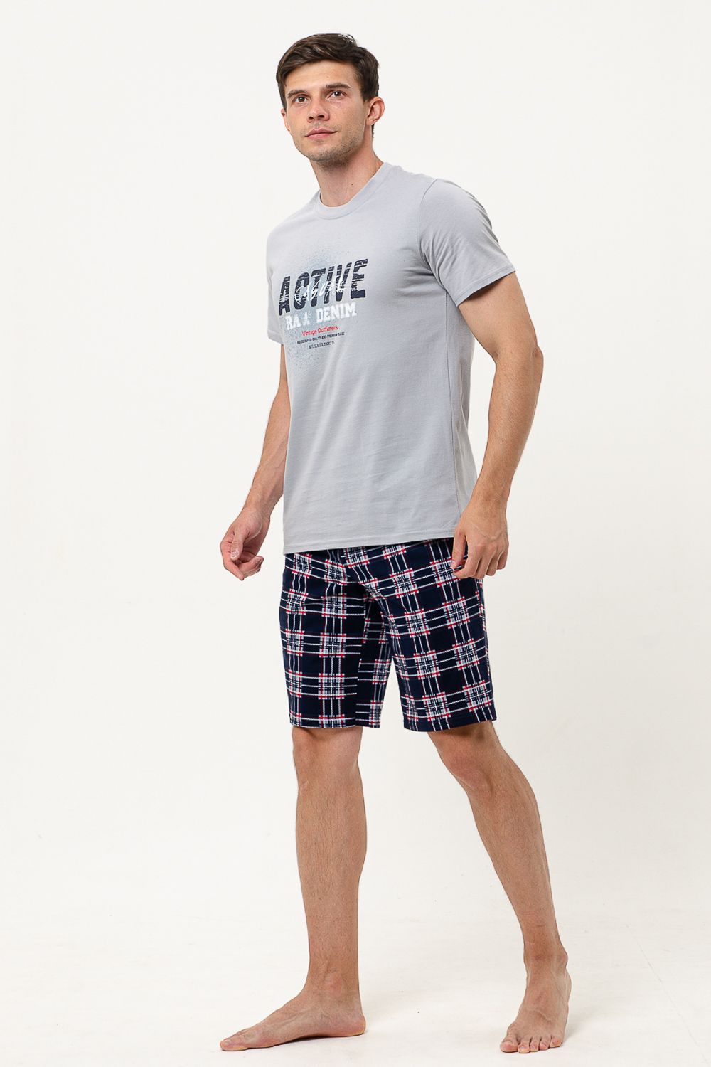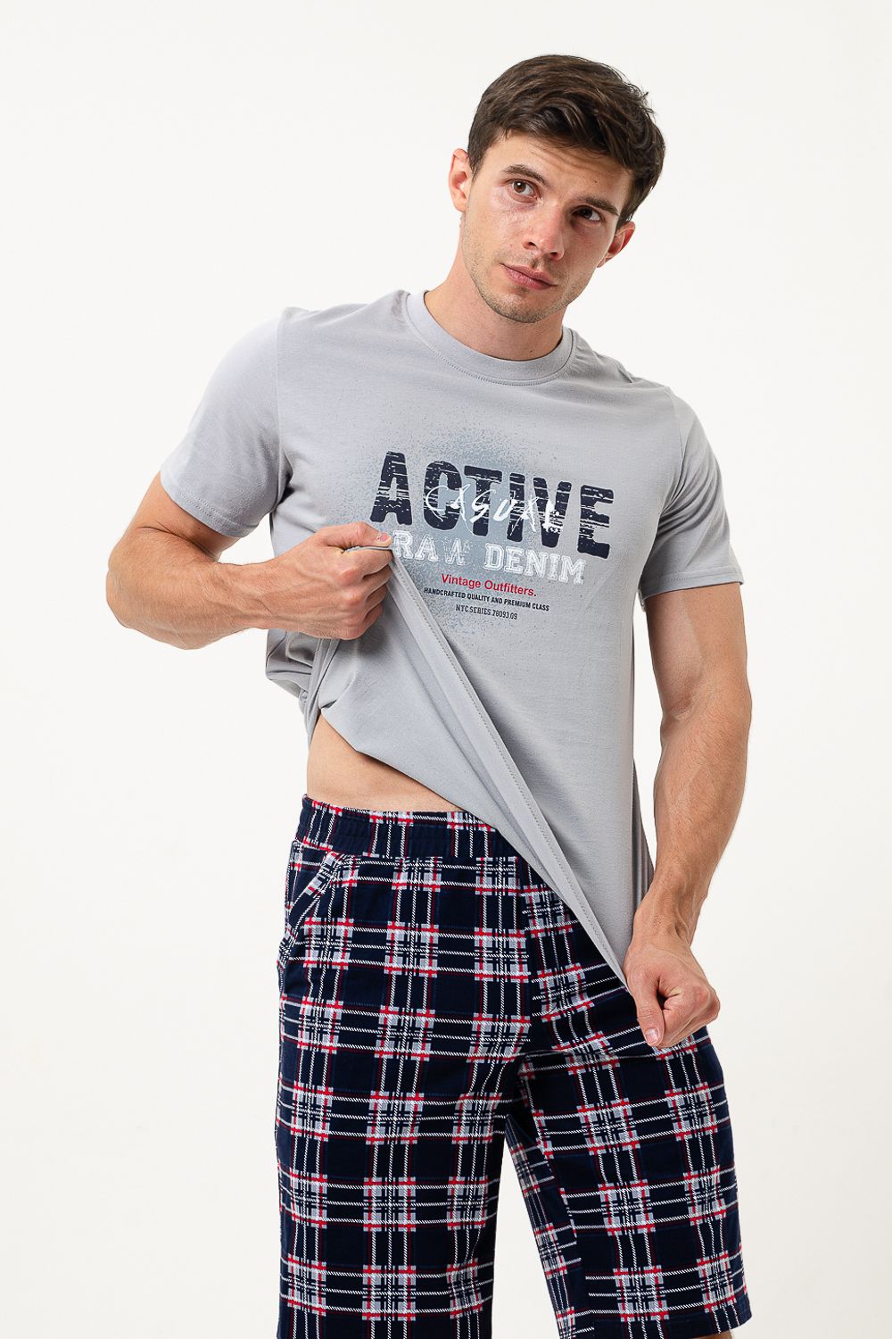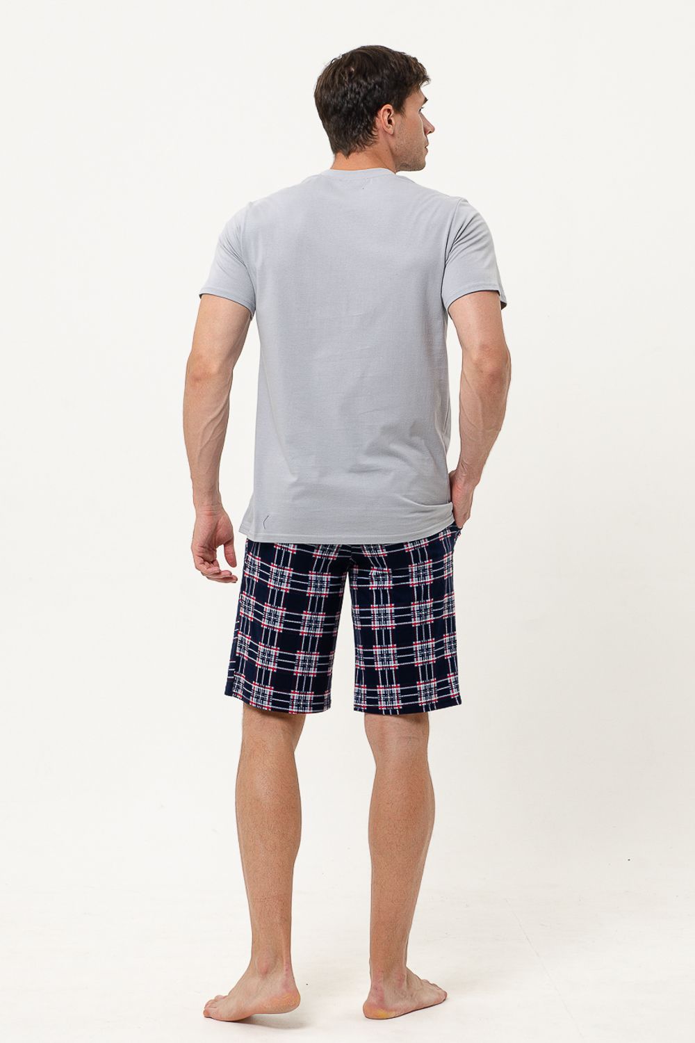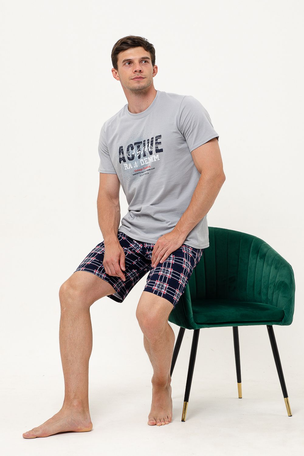 Мужской домашний комплект прямого кроя из натуральной ткани 100 % хлопка. Футболка с классической горловиной и коротким рукавом. Шорты с карманами держатся на резинке. Ткань дышащая, легкая.