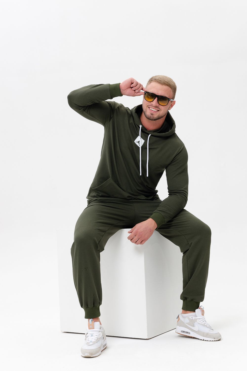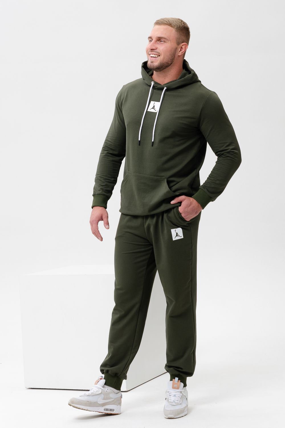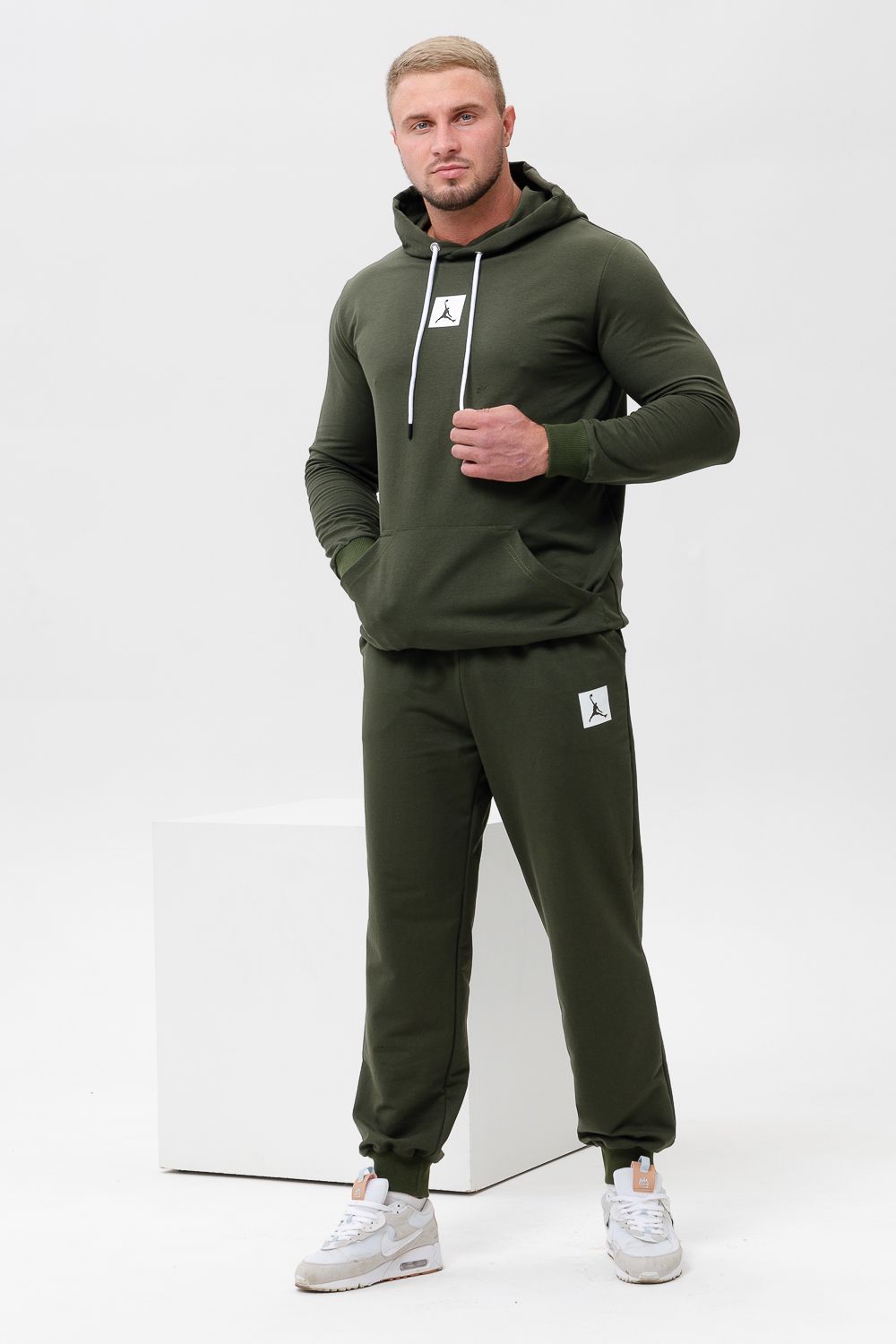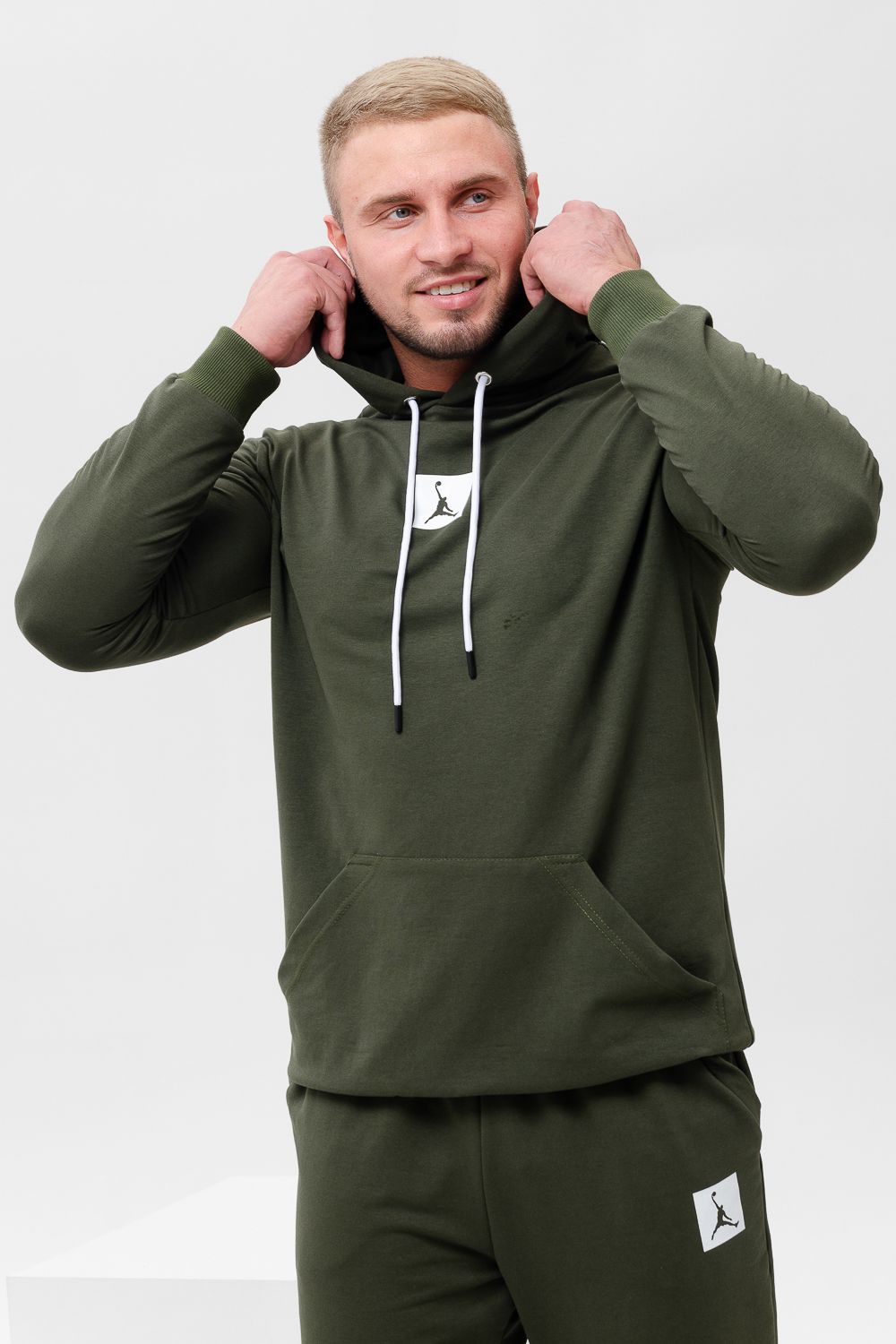 "Джордан". Стильный, однотонный классический спортивный костюм отлично подойдет для тренировок дома и игр на улице. Этот модный, мягкий трикотажный костюм с прямыми и аккуратными швами. Толстовка прямого силуэта с двойным капюшоном и карманом кенгуру. Брюки на манжете с карманами в боковых швах.