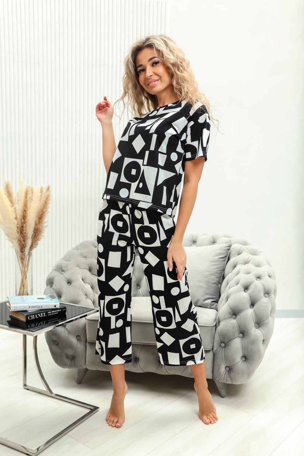 Домашний комплект с брюками - кюлотами и футболкой. Брюки с карманами. Длина 7/8. Футболка с коротким рукавом прямого силуэта.