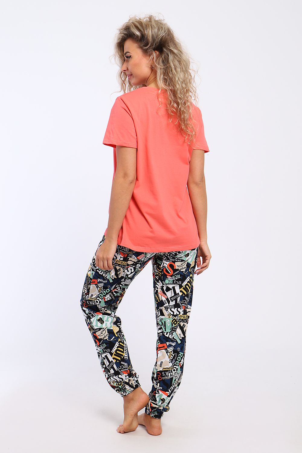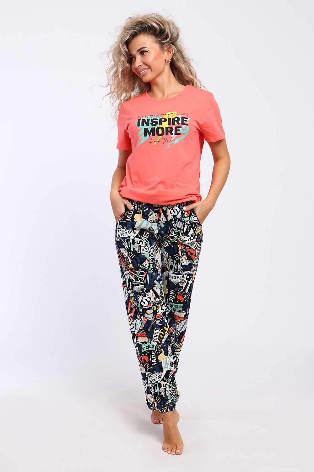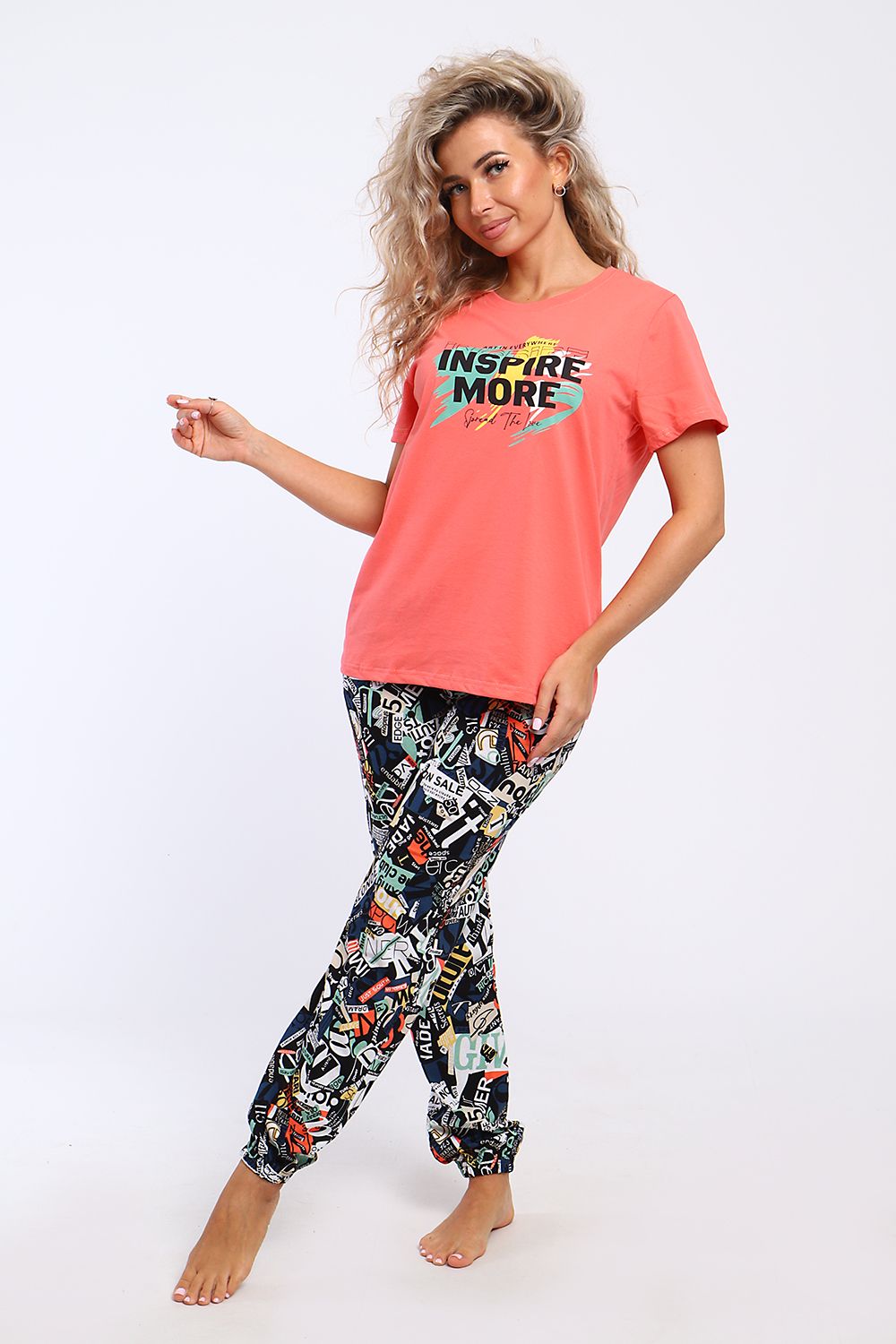 Костюм состоит из футболки и брюк. Футболка свободная с короткими рукавами. Брюки с карманами на резинке внизу.