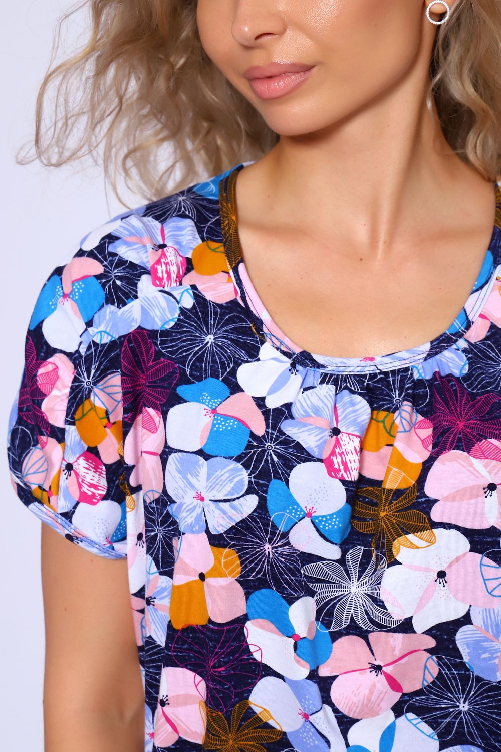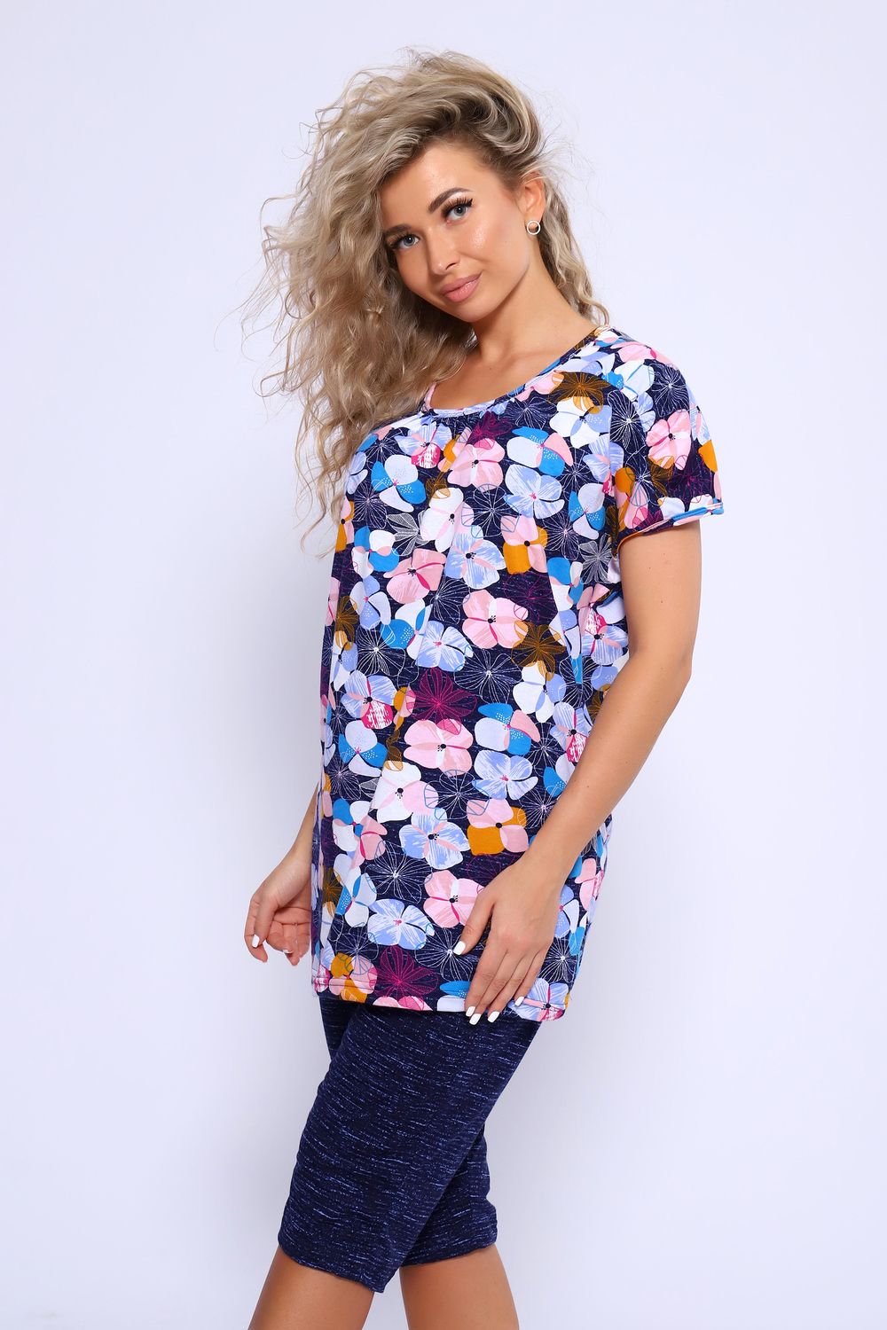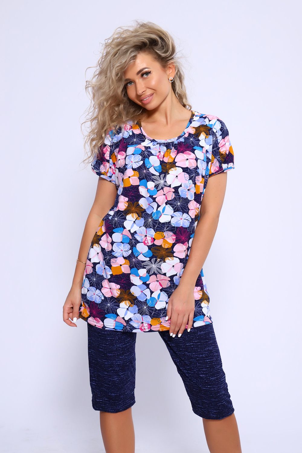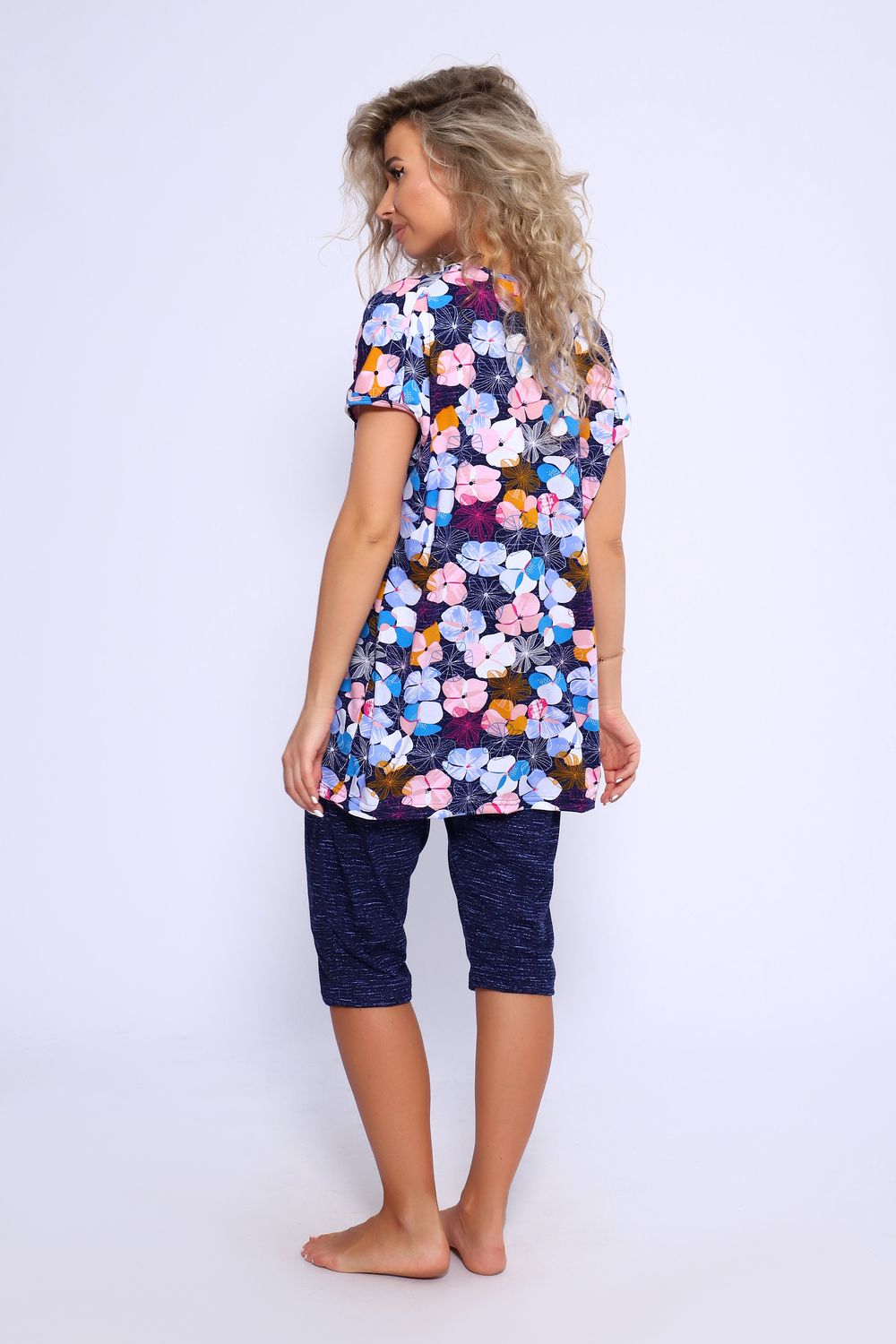 Женский костюм состоит из туники и бридж. Туника свободного кроя со сборкой на плечах и по центру выреза горловины. Бриджи с карманами по бокам.
