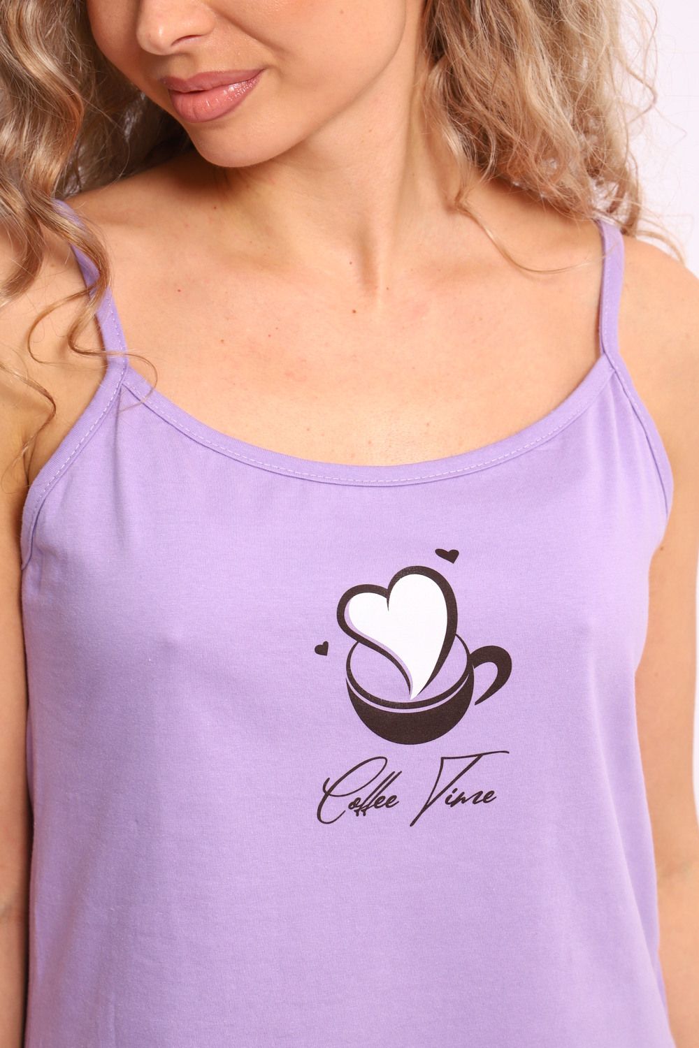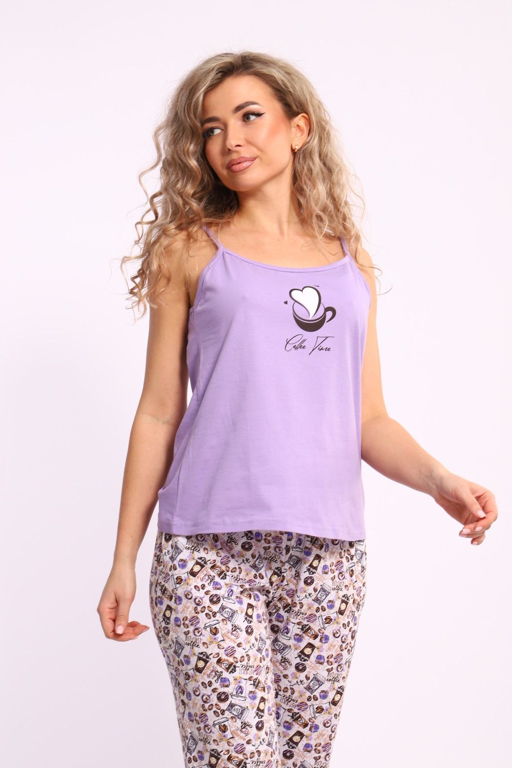 Костюм женский с брюками. Данная модель выполнена из трикотажного полотна кулирка (хлопок 100%). Майка на тонких бретелях, на полочке присутствует принт. Брюки свободного покроя с боковыми карманами и вшивным поясом. Отличная модель для домашнего отдыха.