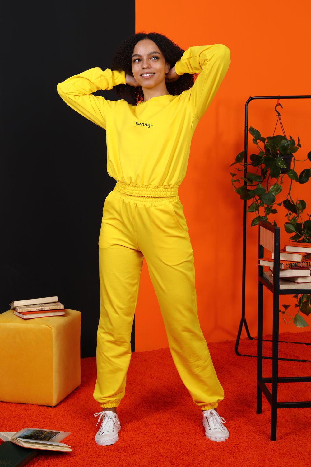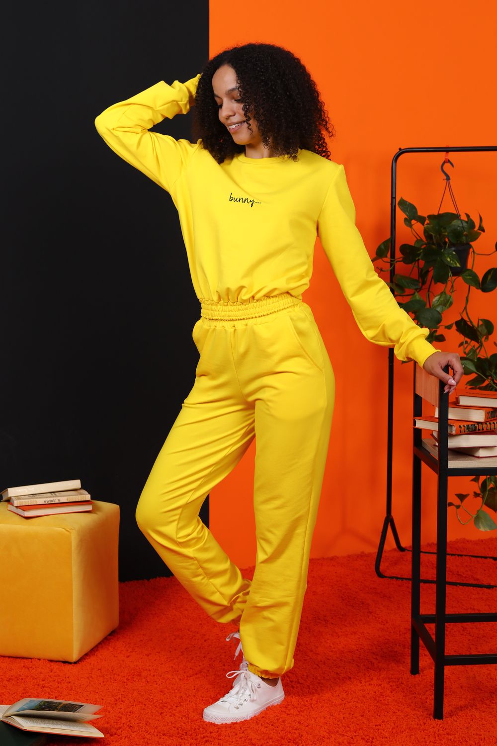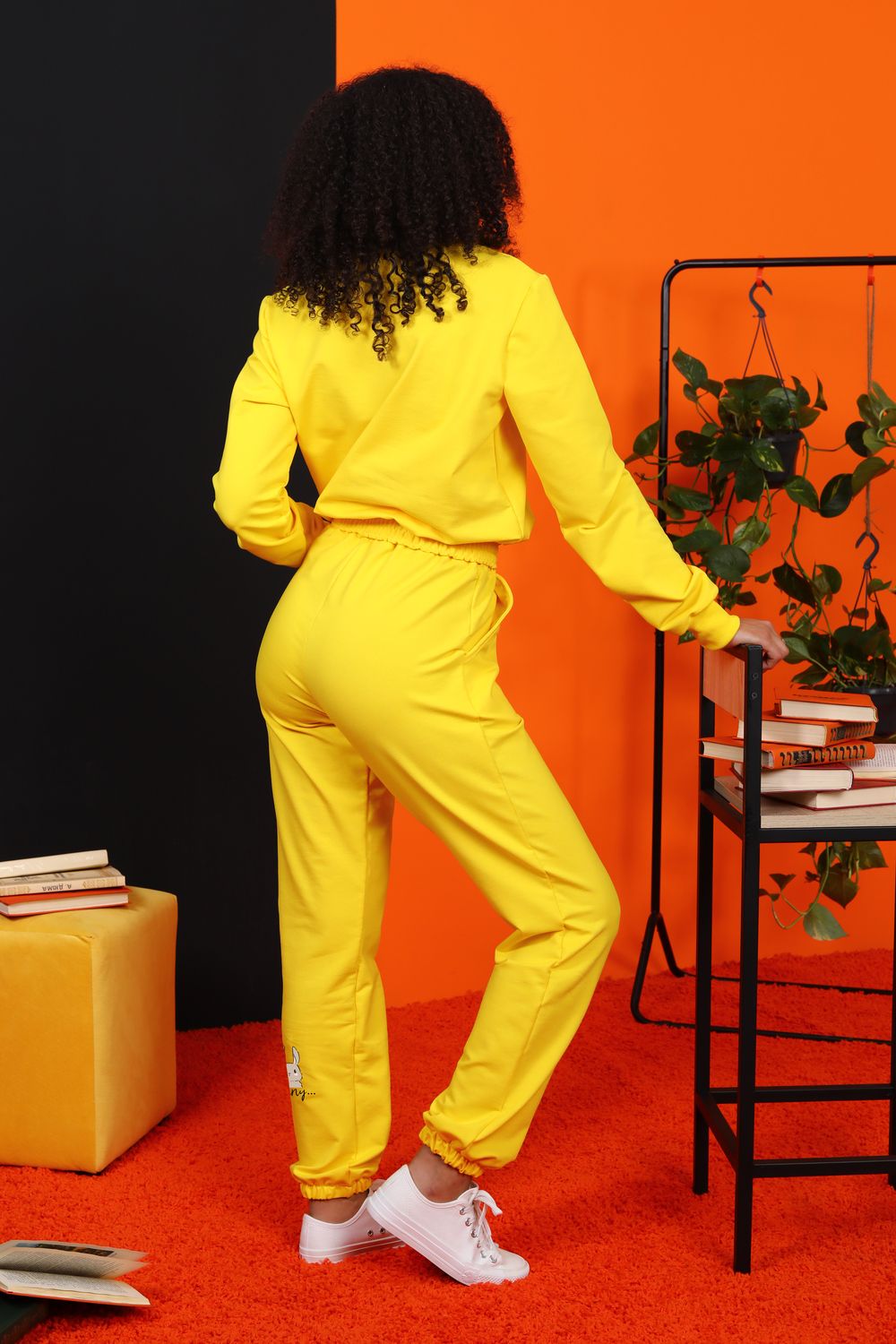 Костюм женский для повседневной носки. Данная модель выполнена из трикотажного полотна футер 2-х нитка. Толстовка с втачным рукавом. На полочке присутствует маленьким принт. Манжеты на рукавах и горловина выполнены из эластичного трикотажного полотна кашкорсе. Пояс на толстовке и брюках выполнены из основной ткани под поясную машинку (отделочная тройная строчка). Брюки имеют по бокам карманы, принт на задней детали. По низу брюк вшита резинка 2,5 см.