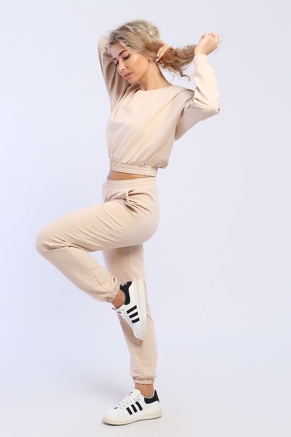 Костюм женский для повседневной носки. Данная модель выполнена из трикотажного полотна футер 2-х нитка. Толстовка свободного покроя с втачным рукавом. Манжеты на рукавах и горловина выполнены из эластичного трикотажного полотна кашкорсе. Пояс на толстовке и брюках выполнены из основной ткани под поясную машинку (отделочная тройная строчка). Брюки имеют по бокам карманы. По низу брюк вшита резинка 2,5 см.