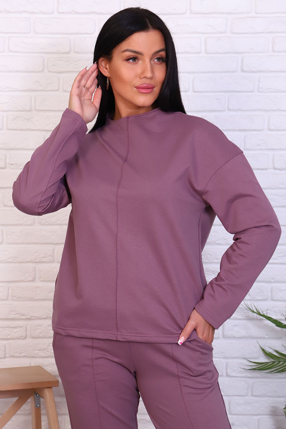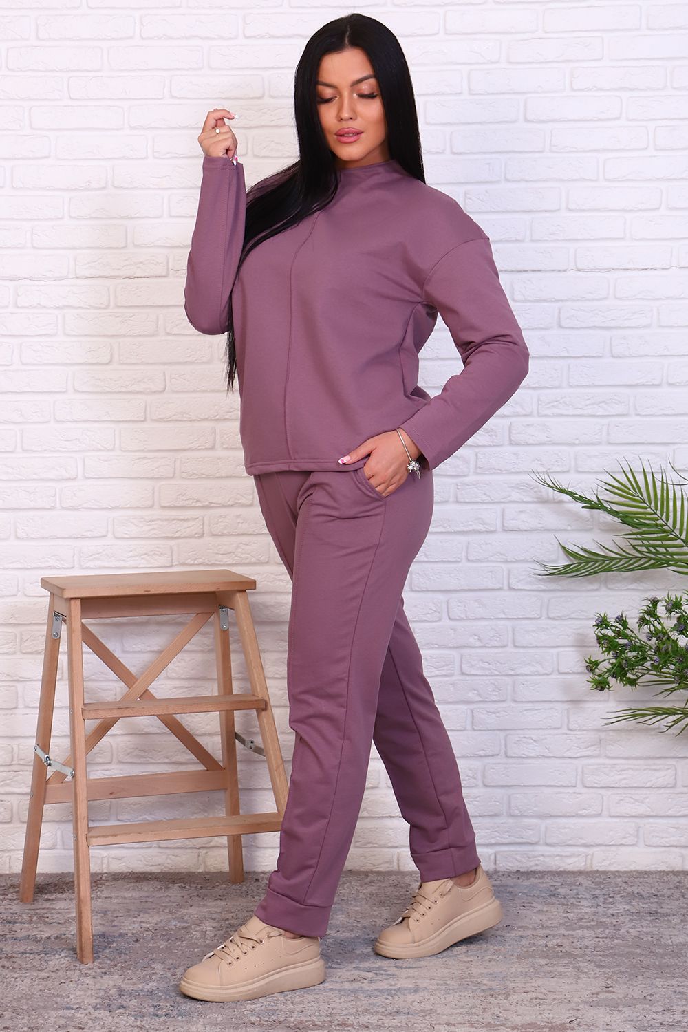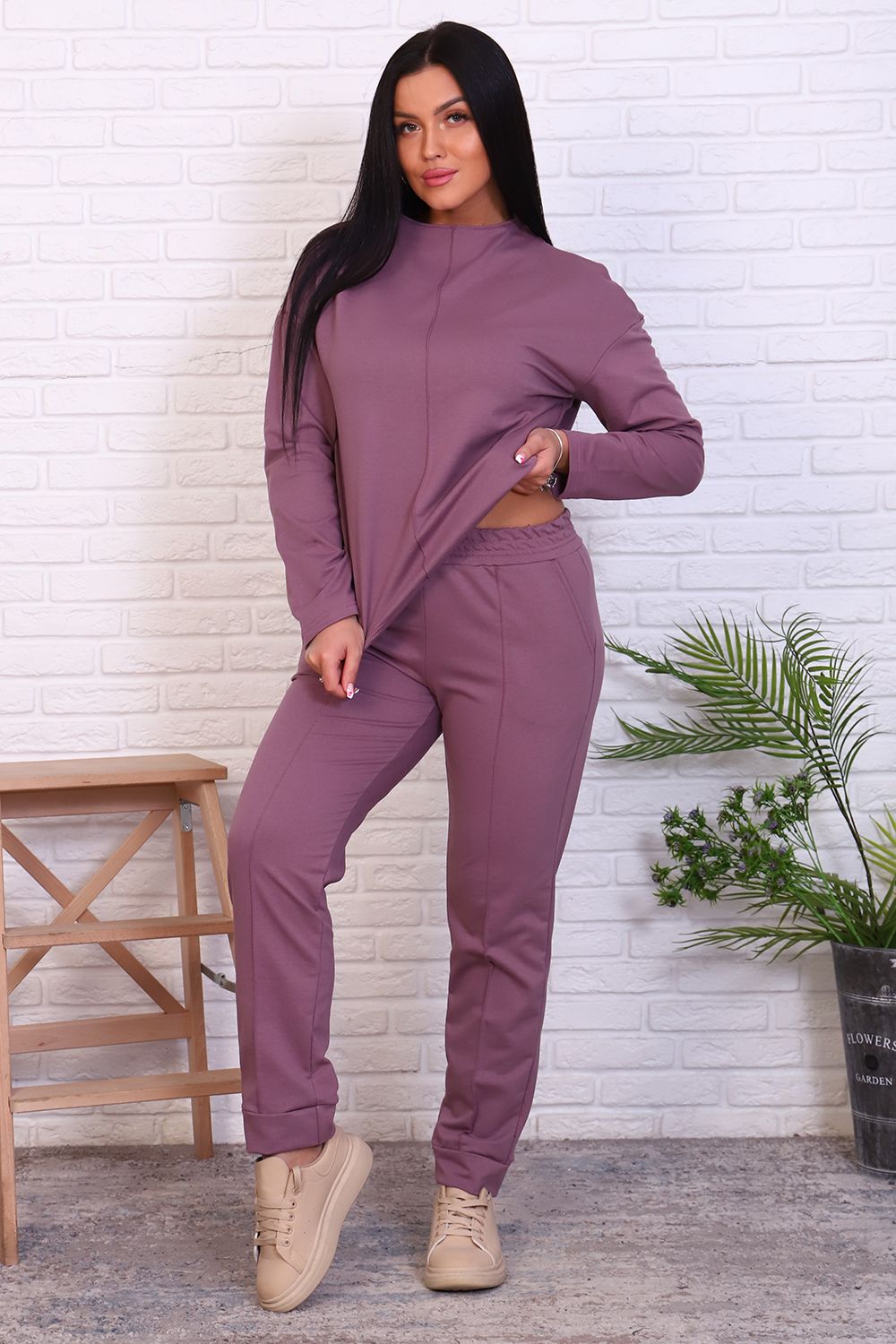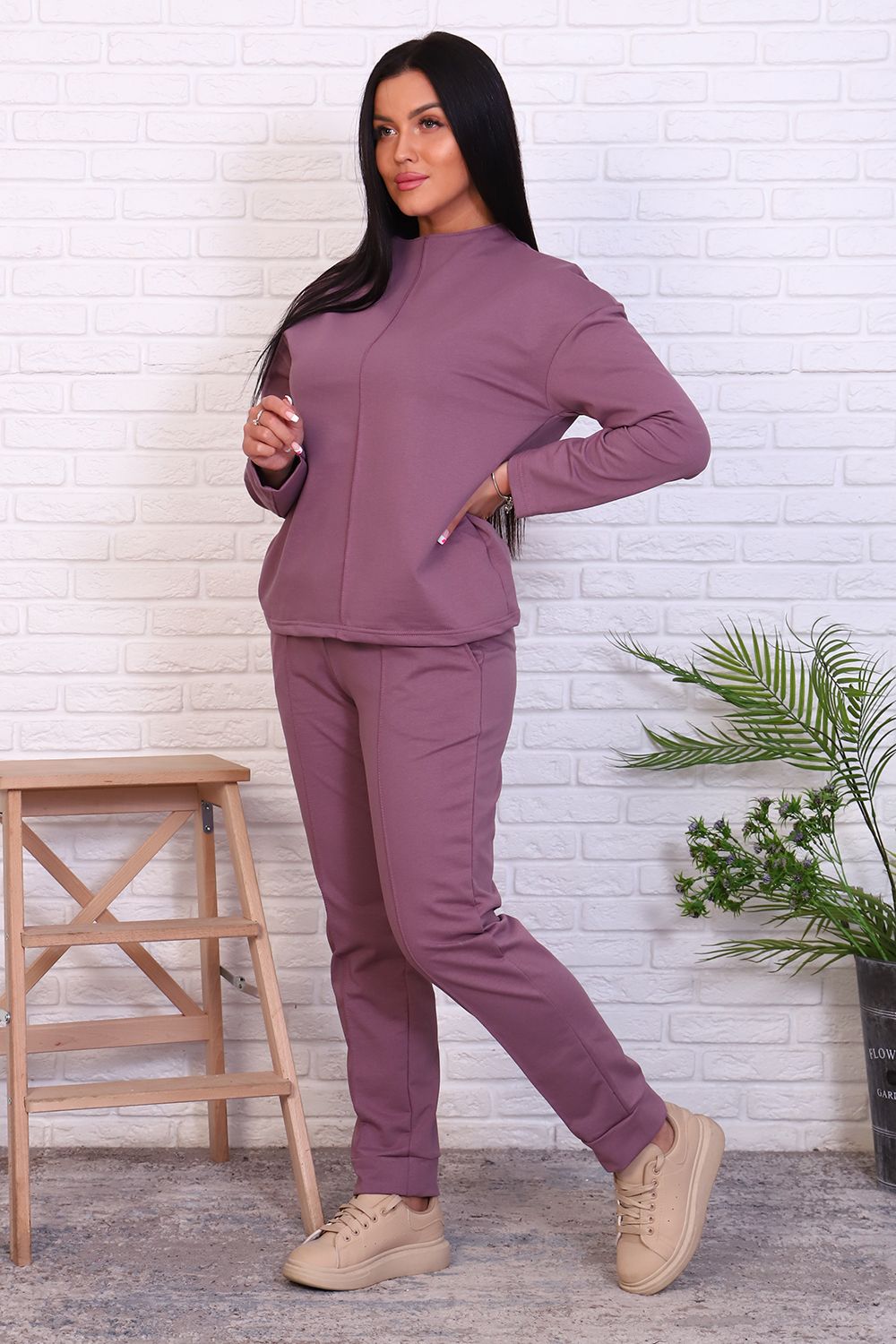 Стильный базовый костюм из хлопкового трикотажа отличного качества. Брюки прямого кроя, зауженные к низу, высокая посадка с простроченными стрелками, низ без резинки(не режет ногу), карманы в швах. Трикотажный джемпер длиной до середины бедра. По центру переда декоративный вертикальный защип вытягивает и стройнит. Горловина джемпера с цельнокроеной стойкой, обработана притачной обтачкой. Рукава джемпера длинный двухшовный, рубашечного кроя, линия плеча спущена. Полные размеры