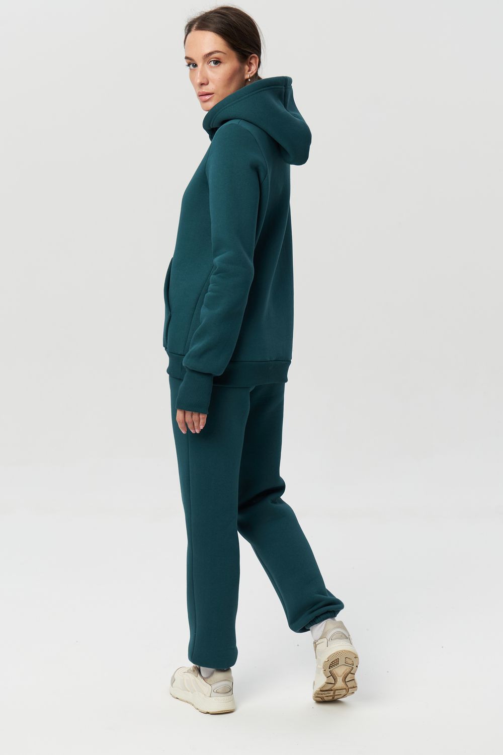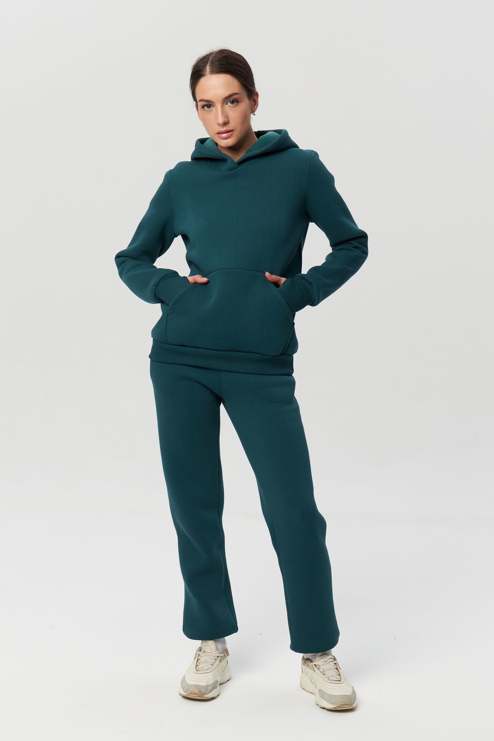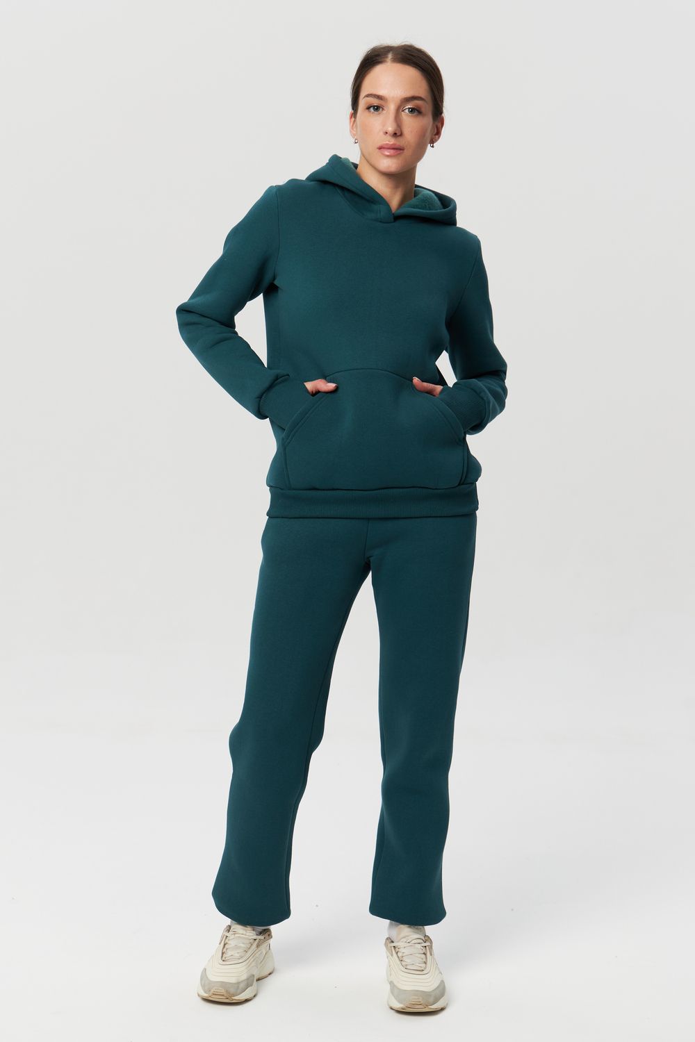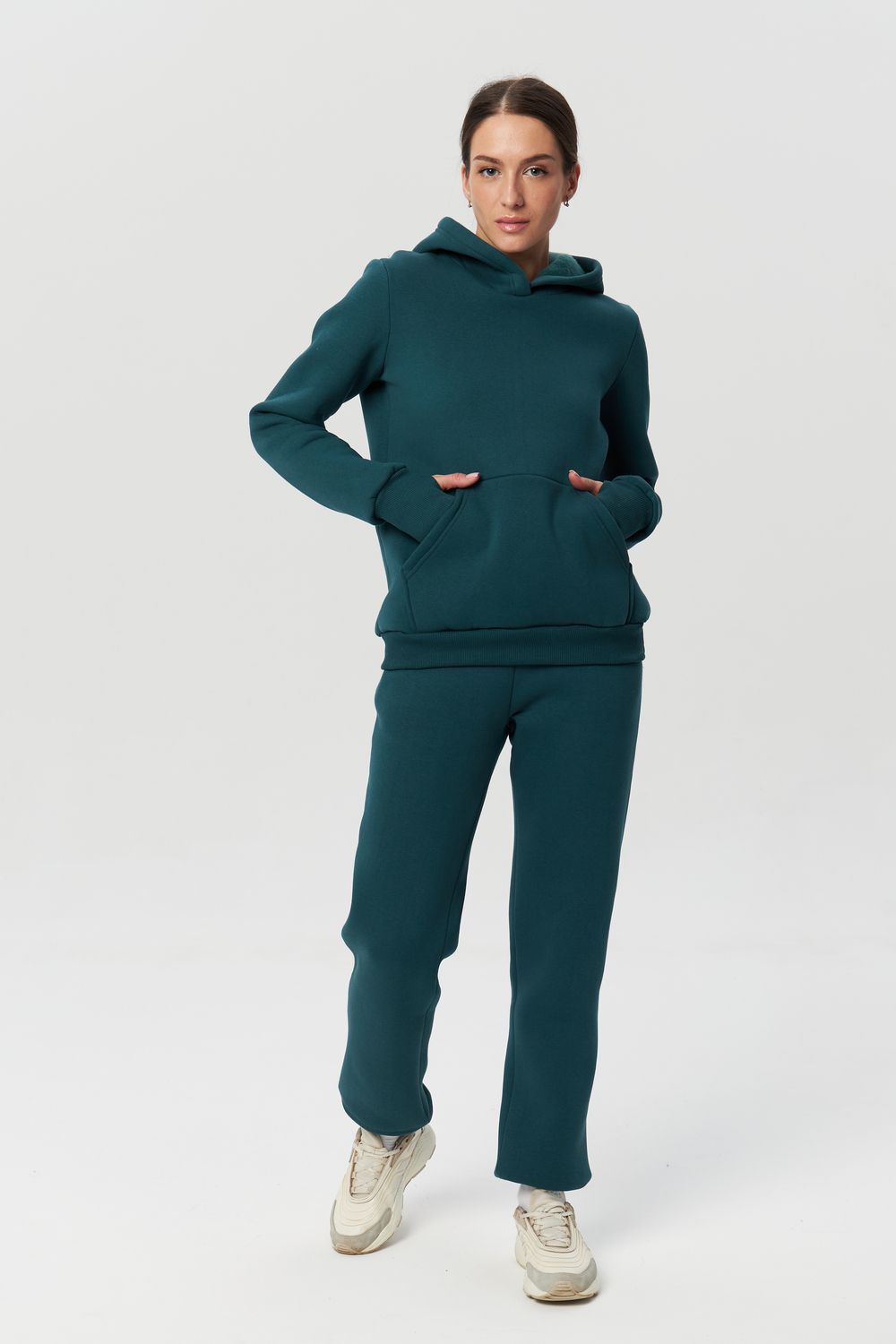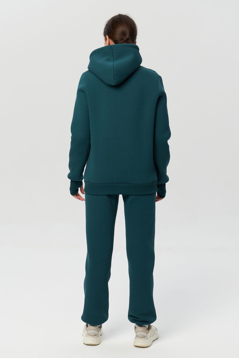 Костюм с начёсом - прекрасный вариант повседневной одежды для осени и зимы. Толстовка прямого кроя, имеет классическую пройму с втачным рукавом и удлиненными манжетами с отверстием для большого пальца, карман кенгуру. Капюшон однослойный, он прекрасно защитит голову в прохладную погоду. Брюки на резинке, с боковыми наклонными карманами, по низу штанины вшита внутрь резинка.